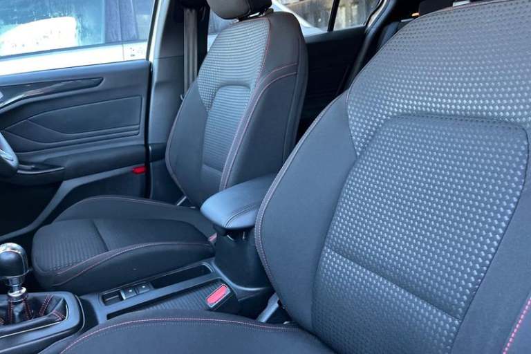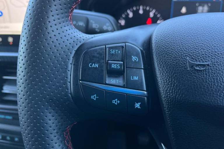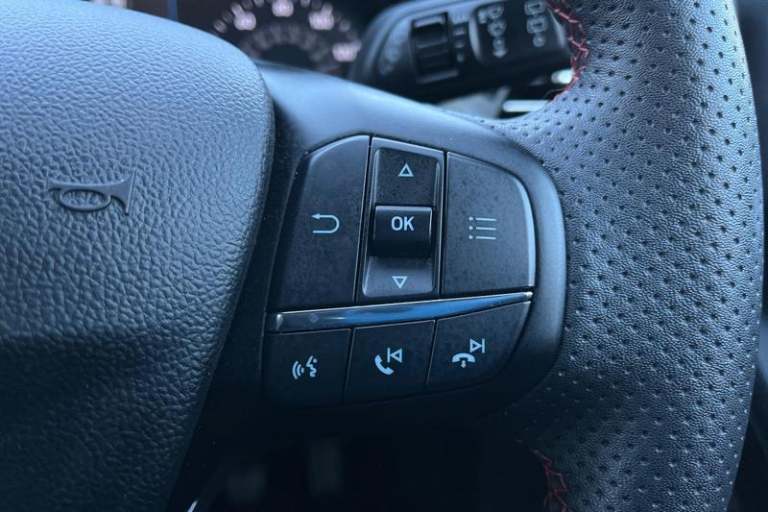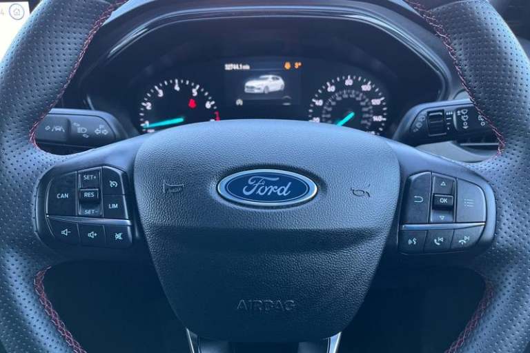 4.2 Colour TFT Ice blue illumination analogue cluster with trip computer, Bluetooth system, Digital clock, Easy fuel capless refuelling system, Eco mode, Ford SYNC 4 Navigation with 13.2'' touchscreen, DAB radio, Emergency Assistance, Apple Carplay & Android Auto, 6 speakers & FordPass Connect, Lane keeping system - lane keeping alert and lane keeping aid, PAS, Rev counter, Selectable drive mode, Service interval indicator, Auto headlamps (on/off), Body coloured door handles, Electrically operated front and rear windows with one touch opening and closing, Electrically operated heated power fold door mirrors with puddle lamp with side indicators, Front variable intermittent wipers with electric wash, Full fixed LED headlamps, Heated rear window, LED daytime running lamp, LED rear lamps, LED third brake light, Polished twin tailpipe, Privacy glass, Quickclear heated windscreen, Rain sensor, Rear side wing doors, Tailgate wash/wipe, Unique ST-Line grille, full bodystyling kit, and large body coloured rear spoiler, 3 rear headrests, 3 seat bench in 2nd row, Cloth upholstery, Dual zone electronic air temperature control, Height adjustable front headrests, Isofix child seat preparation, Reach + rake adjustable steering column, Single front passenger seat, 3x3 point rear seatbelts, ABS+Electronic Brake force Distribution, Auto hold function, Driver airbag, EDL traction control, Electronic parking brake, Electronic stability control, Front and rear seatbelt reminder, Front inertia