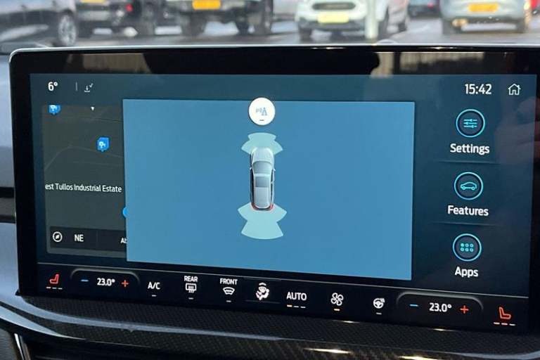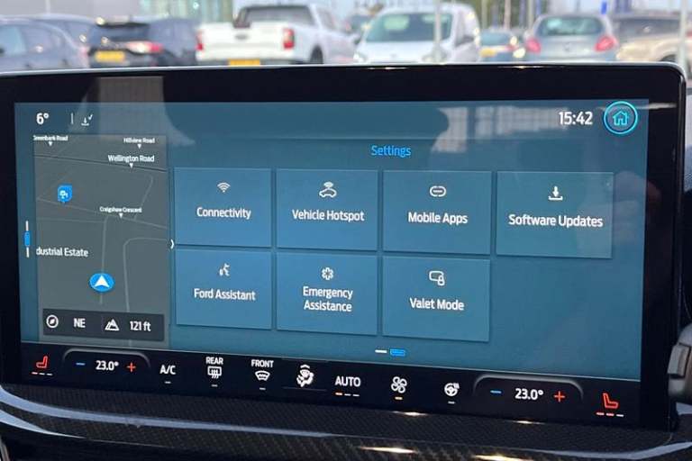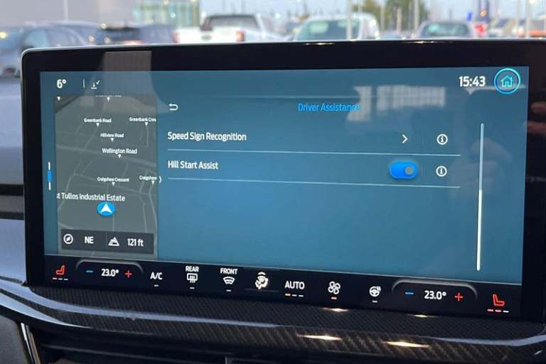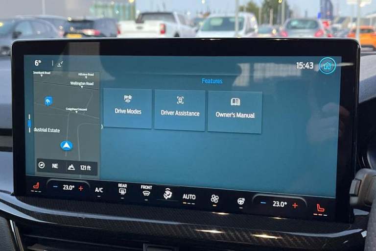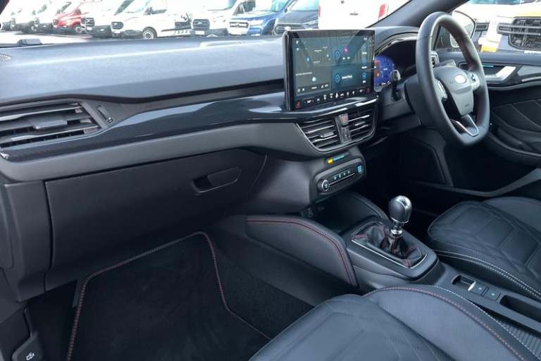 12.3 Digital instrument cluster, Bluetooth system, Digital clock, Easy fuel capless refuelling system, Eco mode, Ford SYNC4 Nav with 13.2'' touchscreen, DAB, Emergency Assistance, Apple Carplay & Android Auto, B&O Premium Audio with 10 speakers, FordPass Connect, Lane keeping system - lane keeping alert and lane keeping aid, PAS, Rev counter, Selectable drive mode, Service interval indicator, Trip computer, Wireless charging pad, Auto headlamps (on/off), Body coloured door handles, Electrically operated front and rear windows with one touch opening and closing, Electrically operated heated power fold door mirrors with puddle lamp with side indicators, Front variable intermittent wipers with electric wash, Heated rear window, LED daytime running lamp, LED rear lamps, LED third brake light, Polished twin tailpipe, Privacy glass, Quickclear heated windscreen, Rain sensor, Rear side wing doors, Tailgate wash/wipe, Unique ST-Line grille, full bodystyling kit, and large body coloured rear spoiler, 3 rear headrests, 3 seat bench in 2nd row, Dual zone electronic air temperature control, Full sensico premium upholstery, Height adjustable front headrests, Isofix child seat preparation, Load through ski hatch, Manual 4-way passenger seat adjusts, Power 4-way driver seat adjust, with power lumbar adjust, Reach + rake adjustable steering column, Single front passenger seat, 3x3 point rear seatbelts, ABS+Electronic Brake force Distribution, Auto hold function, Driver airbag, EDL traction