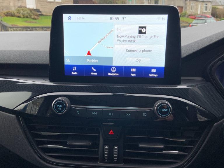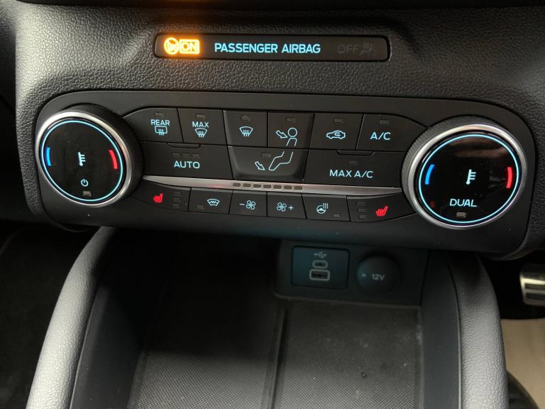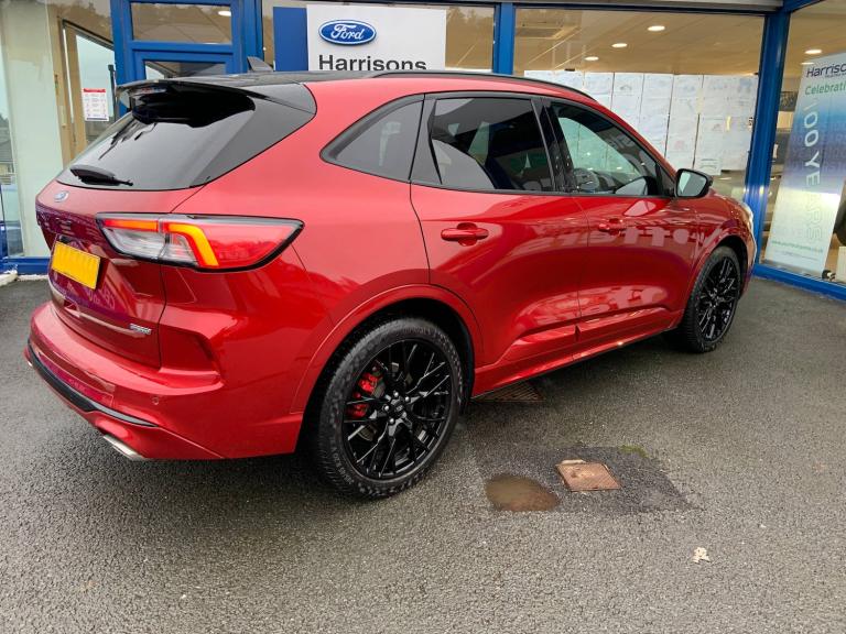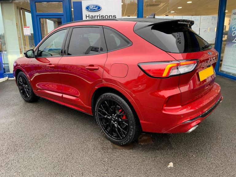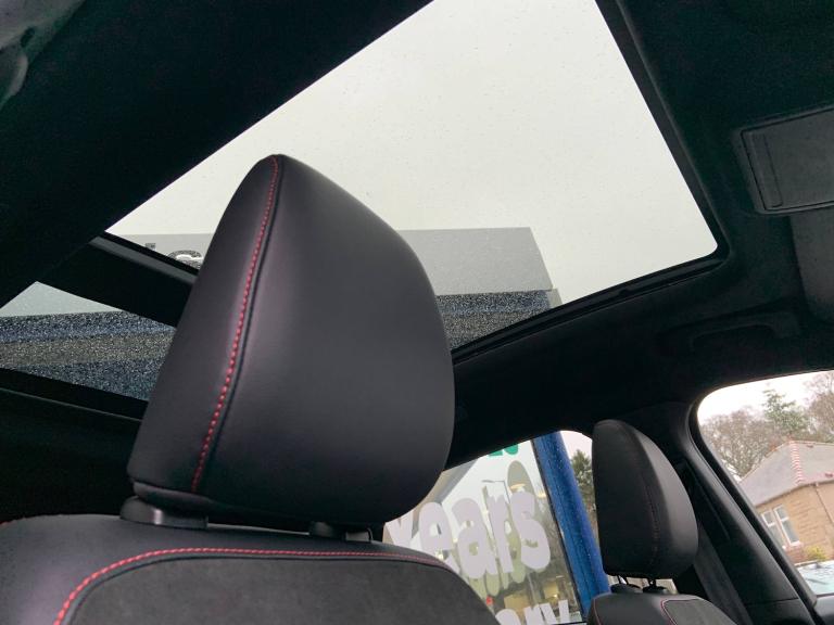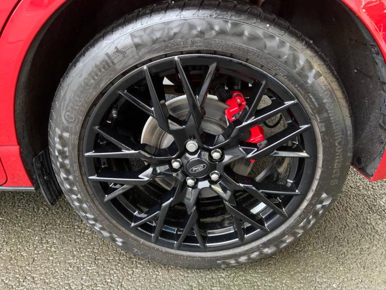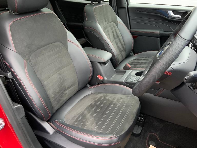 3x3 point rear seatbelts, Airbags - front driver/passenger, front and rear curtain, Drivers knee airbag, Electronic stability control (ESC) and ABS, Ford MyKey Gen 2 safety system, Manual child proof rear door locks, Post collision braking, Pre collision assist with autonomous emergency braking, Rear seat Occupancy alert, Red brake calipers, Tyre pressure monitoring system, 12.3 inch digital colour instrument cluster, Cruise control with adjustable speed limiter, Ford easy fuel, Ford SYNC 3 with 8 inch TFT LCD touchscreen, App Link, andriod auto/apple carPlay, emergency assistance and navigation with Ford pass connect, Front and rear parking sensors, Hands free power tailgate, Lane keeping aid with lane departure warning, Power assist steering, Rear view camera, Selectable drive modes, Service interval indicator, Auto headlamps with high and low beam, Black roof rails, Body colour bumpers, Day/night rear view mirror, Front LED fog lamps, Full LED headlamps, Large rear roof spoiler, LED daytime running lights, LED rear lights, Power folding, electrically adjustable and heated door mirrors with puddle lights, Power front/rear windows with global close, Power opening panoramic roof, Quickclear heated windscreen, Rain sensing wipers, Rear privacy glass, Rear side wing doors, Rear wiper, Solid paint, ST Line front scuff plates, Third brake light, Twin exhausts, 10 way power adjustable drivers seat, 8 way manual passenger seat including lumbar support and height adjust, Alloy pedals, Centre console with electronic parking brake, Dark headlining and pillars, Electronic automatic temperature control (EATC), Flat bottomed leather steering wheel in sensico with red stitching, Front and rear head restraints, Heated passenger and driver seats, Heated rear seats, Heated steering wheel, Partial premium touch Sensico with black cloth inserts and red stitching, Rear centre head restraint, Single front passenger seat, Sports seats, ST Line front and rear floor mats, ST-Line body styling kit with black body styling elements pack, Sports suspension, Twist beam rear suspension, Engine immobiliser, Keyless entry and Ford power start button (Keyless start), Locking wheel nuts, Remote powered central double locking doors, Thatcham category 1 alarm, BandO premium audio system with 10 speakers and subwoofer, 2 USB ports, DAB radio/CD, 20 inch Black Ford performance alloy wheels, Tyre inflation kit