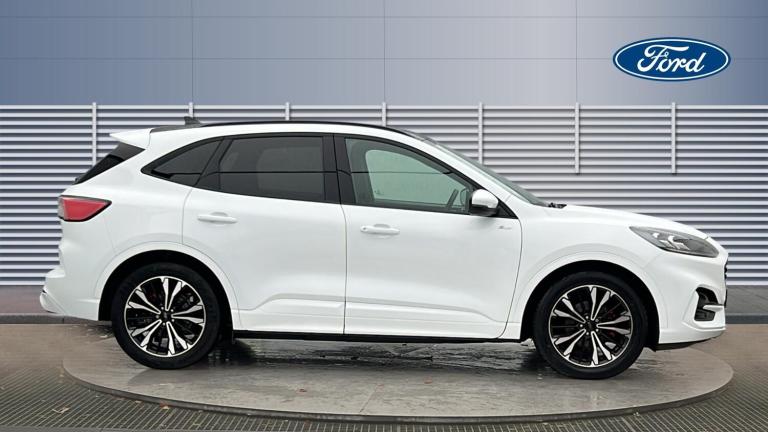 Gloucester Ford have this Ford Kuga 2.5 FHEV ST-Line X Edition CVT finished in frozen White. This Kuga 2.5 FHEV ST-Line X Edition in Frozen White is a standout choice for drivers seeking a perfect blend of efficiency, style, and advanced technology. Its full hybrid powertrain delivers smooth, quiet performance with impressive fuel economy, making every journey both enjoyable and economical. Paired with the seamless CVT transmission, the Kuga feels responsive and refined, whether navigating busy city streets or cruising on the motorway. The ST-Line X Edition adds an unmistakably sporty presence, with sleek body styling, athletic lines, and premium touches that elevate its road presence. The Frozen White exterior finish enhances its sharp design, giving the Kuga a clean, modern, and sophisticated look that shines in any light. This edition also brings upgraded interior features that make driving more comfortable and enjoyable, offering a premium environment for both driver and passengers. Inside, the SYNC 3 infotainment system provides intuitive connectivity, keeping you in control with seamless smartphone integration, voice commands, and a crisp touchscreen interface. Convenience and safety are further enhanced with front and rear parking sensors, alongside a clear and reliable rear-view camera that makes parking and manoeuvring effortless, even in tight spaces. The panoramic roof is another standout feature, flooding the cabin with natural light and creating a spacious, airy atmosphere that passengers love. It adds a sense of openness and luxury, perfect for scenic drives or simply enhancing everyday travel. Overall, the Ford Kuga 2.5 FHEV ST-Line X Edition offers a compelling combination of hybrid efficiency, stylish design, advanced technology, and everyday practicality. It’s a vehicle that delivers confidence, comfort, and excitement, an ideal choice for drivers who want performance and sustainability without compromising on style or features..Air Conditioning, Climate Control, Cruise Control, Satellite Navigation, Alloy Wheels, Heated Seats, DAB Radio, Bluetooth, Panoramic Roof, Parking Sensors, Heated Front Windscreen, USB, Sun Roof, Diamond Cut Alloy Wheels, Keyless Entry-Push Button Start, Apple-Android Play, Rear Camera, Electric Opening Tailgate, Auto Lights, Electric Folding Mirrors, Lane Departure, Lane Keeping Assist& Rain Sensors, ST Line front and rear floor mats, Quickclear heated windscreen, Power front/rear windows with global close, Rear wiper, Rear privacy glass, Rain sensing wipers, Electronic stability control (ESC) and ABS, Red brake calipers, Post collision braking, Sports suspension, Twist beam rear suspension, Selectable drive modes, Pre collision assist with autonomous emergency braking, Front and rear parking sensors, Power assist steering, Lane keeping aid with lane departure warning, Rear view camera, Ford easy fuel, Ford SYNC 3 with 8"" TFT LCD touchscreen, App Link