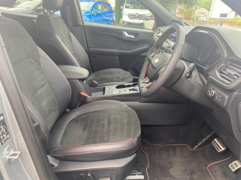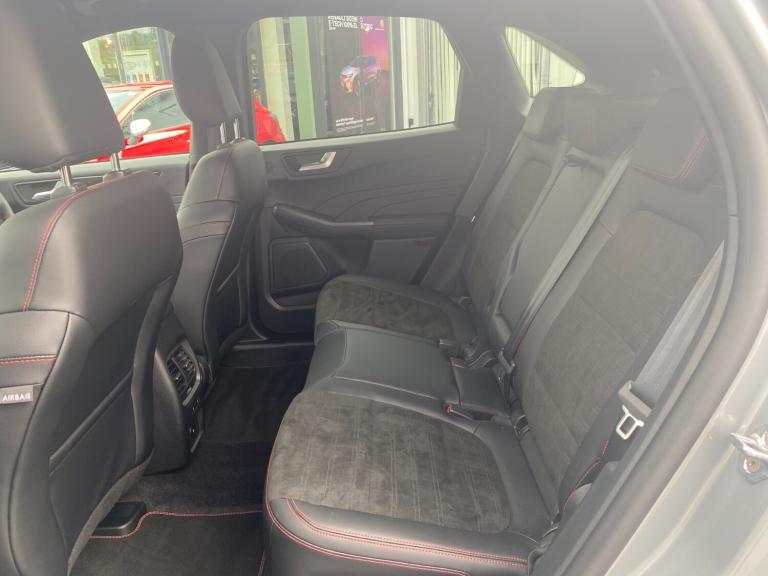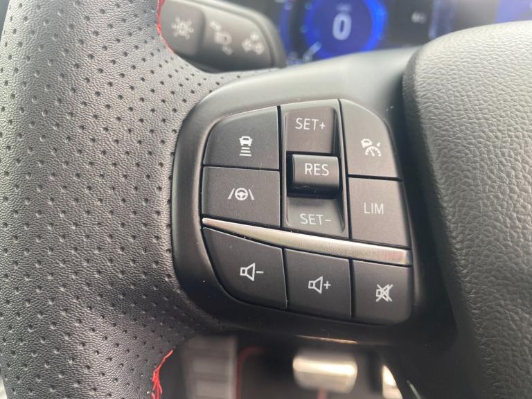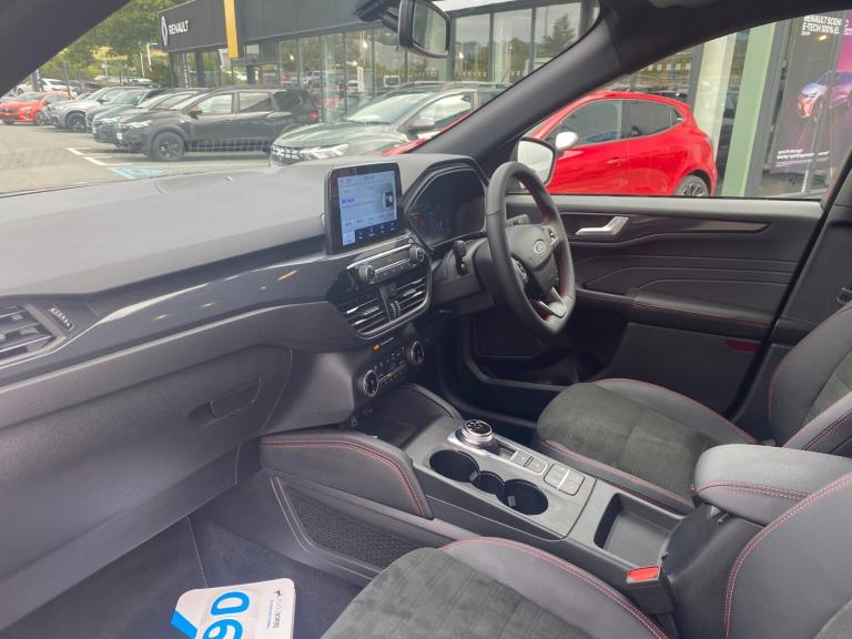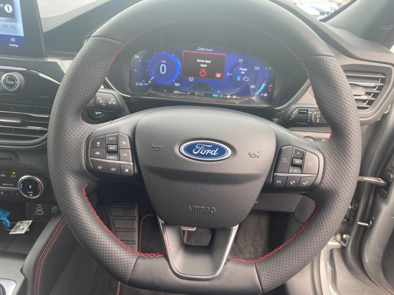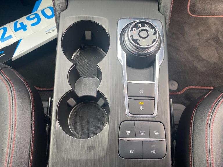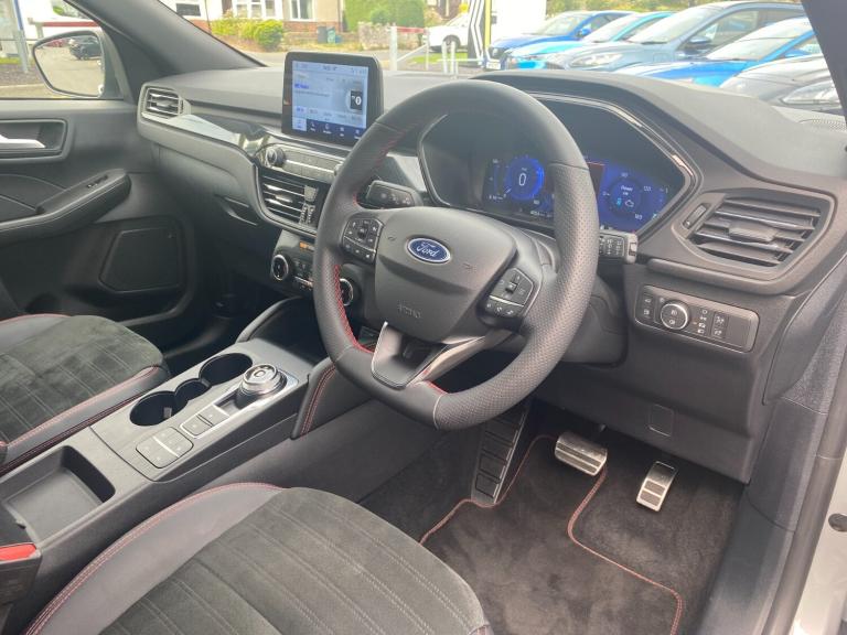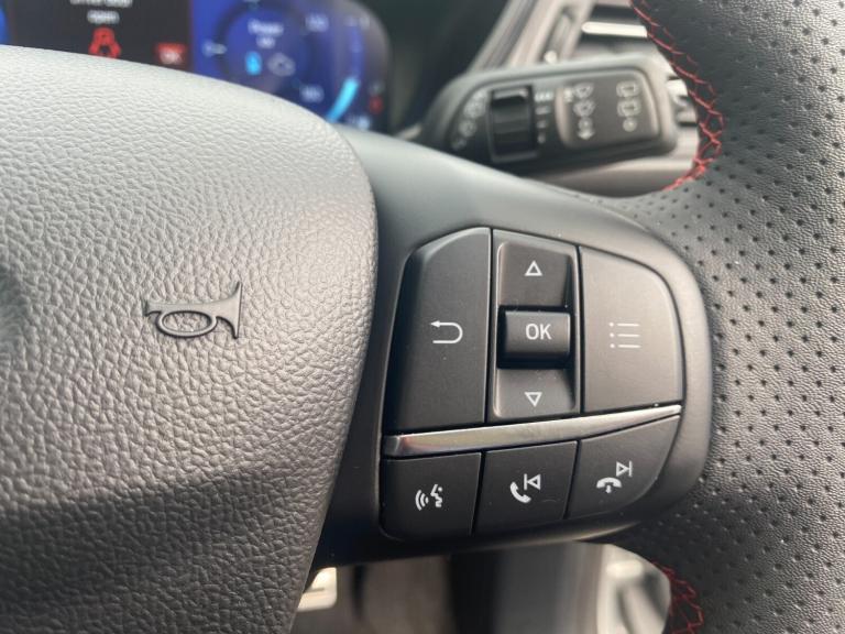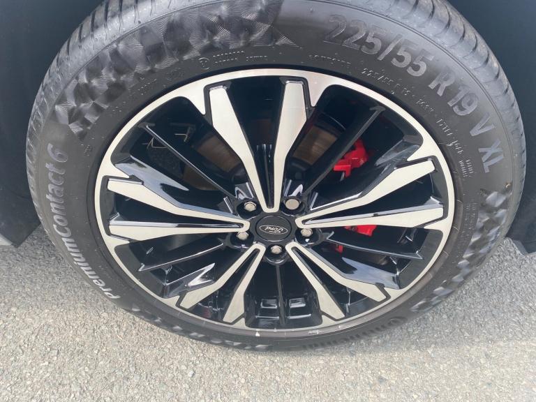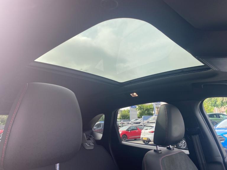 ..12.3'' digital colour instrument cluster, Ford easy fuel, Ford SYNC 3 with 8'' TFT LCD touchscreen, App Link, andriod auto/apple carPlay, emergency assistance and navigation with Ford pass connect, Front and rear parking sensors, Geo awareness, Hands free power tailgate, Lane keeping aid with lane departure warning, Power assist steering, Rear view camera, Selectable drive modes, Service interval indicator, 3-Pin Home charge cable (230V/16A Domestic socket), 3.7 kW monophase on board charger, Sports suspension, Twist beam rear suspension, B&O premium audio system with 10 speakers and subwoofer, 2 USB ports, DAB radio/CD, Auto headlamps with high and low beam, Black roof rails, Body colour bumpers, Day/night rear view mirror, Front LED fog lamps, Large rear roof spoiler, LED daytime running lights, LED rear lights, Power folding, electrically adjustable and heated door mirrors with puddle lights, Power front/rear windows with global close, Power opening panoramic roof, Quickclear heated windscreen, Rain sensing wipers, Rear privacy glass, Rear side wing doors, Rear wiper, ST Line body styling kit with unique front and rear fascia and bumper, rear painted diffuser, front painted skid plates, dark mesh upper grille, ST Line front scuff plates, Third brake light, Twin exhausts, 2nd row sliding seats with 60:40 split, Alloy pedals, Centre console with electronic parking brake, Dark headlining and pillars, Electronic automatic temperature control (EATC), Flat bottomed leather steering wheel in sensico with red stitching, Front and rear head restraints, Heated passenger and driver seats, Heated rear seats, Heated steering wheel, Partial premium touch Sensico with black cloth inserts and red stitching, Rear centre head restraint, Single front passenger seat, Sports seats, ST Line front and rear floor mats, 3x3 point rear seatbelts, Airbags - front driver/passenger, front and rear curtain, Drivers knee airbag, Electronic stability control (ESC) and ABS, Ford MyKey Gen 2 safety system, Manual child proof rear door locks, Post collision braking, Pre collision assist with autonomous emergency braking, Rear seat Occupancy alert, Red brake calipers, Tyre pressure monitoring system, Engine immobiliser, Keyless entry and Ford power start button, Locking wheel nuts, Remote powered central double locking doors, Thatcham category 1 alarm