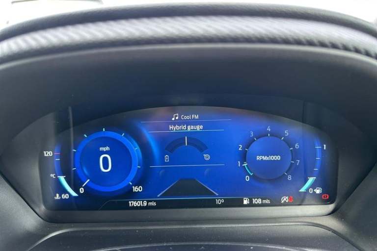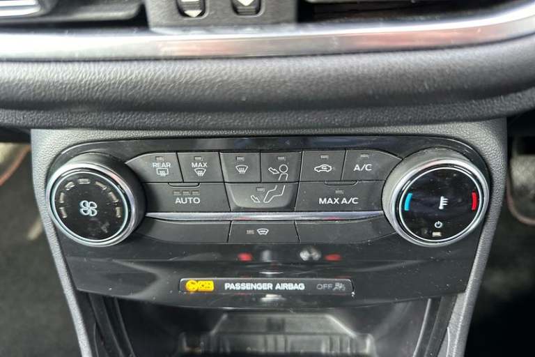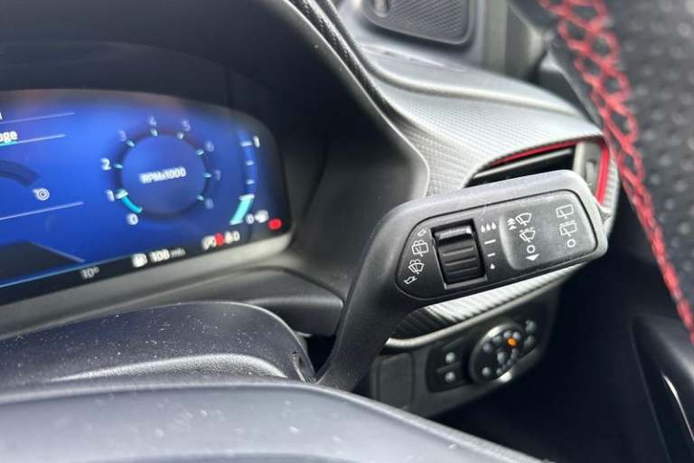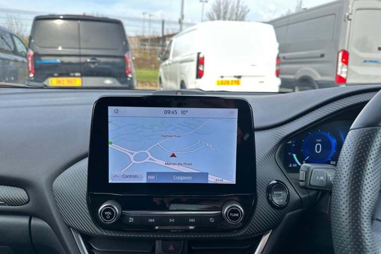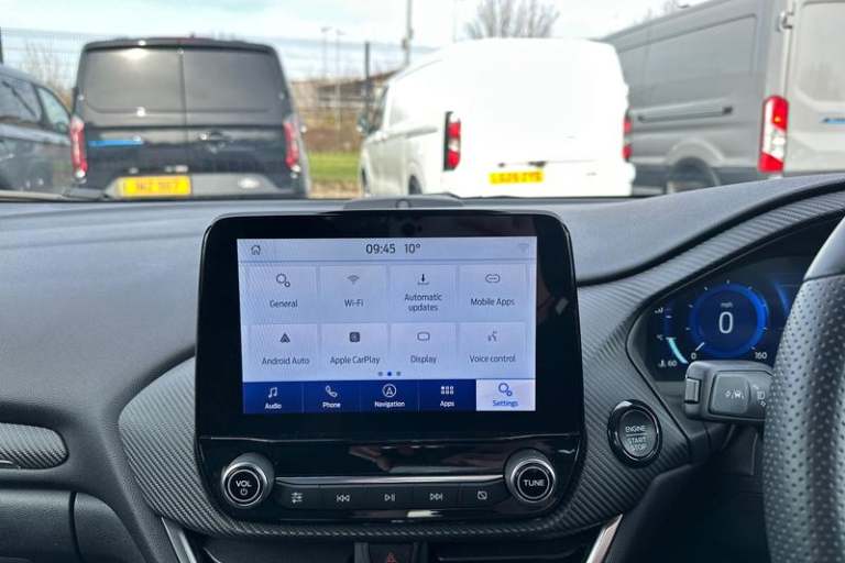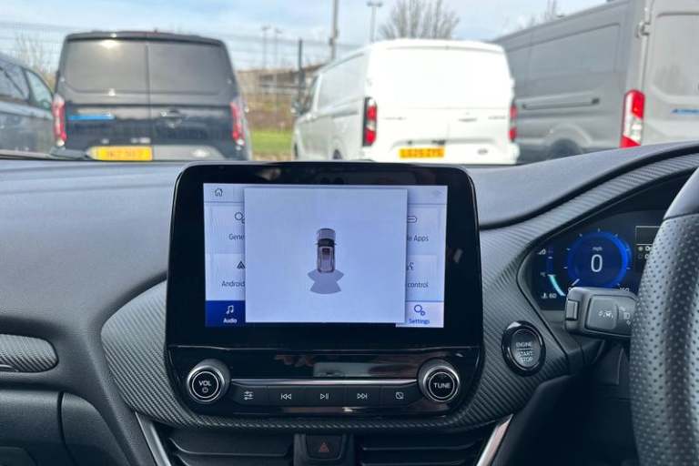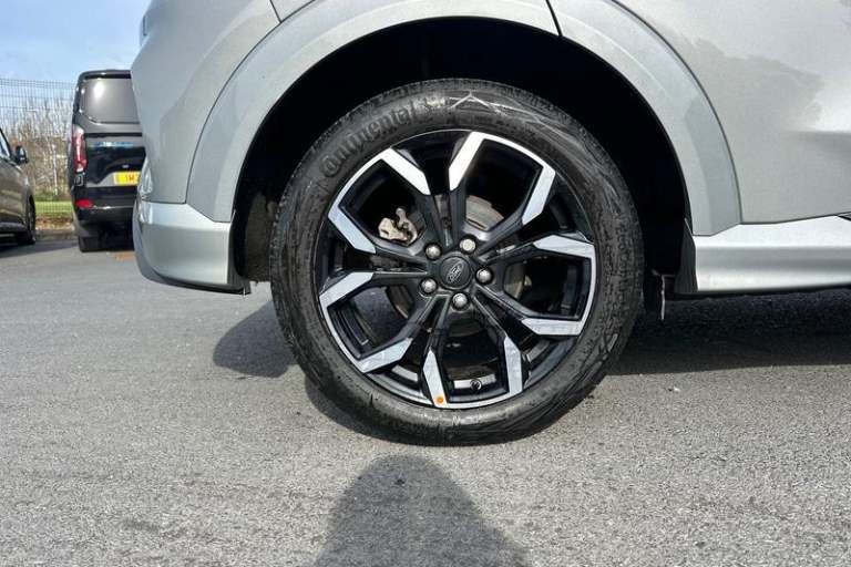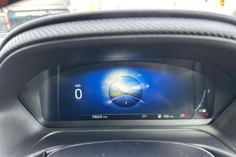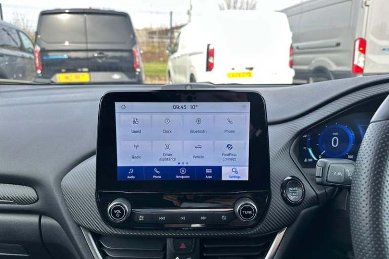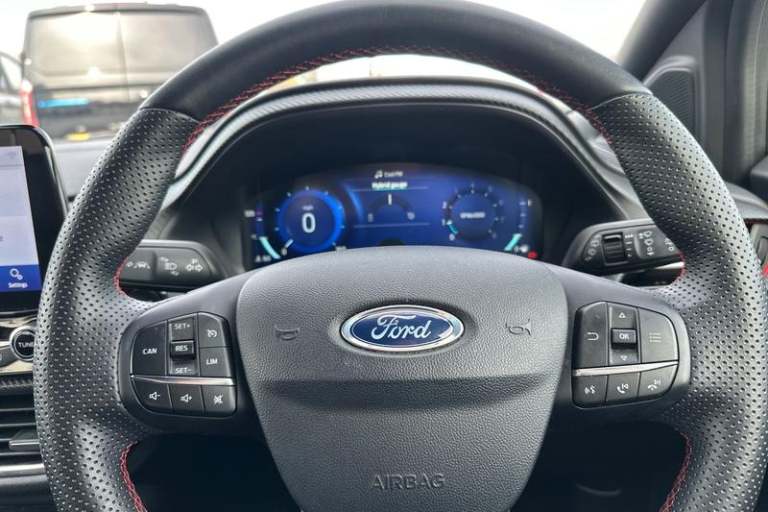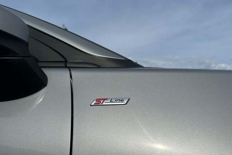 Driver impairment monitor, Emergency call service, Ford easy fuel, Full digital 12.3 instrument cluster, Lane keeping aid with lane departure warning, Power assist steering, Power start button, Rear parking sensor, Selectable drive modes(Normal, Eco, Sport, Slippery and Trail), Speed sign recognition, Automatic headlights with auto high beam, Automatic rain sensing wipers, Front fog lamps, LED daytime running lights, LED rear lamps, Power foldable heated door mirrors with puddle lamps, Privacy glass to side rear windows and tailgate glass, Quickclear heated windscreen, Rear side wing doors, Rear wiper, ST-Line body styling kit with unique grille, Third brake light, 3 seat bench in 2nd row, Centre console with armrest and stowage, Ford megabox extended bootspace, Front and rear head restraints, Front floor mats, Manual 4 way driver seat adjust with lumbar adjustment, Manual 4 way passenger seat with lumbar seat adjustment, Sensico partial premium upholstery, Single front passenger seat, ST-Line flat bottomed sensico leather steering wheel with leather handbrake and aluminium gear knob, Wireless charging pad with electronic air temperature control (EATC), 3 rear seatbelts, Child safety lock, Electronic stability control (ESC) and hill start assist, Pedestrian/cyclist detection & post-collision braking, Pre collision assist system, Tyre pressure monitoring system (TPMS)