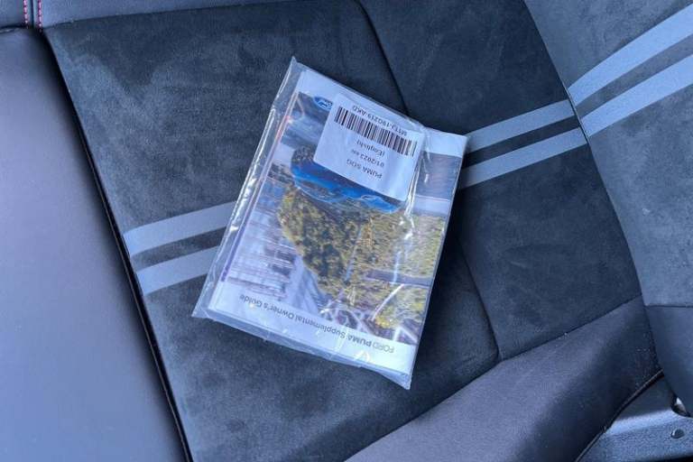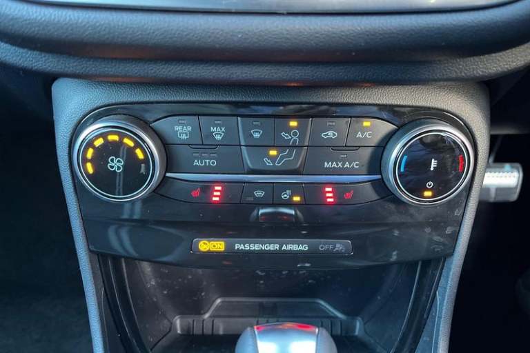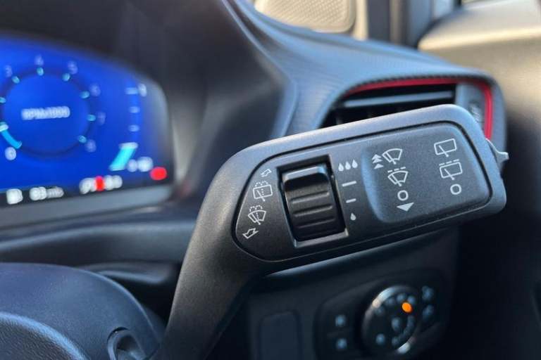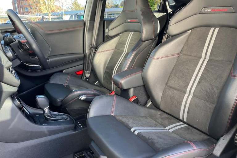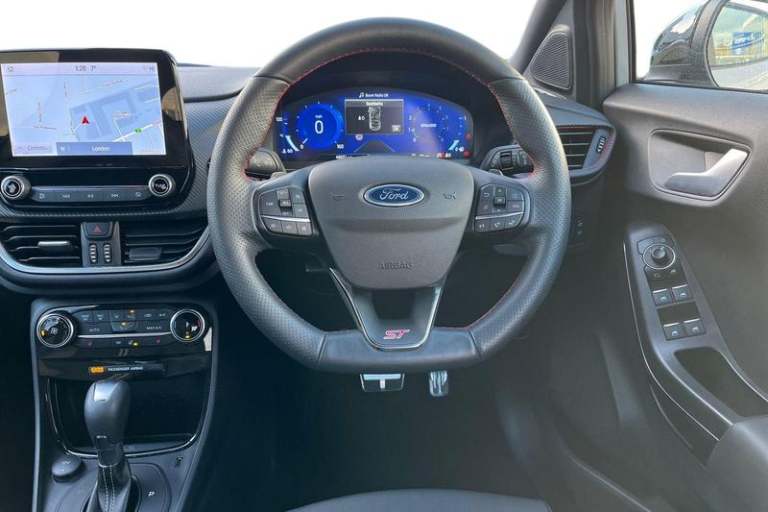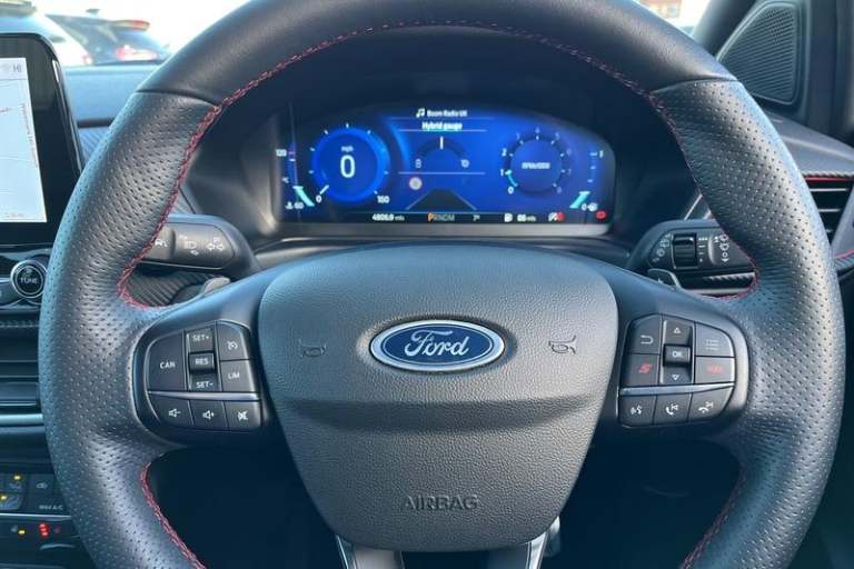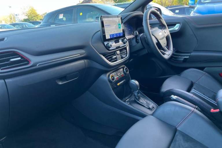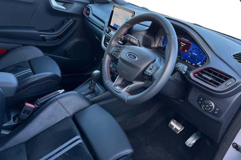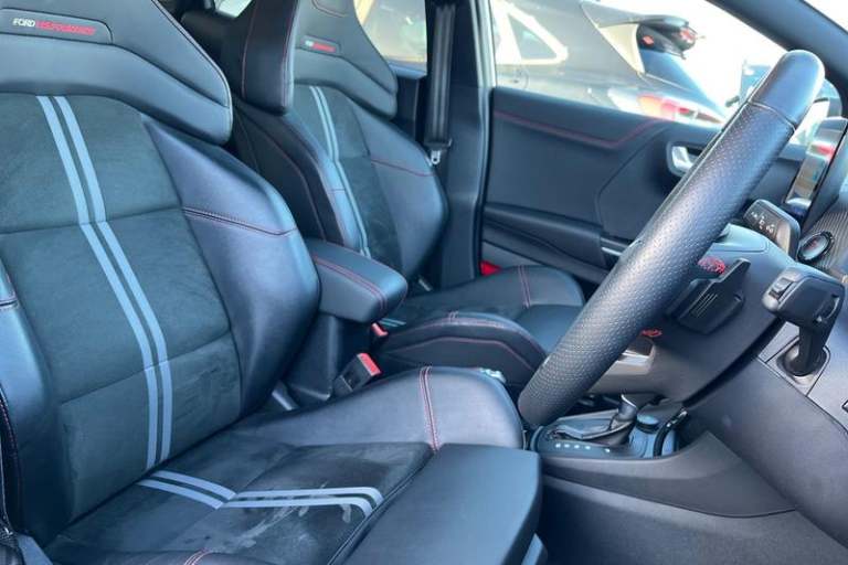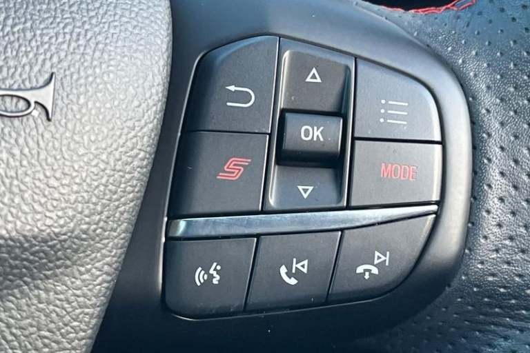 Cruise control with Intelligent speed assist, Driver impairment monitor, Emergency call service, Ford easy fuel, Front and rear parking sensors, Full digital 12.3 instrument cluster, Lane keeping aid with lane departure warning, Power assist steering, Selectable drive modes (normal, sport, eco, track), Speed sign recognition, Automatic headlights with auto high beam, Automatic rain sensing wipers, Dual chrome exhaust, Fixed LED signature headlamps, Front fog lamps, LED daytime running lights, LED rear lamps, Power foldable heated door mirrors with puddle lamps and puma logo protection, Privacy glass to side rear windows and tailgate glass, Quickclear heated windscreen, Rear side wing doors, Rear wiper, ST scuff plates, Third brake light, Unique ST body styling kit including wing mirrors and Ford Performance embossed splitter, 3 seat bench in 2nd row, Alloy sports pedals, Centre console with armrest and stowage, Ford megabox extended bootspace, Ford Performance sensico partial premium leather upholstery with metal grey stitching, Front and rear floor mats, Front and rear head restraints, Manual 6 way driver seat adjust with lumbar adjustment, Manual 6 way passenger seat with lumbar seat adjustment, Single front passenger seat, ST flat bottomed steering wheel with metal grey stitching, ST logo projection, Unique ST gear shift knob, Wireless charging pad with electronic air temperature control (EATC), 3 rear seatbelts, Child safety lock, Electronic stability control (ESC) and