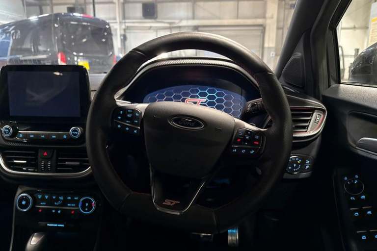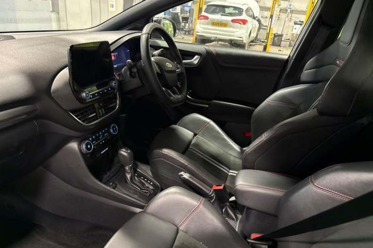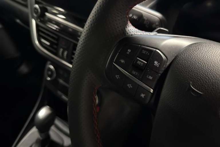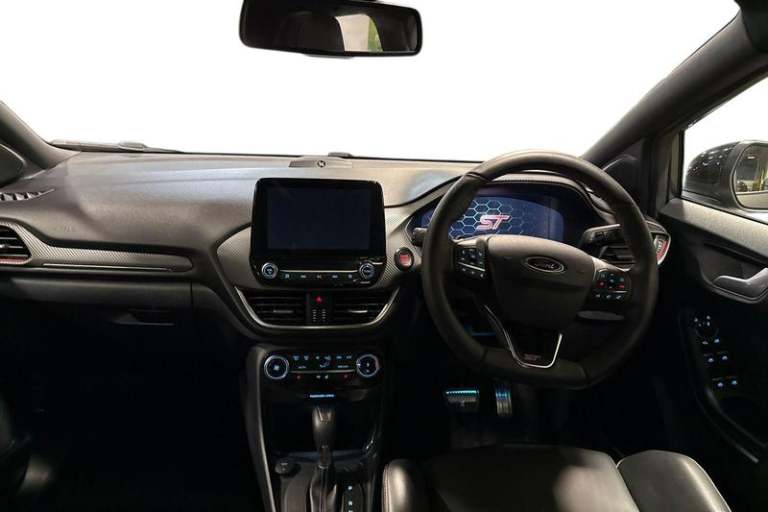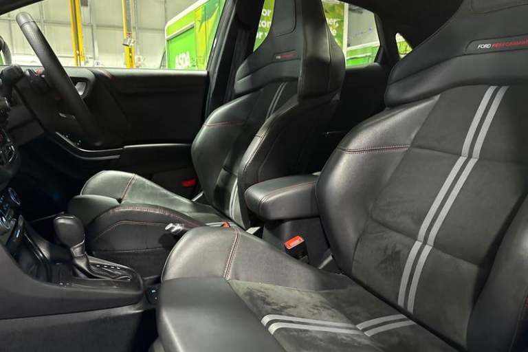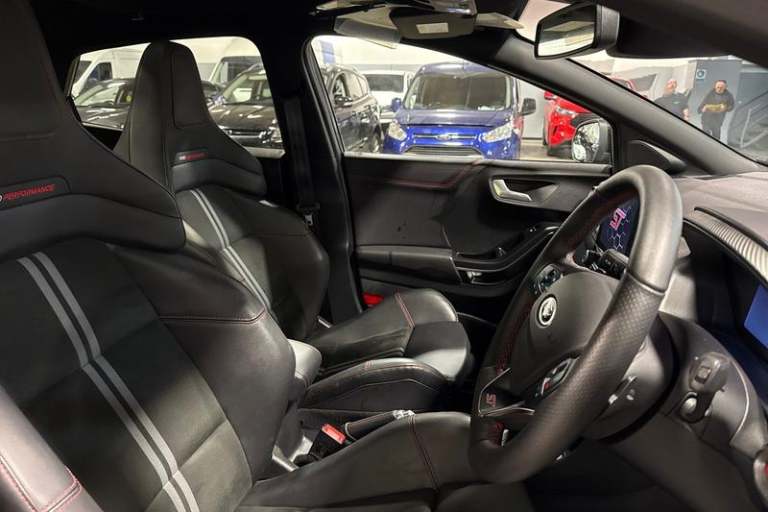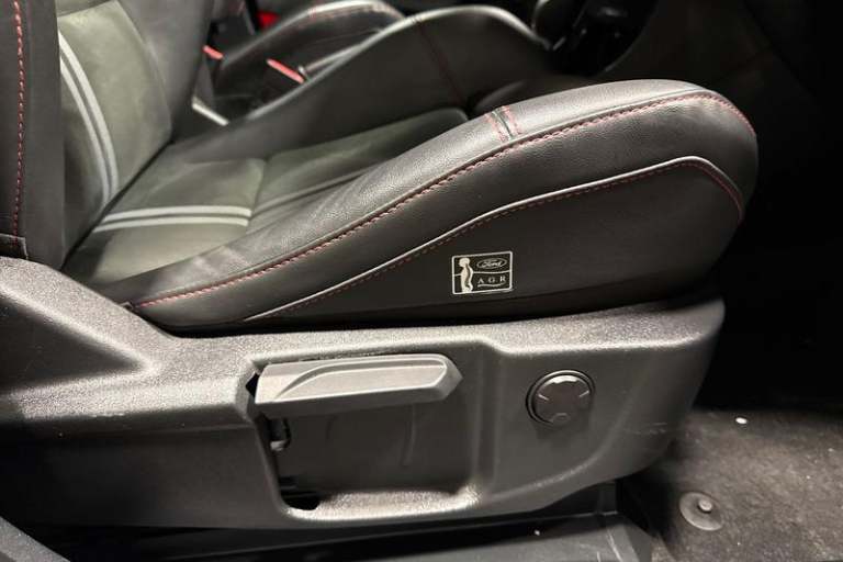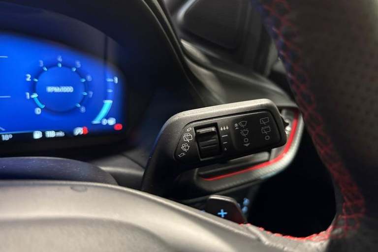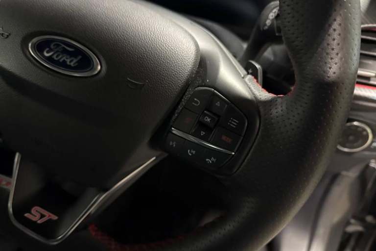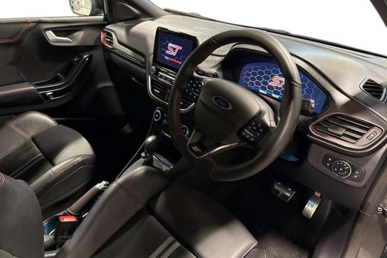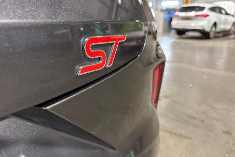 Cruise control with Intelligent speed assist, Driver impairment monitor, Emergency call service, Ford easy fuel, Front and rear parking sensors, Full digital 12.3 instrument cluster, Lane keeping aid with lane departure warning, Power assist steering, Selectable drive modes (normal, sport, eco, track), Speed sign recognition, Automatic headlights with auto high beam, Automatic rain sensing wipers, Dual chrome exhaust, Fixed LED signature headlamps, Front fog lamps, LED daytime running lights, LED rear lamps, Power foldable heated door mirrors with puddle lamps and puma logo protection, Privacy glass to side rear windows and tailgate glass, Quickclear heated windscreen, Rear side wing doors, Rear wiper, ST scuff plates, Third brake light, Unique ST body styling kit including wing mirrors and Ford Performance embossed splitter, 3 seat bench in 2nd row, Alloy sports pedals, Centre console with armrest and stowage, Ford megabox extended bootspace, Ford Performance sensico partial premium leather upholstery with metal grey stitching, Front and rear floor mats, Front and rear head restraints, Manual 6 way driver seat adjust with lumbar adjustment, Manual 6 way passenger seat with lumbar seat adjustment, Single front passenger seat, ST flat bottomed steering wheel with metal grey stitching, ST logo projection, Unique ST gear shift knob, Wireless charging pad with electronic air temperature control (EATC), 3 rear seatbelts, Child safety lock, Electronic stability control (ESC) and