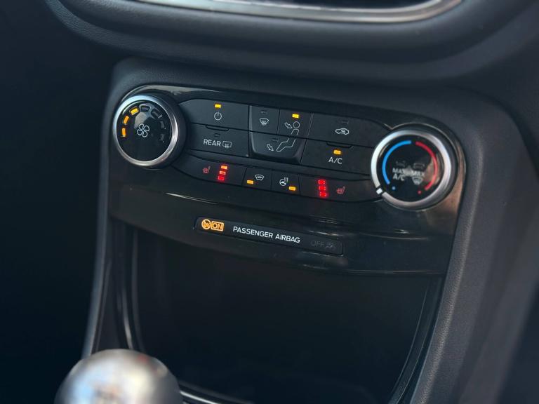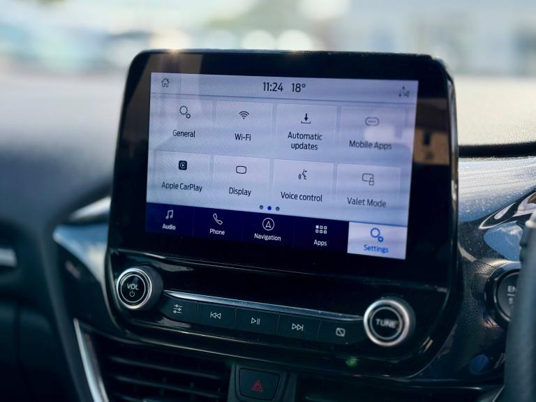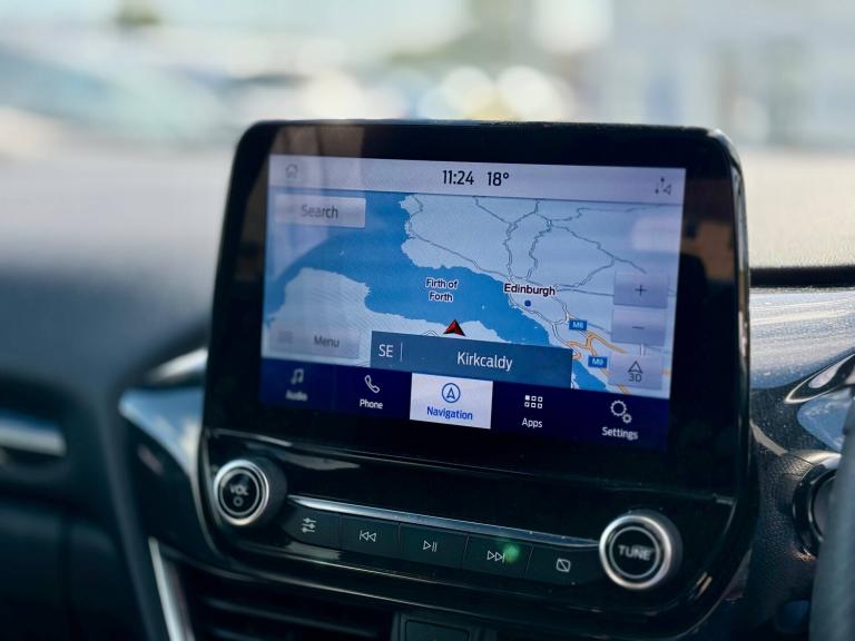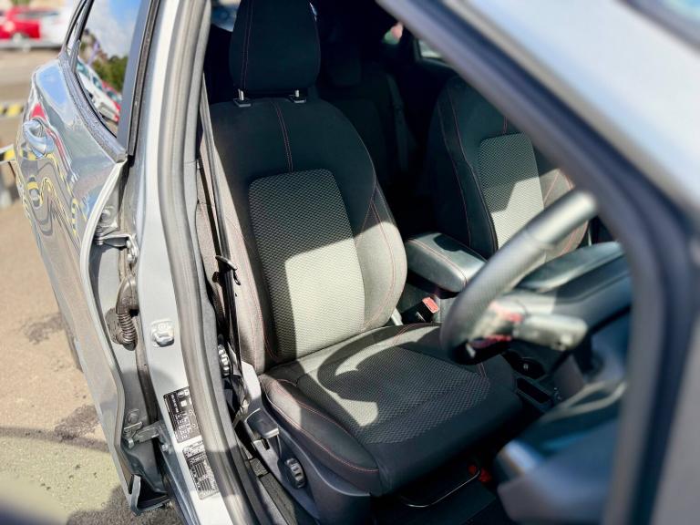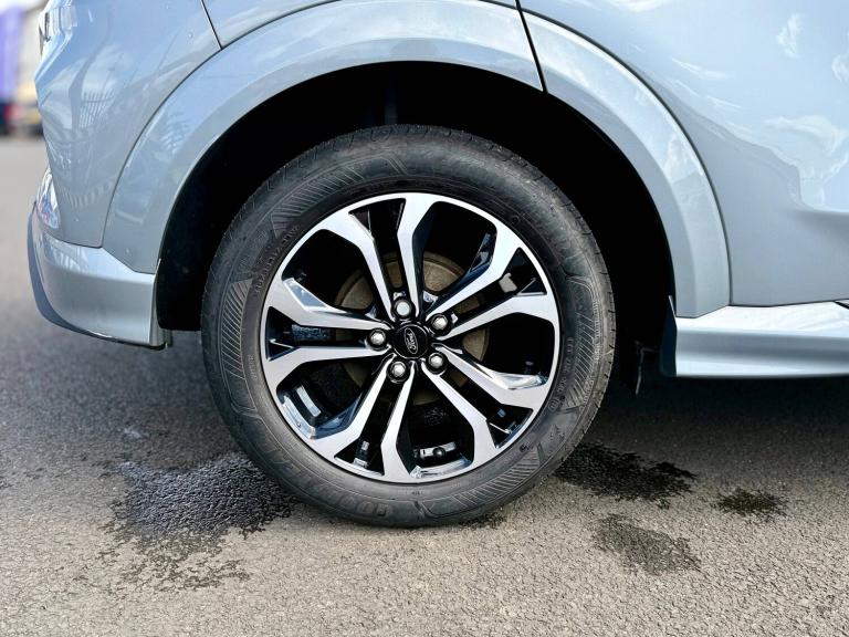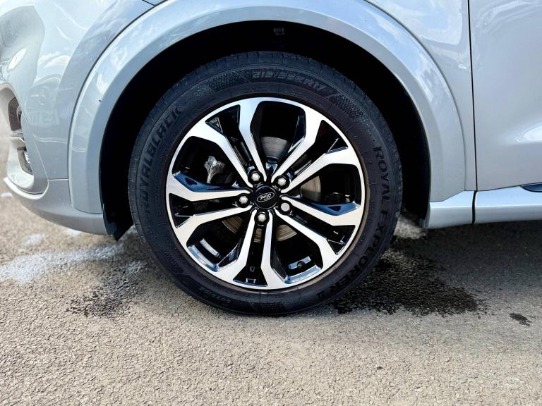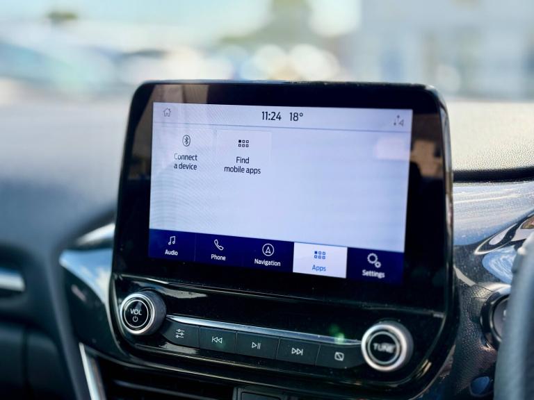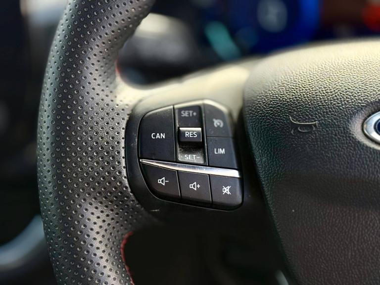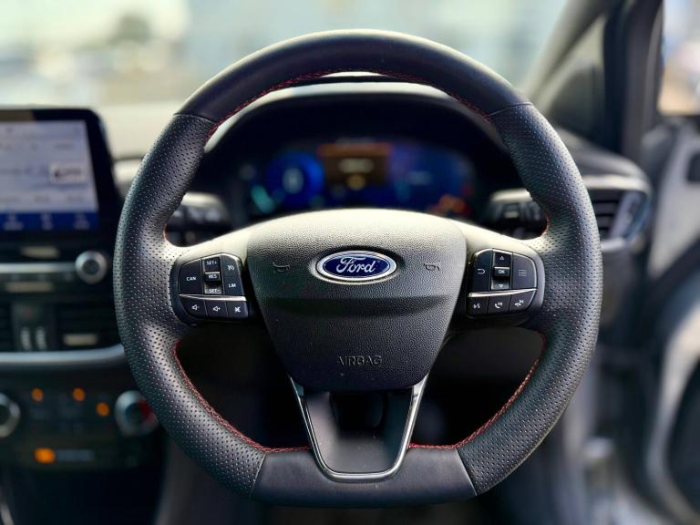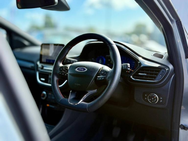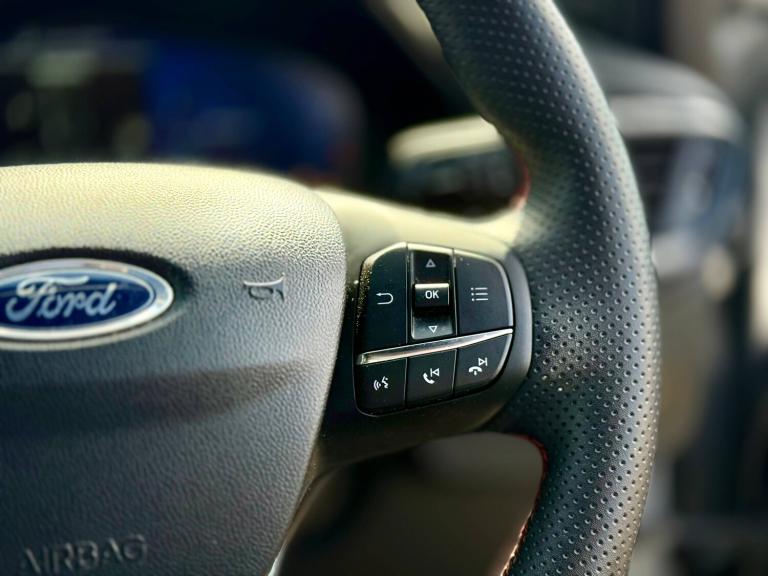 3 rear seatbelts, Autonomous emergency braking, Child safety lock, Electronic stability control (ESC) and hill start assist, Pedestrian/cyclist detection and post-collision braking, Pre collision assist system, Tyre pressure monitoring system (TPMS), Cruise control with Intelligent speed assist, Driver impairment monitor, Emergency call service, Ford easy fuel, Lane keeping aid with lane departure warning, Manual tailgate, Power assist steering, Power start button, Rear parking sensor, Selectable drive modes(Normal, sport, Eco, trail, slippery), Speed sign recognition, Automatic headlights with auto high beam, Automatic rain sensing wipers, Body coloured door mirrors, Body coloured roof, Large body colour rear roof spoiler, LED rear lamps, Power foldable heated door mirrors with puddle lamps, Projector headlamps with LED day time running lights and front fog lamps, Quickclear heated windscreen, Rear side wing doors, Rear wiper, Solid paint, ST-Line body styling kit with unique grille, Third brake light, 3 seat bench in 2nd row, Centre console with armrest and stowage, Ford megabox extended bootspace, Front and rear head restraints, Front floor mats, Manual 2 way passenger seat adjustment, Manual 4 way driver seat adjust with lumbar adjustment, Manual air conditioning, Single front passenger seat, ST- Line cloth trim with red stitching, ST-Line flat bottomed sensico leather steering wheel with leather handbrake and aluminium gear knob, Ford SYNC 3 navigation pack - Puma, Sport suspension, Thatcham alarm, Tyre inflation kit