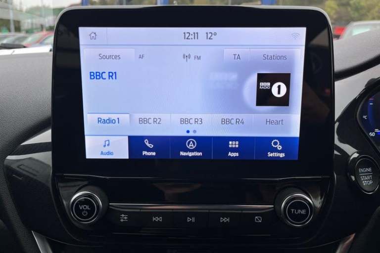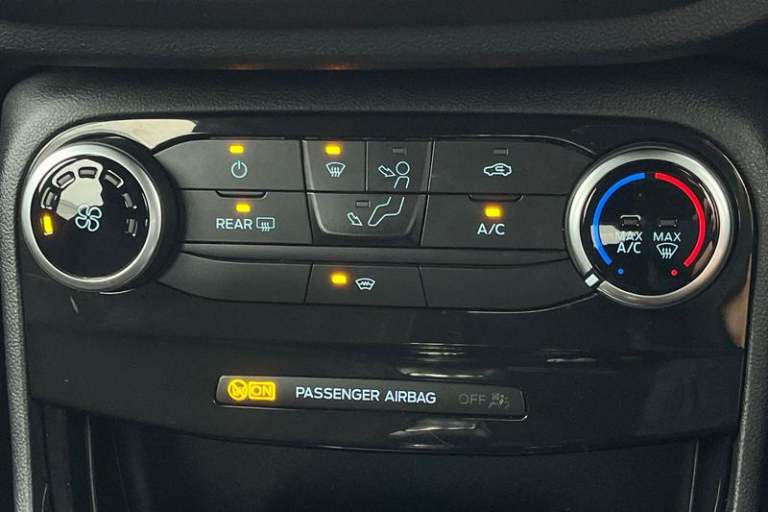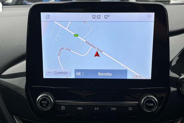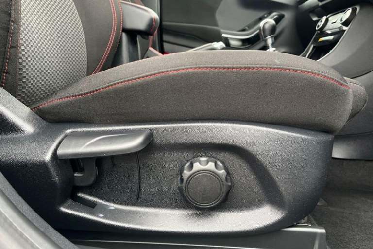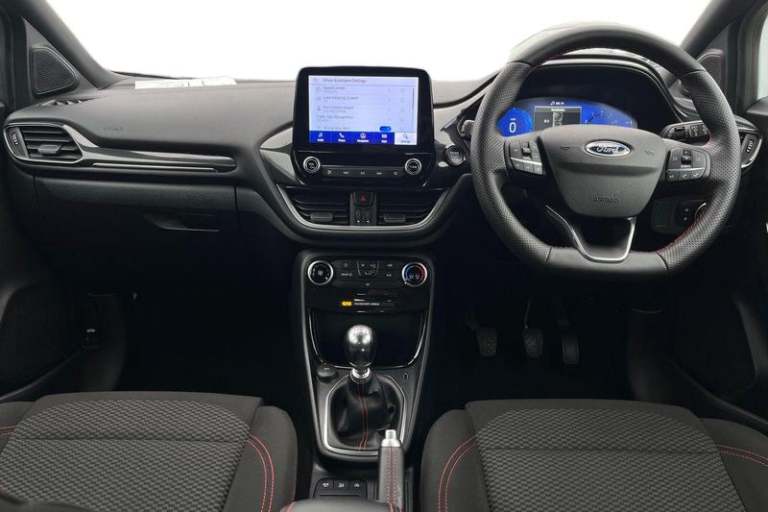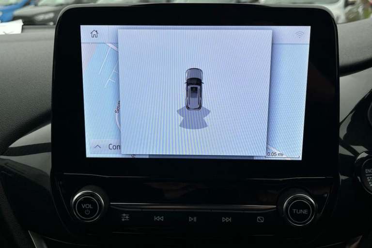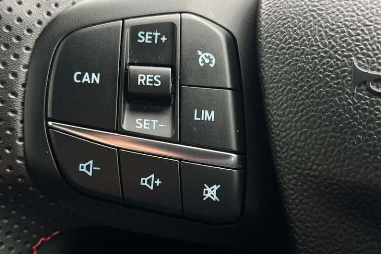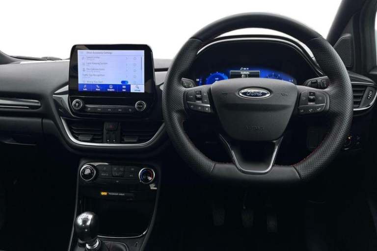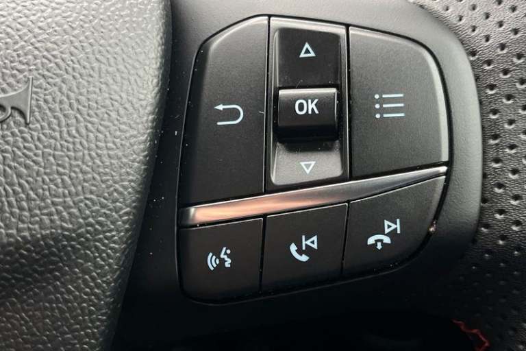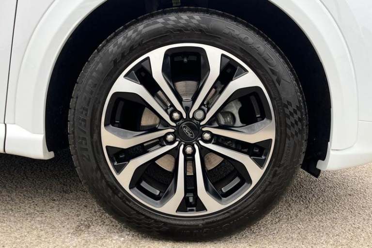 Driver impairment monitor, Emergency call service, Ford easy fuel, Full digital 12.3 instrument cluster, Lane keeping aid with lane departure warning, Power assist steering, Power start button, Rear parking sensor, Selectable drive modes(Normal, sport, Eco, trail, slippery), Speed sign recognition, Automatic headlights with auto high beam, Automatic rain sensing wipers, LED rear lamps, Power foldable heated door mirrors with puddle lamps, Projector headlamps with LED day time running lights and front fog lamps, Quickclear heated windscreen, Rear side wing doors, Rear wiper, ST-Line body styling kit with unique grille, Third brake light, 3 seat bench in 2nd row, Centre console with armrest and stowage, Ford megabox extended bootspace, Front and rear head restraints, Front floor mats, Manual 2 way passenger seat adjustment, Manual 4 way driver seat adjust with lumbar adjustment, Single front passenger seat, ST- Line cloth trim with red stitching, ST-Line flat bottomed sensico leather steering wheel with leather handbrake and aluminium gear knob, 3 rear seatbelts, Child safety lock, Electronic stability control (ESC) and hill start assist, Pedestrian/cyclist detection & post-collision braking, Pre collision assist system, Tyre pressure monitoring system (TPMS)
