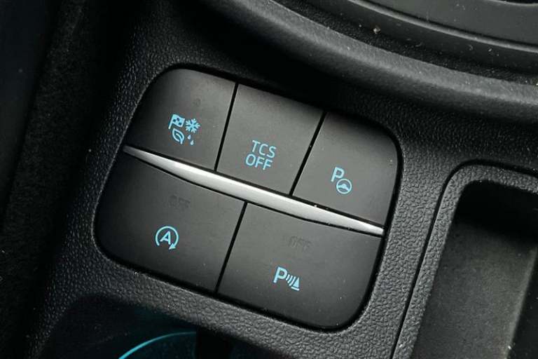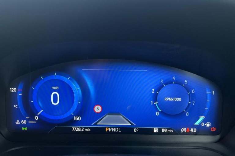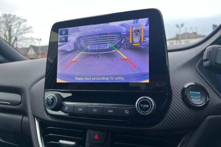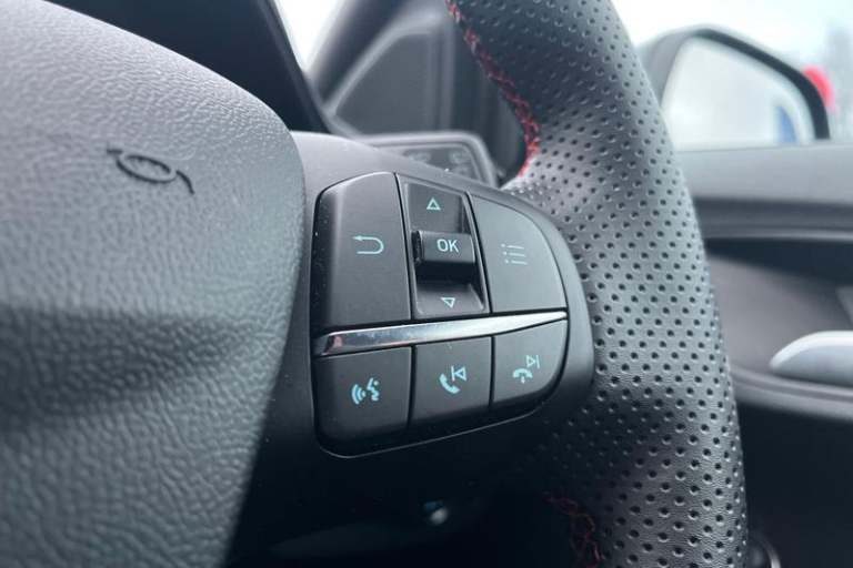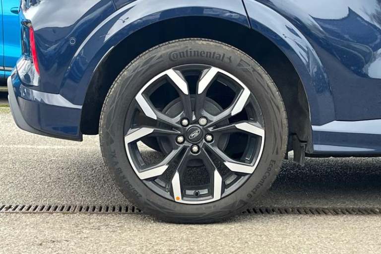 Driver impairment monitor, Emergency call service, Ford easy fuel, Full digital 12.3 instrument cluster, Lane keeping aid with lane departure warning, Power assist steering, Power start button, Rear parking sensor, Selectable drive modes(Normal, Eco, Sport, Slippery and Trail), Speed sign recognition, Automatic headlights with auto high beam, Automatic rain sensing wipers, Front fog lamps, LED daytime running lights, LED rear lamps, Power foldable heated door mirrors with puddle lamps, Privacy glass to side rear windows and tailgate glass, Quickclear heated windscreen, Rear side wing doors, Rear wiper, ST-Line body styling kit with unique grille, Third brake light, 3 seat bench in 2nd row, Centre console with armrest and stowage, Ford megabox extended bootspace, Front and rear head restraints, Front floor mats, Manual 4 way driver seat adjust with lumbar adjustment, Manual 4 way passenger seat with lumbar seat adjustment, Sensico partial premium upholstery, Single front passenger seat, ST-Line flat bottomed sensico leather steering wheel with leather handbrake and aluminium gear knob, Wireless charging pad with electronic air temperature control (EATC), 3 rear seatbelts, Child safety lock, Electronic stability control (ESC) and hill start assist, Pedestrian/cyclist detection & post-collision braking, Pre collision assist system, Tyre pressure monitoring system (TPMS)