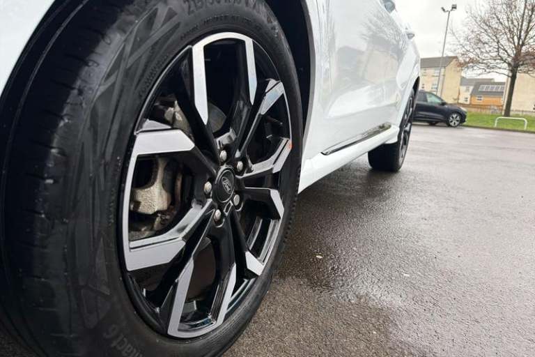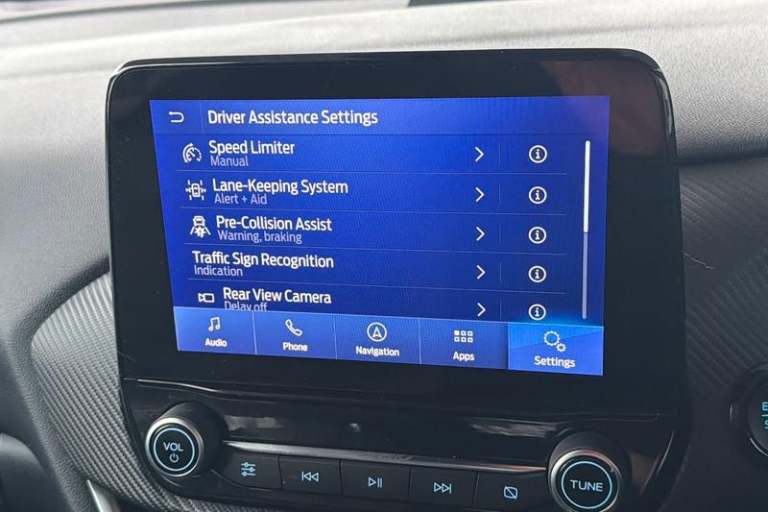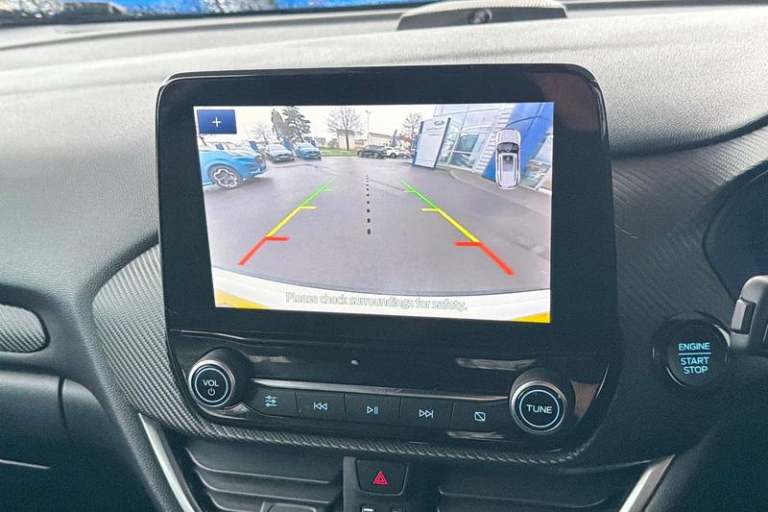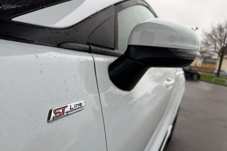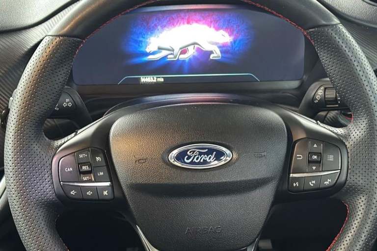 Driver impairment monitor, Emergency call service, Ford easy fuel, Full digital 12.3 instrument cluster, Lane keeping aid with lane departure warning, Power assist steering, Power start button, Rear parking sensor, Selectable drive modes(Normal, Eco, Sport, Slippery and Trail), Speed sign recognition, Automatic headlights with auto high beam, Automatic rain sensing wipers, Front fog lamps, LED daytime running lights, LED rear lamps, Power foldable heated door mirrors with puddle lamps, Privacy glass to side rear windows and tailgate glass, Quickclear heated windscreen, Rear side wing doors, Rear wiper, ST-Line body styling kit with unique grille, Third brake light, 3 seat bench in 2nd row, Centre console with armrest and stowage, Ford megabox extended bootspace, Front and rear head restraints, Front floor mats, Manual 4 way driver seat adjust with lumbar adjustment, Manual 4 way passenger seat with lumbar seat adjustment, Sensico partial premium upholstery, Single front passenger seat, ST-Line flat bottomed sensico leather steering wheel with leather handbrake and aluminium gear knob, Wireless charging pad with electronic air temperature control (EATC), 3 rear seatbelts, Child safety lock, Electronic stability control (ESC) and hill start assist, Pedestrian/cyclist detection & post-collision braking, Pre collision assist system, Tyre pressure monitoring system (TPMS)