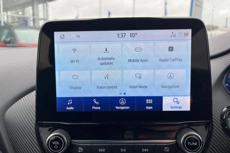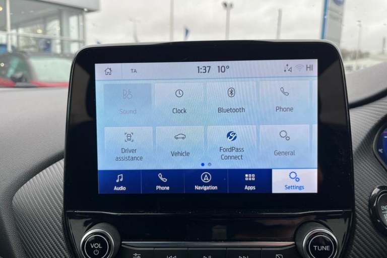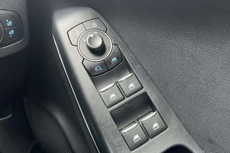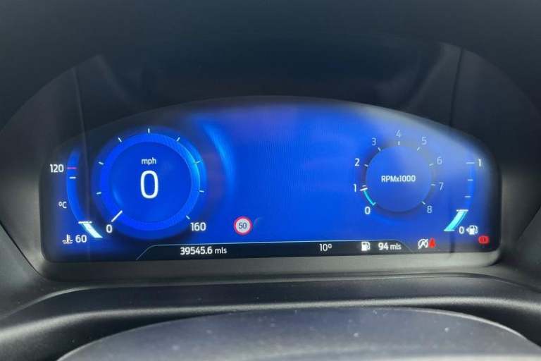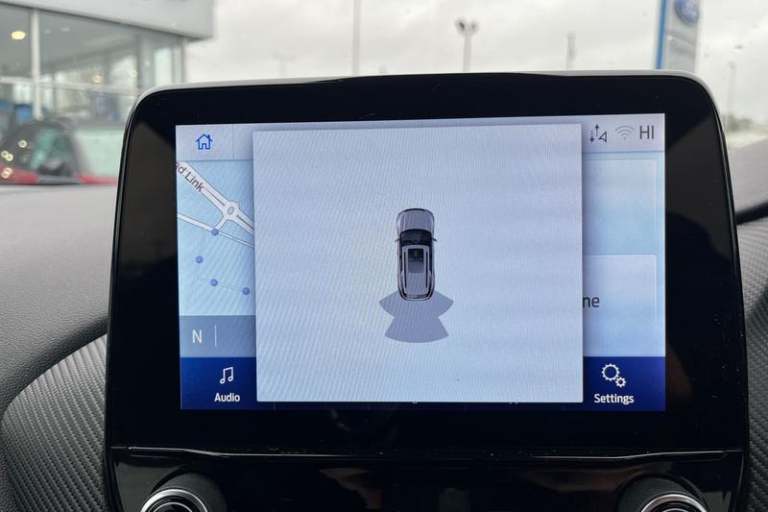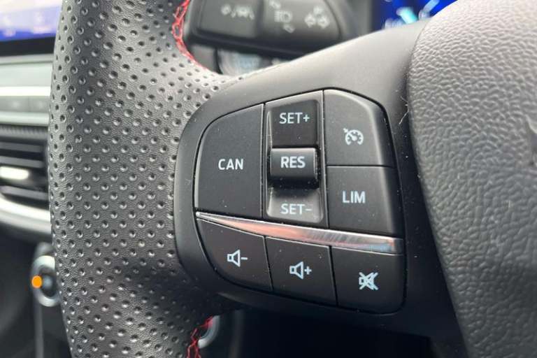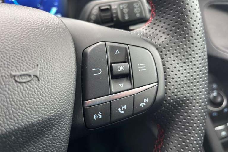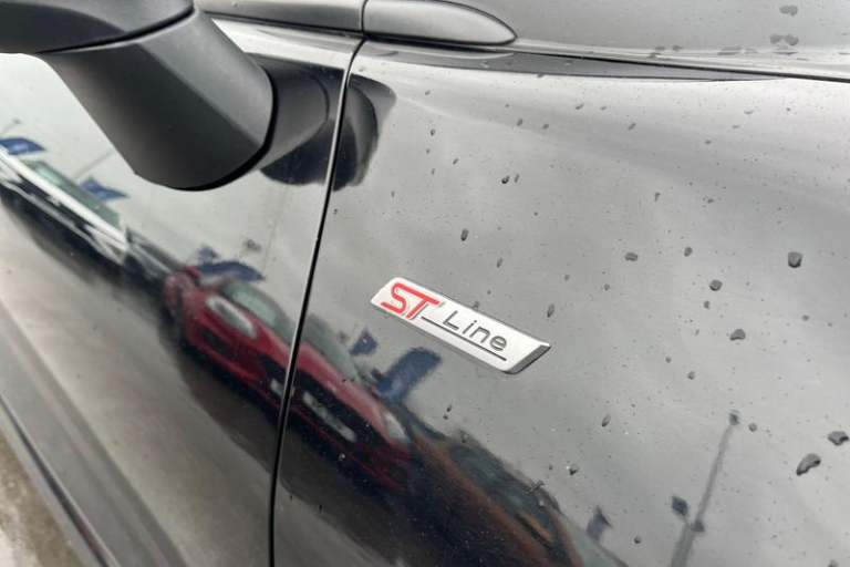 Driver impairment monitor, Emergency call service, Ford easy fuel, Full digital 12.3 instrument cluster, Lane keeping aid with lane departure warning, Power assist steering, Power start button, Rear parking sensor, Selectable drive modes(Normal, Eco, Sport, Slippery and Trail), Speed sign recognition, Automatic headlights with auto high beam, Automatic rain sensing wipers, Front fog lamps, LED daytime running lights, LED rear lamps, Power foldable heated door mirrors with puddle lamps, Privacy glass to side rear windows and tailgate glass, Quickclear heated windscreen, Rear side wing doors, Rear wiper, ST-Line body styling kit with unique grille, Third brake light, 3 seat bench in 2nd row, Centre console with armrest and stowage, Ford megabox extended bootspace, Front and rear head restraints, Front floor mats, Manual 4 way driver seat adjust with lumbar adjustment, Manual 4 way passenger seat with lumbar seat adjustment, Sensico partial premium upholstery, Single front passenger seat, ST-Line flat bottomed sensico leather steering wheel with leather handbrake and aluminium gear knob, Wireless charging pad with electronic air temperature control (EATC), 3 rear seatbelts, Child safety lock, Electronic stability control (ESC) and hill start assist, Pedestrian/cyclist detection & post-collision braking, Pre collision assist system, Tyre pressure monitoring system (TPMS)