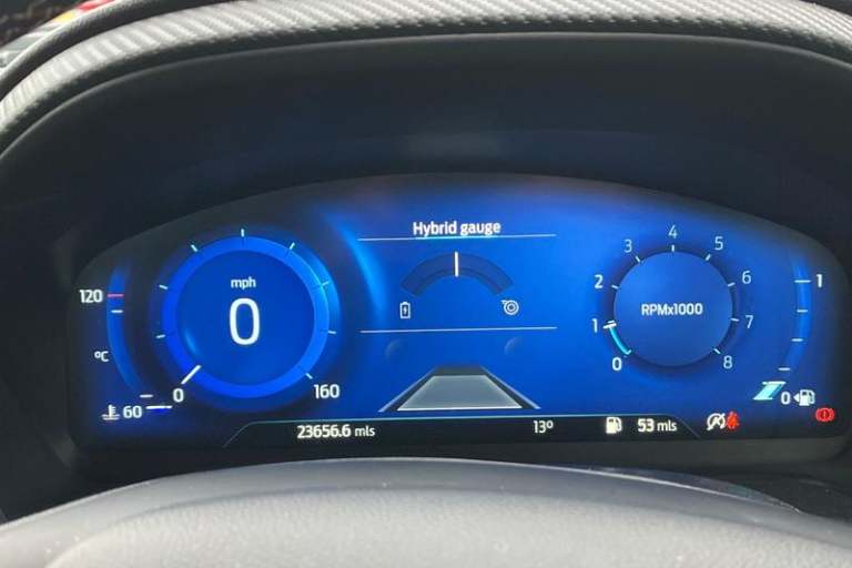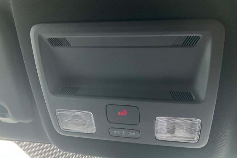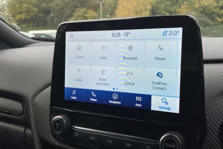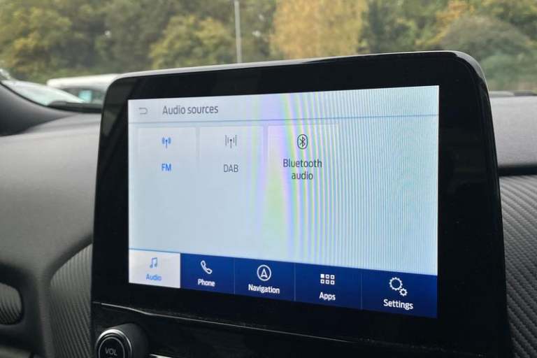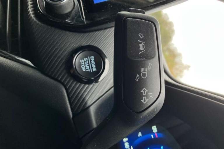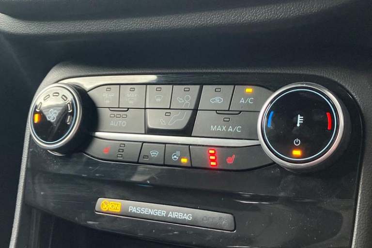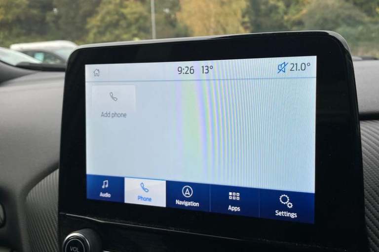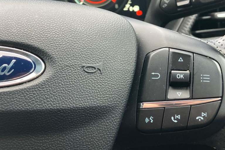 Driver impairment monitor, Emergency call service, Ford easy fuel, Full digital 12.3 instrument cluster, Hands free power tailgate with keyless entry system, Lane keeping aid with lane departure warning, Power assist steering, Power start button, Rear parking sensor, Selectable drive modes(Normal, sport, Eco, trail, slippery), Speed sign recognition, Automatic headlights with auto high beam, Automatic rain sensing wipers, Black contrast roof including A pillars, rear roof spoiler and door mirrors, Exclusive paint, Front fog lamps, LED daytime running lights, LED rear lamps, Power foldable heated door mirrors with puddle lamps, Privacy glass to side rear windows and tailgate glass, Quickclear heated windscreen, Rear side wing doors, Rear wiper, ST-Line body styling kit with unique grille and large rear spoiler, Third brake light, 3 seat bench in 2nd row, Centre console with armrest and stowage, Ford megabox extended bootspace, Front and rear head restraints, Front floor mats, Manual 4 way driver seat adjust with lumbar adjustment, Manual 4 way passenger seat with lumbar seat adjustment, Sensico partial premium upholstery, Single front passenger seat, ST-Line flat bottomed sensico leather steering wheel with leather handbrake and aluminium gear knob, Wireless charging pad with electronic air temperature control (EATC), 3 rear seatbelts, Child safety lock, Electronic stability control (ESC) and hill start assist, Pedestrian/cyclist detection & post-collision braking, Pre collision