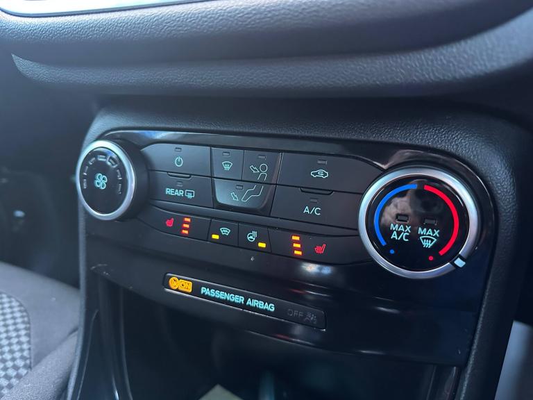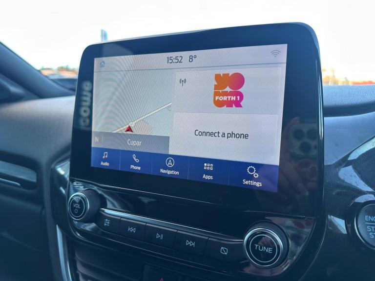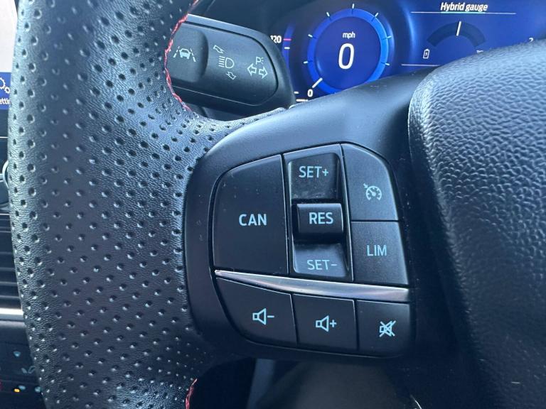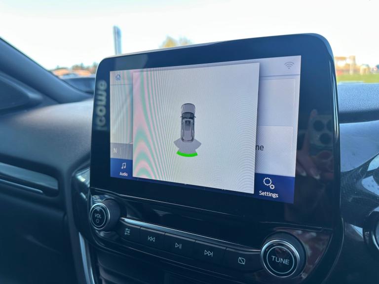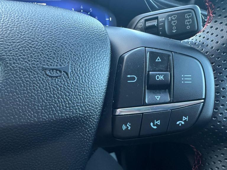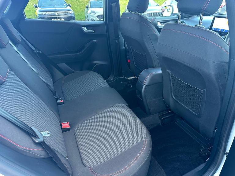 3 rear seatbelts, Autonomous emergency braking, Child safety lock, Electronic stability control (ESC) and hill start assist, Pedestrian/cyclist detection and post-collision braking, Pre collision assist system, Tyre pressure monitoring system (TPMS), Cruise control with Intelligent speed assist, Driver impairment monitor, Emergency call service, Ford easy fuel, Full digital 12.3 inch instrument cluster, Lane keeping aid with lane departure warning, Manual tailgate, Power assist steering, Power start button, Rear parking sensor, Selectable drive modes(Normal, sport, Eco, trail, slippery), Speed sign recognition, Automatic headlights with auto high beam, Automatic rain sensing wipers, Body coloured door mirrors, Body coloured roof, Large body colour rear roof spoiler, LED rear lamps, Power foldable heated door mirrors with puddle lamps, Projector headlamps with LED day time running lights and front fog lamps, Quickclear heated windscreen, Rear side wing doors, Rear wiper, Solid paint, ST-Line body styling kit with unique grille, Third brake light, 3 seat bench in 2nd row, Centre console with armrest and stowage, Ford megabox extended bootspace, Front and rear head restraints, Front floor mats, Manual 2 way passenger seat adjustment, Manual 4 way driver seat adjust with lumbar adjustment, Manual air conditioning, Single front passenger seat, ST- Line cloth trim with red stitching, ST-Line flat bottomed sensico leather steering wheel with leather handbrake and aluminium gear knob, Ford SYNC 3 navigation pack - Puma, Sport suspension, Thatcham alarm, 17 inch 5x2 spoke black machined finished alloy wheel, Tyre inflation kit
