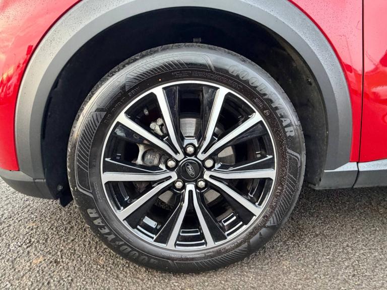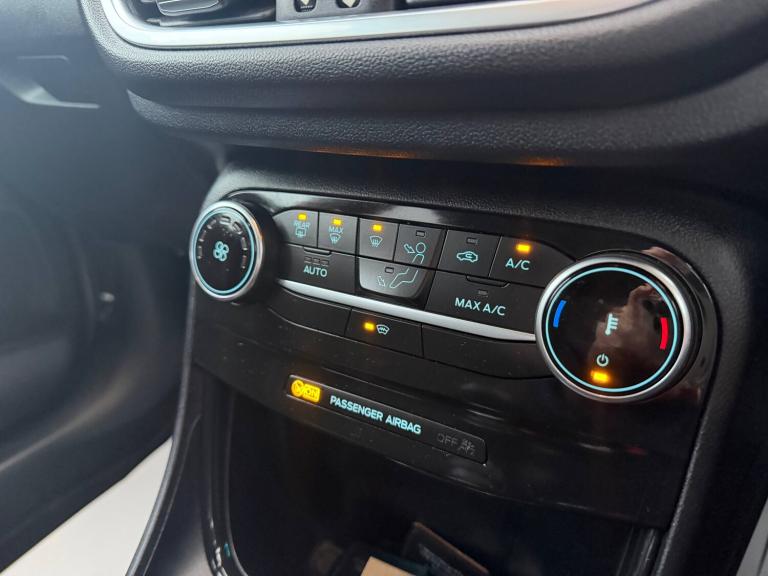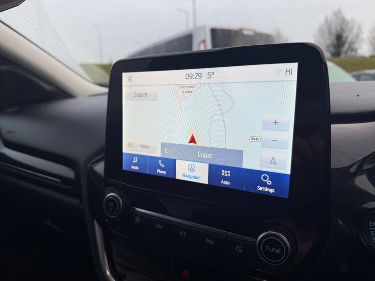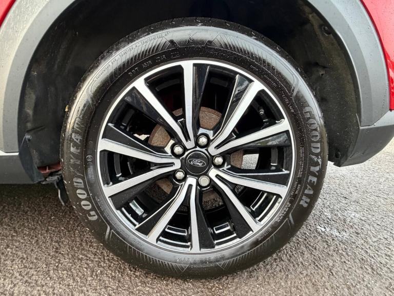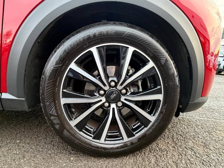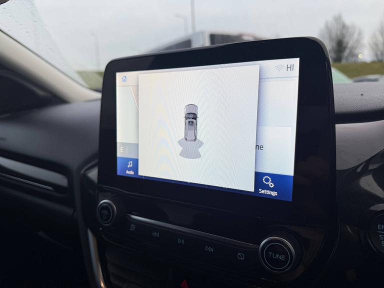 3 rear seatbelts, Autonomous emergency braking, Child safety lock, Electronic stability control (ESC) and hill start assist, Pedestrian/cyclist detection and post-collision braking, Pre collision assist system, Tyre pressure monitoring system (TPMS), Colour 4.2 inch TFT analogue instrument cluster, Cruise control with Intelligent speed assist, Driver impairment monitor, Emergency call service, Ford easy fuel, Lane keeping aid with lane departure warning, Manual tailgate, Power assist steering, Power start button, Rear parking sensor, Selectable drive modes(Normal, Eco, Sport, Slippery and Trail), Speed sign recognition, Automatic headlights with auto high beam, Automatic rain sensing wipers, Body colour rear spoiler, Body coloured door mirrors, Body coloured roof, LED rear lamps, Power foldable heated door mirrors with puddle lamps, Projector headlamps with LED day time running lights and front fog lamps, Quickclear heated windscreen, Rear side wing doors, Rear wiper, Solid paint, Third brake light, 3 seat bench in 2nd row, Centre console with armrest and stowage, Electronic automatic temperature control (EATC), Ford megabox extended bootspace, Front and rear head restraints, Front floor mats, Manual 2 way passenger seat adjustment, Manual 4 way driver seat adjust with lumbar adjustment, Sensico leather steering wheel/gear knob/handbrake, Single front passenger seat, Titanium cloth upholstery, Ford SYNC 3 navigation pack - Puma, Standard suspension, Thatcham alarm, 17 inch 10 spoke absolute black machined finish alloy wheel, Tyre inflation kit