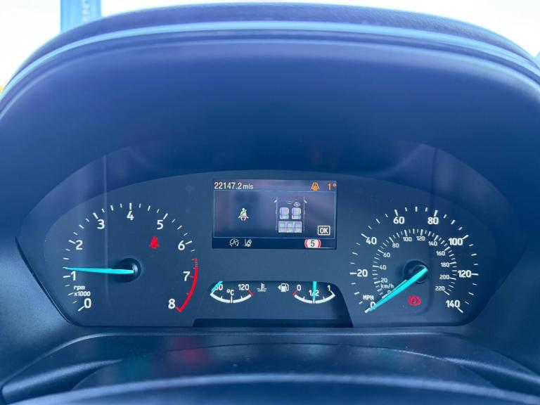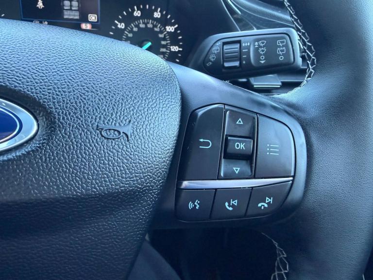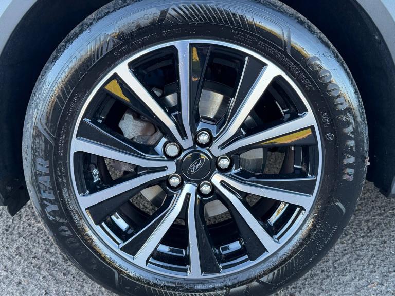 3 rear seatbelts, Autonomous emergency braking, Child safety lock, Electronic stability control (ESC) and hill start assist, Pedestrian/cyclist detection and post-collision braking, Pre collision assist system, Tyre pressure monitoring system (TPMS), Colour 4.2 inch TFT analogue instrument cluster, Cruise control with Intelligent speed assist, Driver impairment monitor, Emergency call service, Ford easy fuel, Lane keeping aid with lane departure warning, Manual tailgate, Power assist steering, Power start button, Rear parking sensor, Selectable drive modes(Normal, Eco, Sport, Slippery and Trail), Speed sign recognition, Automatic headlights with auto high beam, Automatic rain sensing wipers, Body colour rear spoiler, Body coloured door mirrors, Body coloured roof, Exclusive paint, LED rear lamps, Power foldable heated door mirrors with puddle lamps, Projector headlamps with LED day time running lights and front fog lamps, Quickclear heated windscreen, Rear side wing doors, Rear wiper, Solid paint, Third brake light, 3 seat bench in 2nd row, Centre console with armrest and stowage, Electronic automatic temperature control (EATC), Ford megabox extended bootspace, Front and rear head restraints, Front floor mats, Manual 2 way passenger seat adjustment, Manual 4 way driver seat adjust with lumbar adjustment, Sensico leather steering wheel/gear knob/handbrake, Single front passenger seat, Titanium cloth upholstery, Ford SYNC 3 navigation pack - Puma, Exclusive paint - Desert island blue, Standard suspension, Titanium cloth - Black, Thatcham alarm, 17 inch 10 spoke absolute black machined finish alloy wheel, Tyre inflation kit