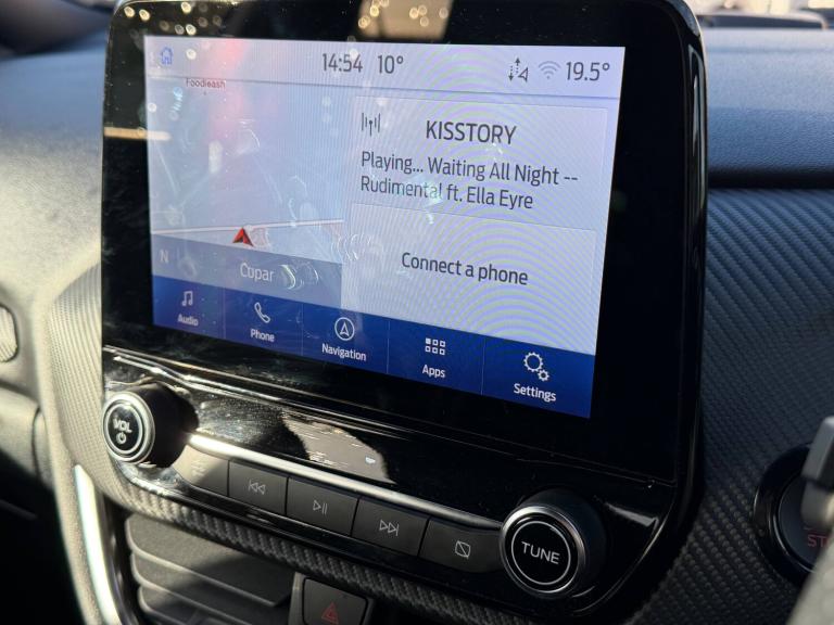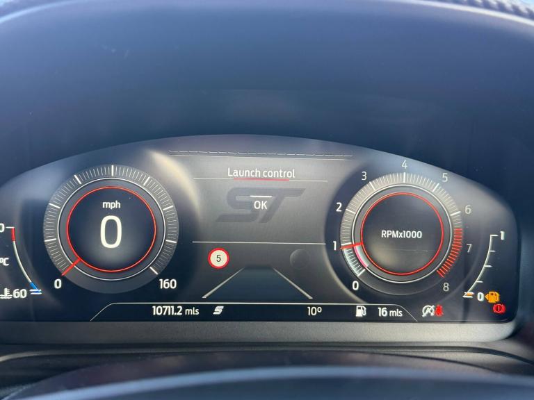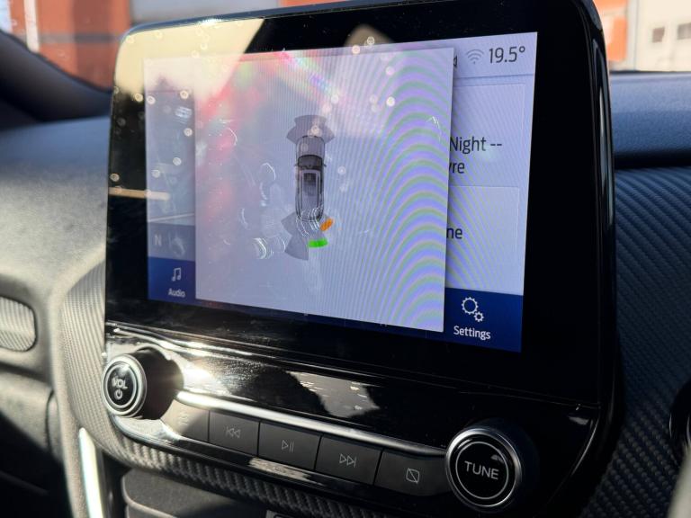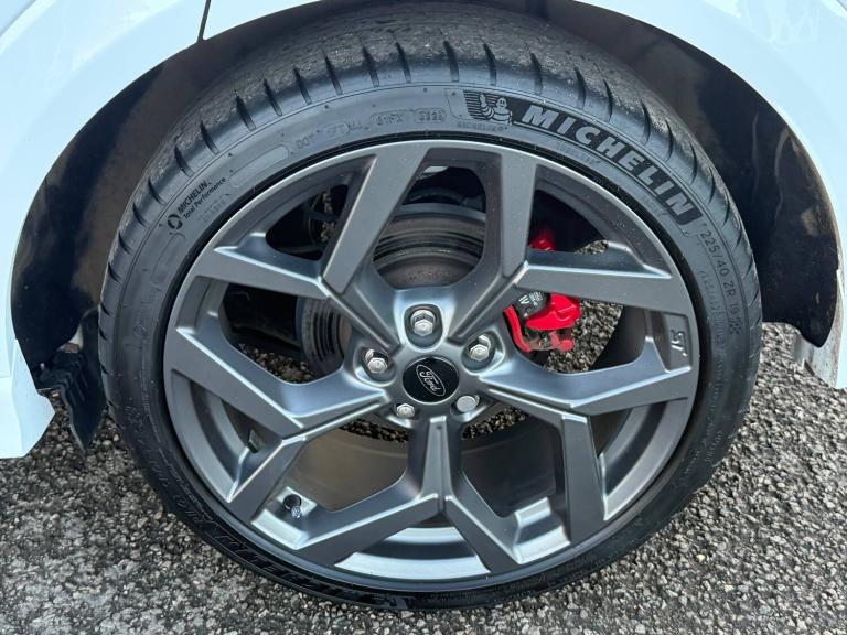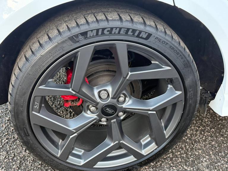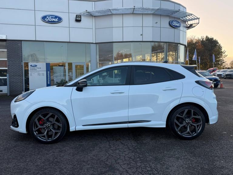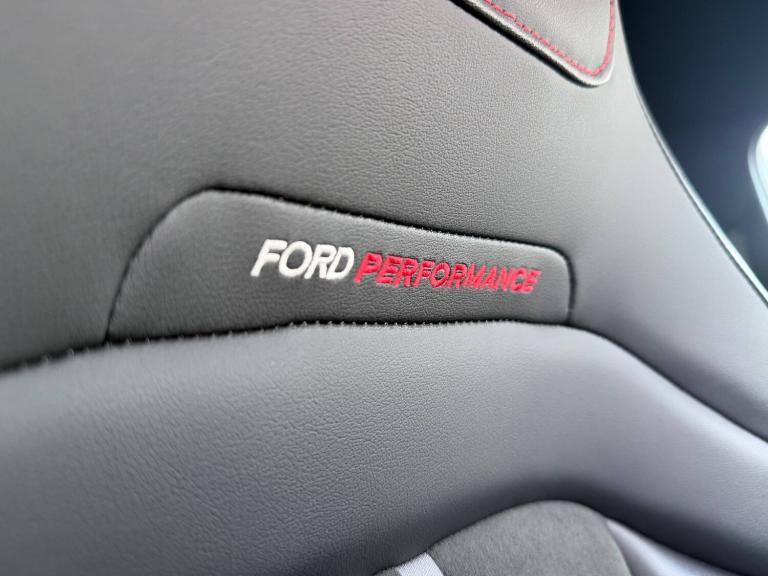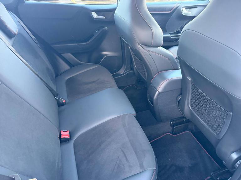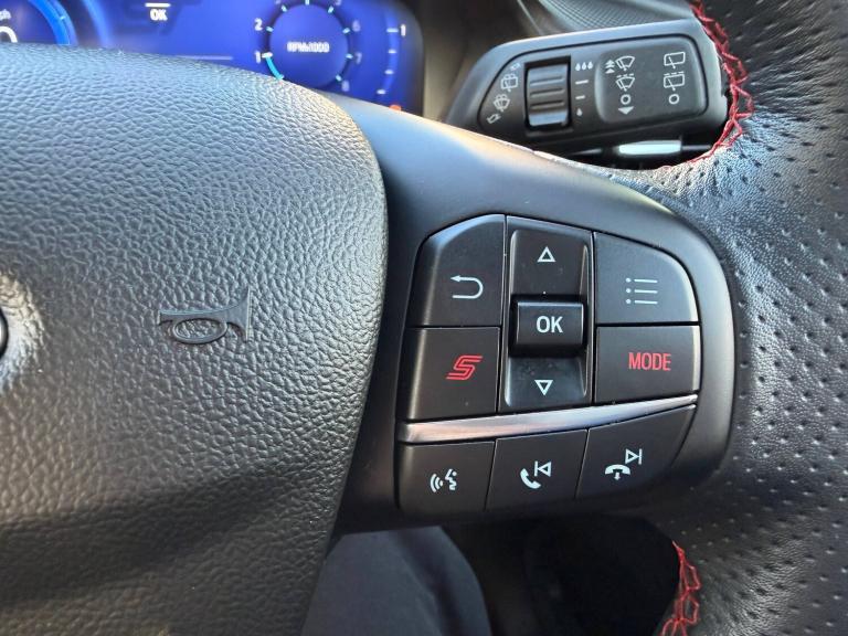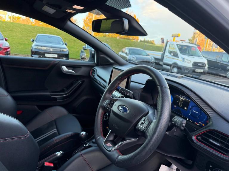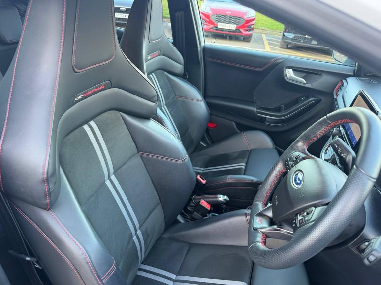 3 rear seatbelts, Autonomous emergency braking, Child safety lock, Electronic stability control (ESC) and hill start assist, Pedestrian/cyclist detection and post-collision braking, Pre collision assist system, Red brake calipers, Tyre pressure monitoring system (TPMS), Cruise control with Intelligent speed assist, Driver impairment monitor, Emergency call service, Ford easy fuel, Front and rear parking sensors, Full digital 12.3 inch instrument cluster, Lane keeping aid with lane departure warning, Manual tailgate, Power assist steering, Selectable drive modes (normal, sport, eco, track), Speed sign recognition, Automatic headlights with auto high beam, Automatic rain sensing wipers, Body coloured door mirrors, Body coloured roof, Dual chrome exhaust, Fixed LED signature headlamps, Front fog lamps, Large rear spoiler, LED daytime running lights, LED rear lamps, Power foldable heated door mirrors with puddle lamps and puma logo protection, Premium paint, Privacy glass to side rear windows and tailgate glass, Quickclear heated windscreen, Rear side wing doors, Rear wiper, ST scuff plates, Third brake light, Unique ST body styling kit including wing mirrors and Ford Performance embossed splitter, 3 seat bench in 2nd row, Alloy sports pedals, Centre console with armrest and stowage, Ford megabox extended bootspace, Ford Performance sensico partial premium leather upholstery with metal grey stitching, Front and rear floor mats, Front and rear head restraints, Manual 6 way driver seat adjust with lumbar adjustment, Manual 6 way passenger seat with lumbar seat adjustment, Single front passenger seat, ST flat bottomed steering wheel with metal grey stitching, ST logo projection, Unique ST gear shift knob, Wireless charging pad with electronic air temperature control (EATC), BandO Premium Audio system + Ford SYNC 3 navigation pack - Puma, Winter pack - Puma, Engine sound enhancer, ST suspension, Carbon look interior deco spears, Keyless entry and power start button, Thatcham alarm, 19 inch 5 Spoke magnetite dark finished alloy wheel, Tyre inflation kit