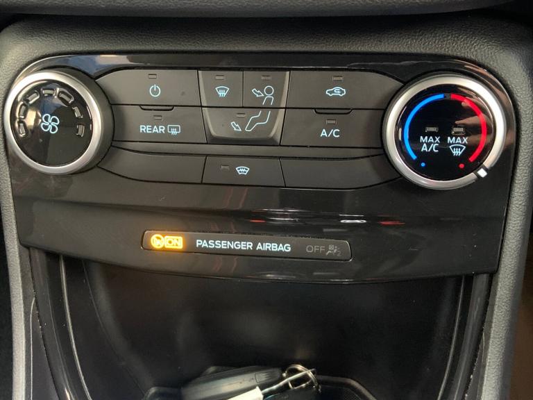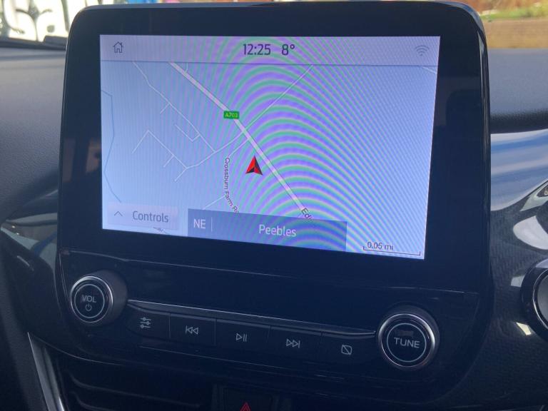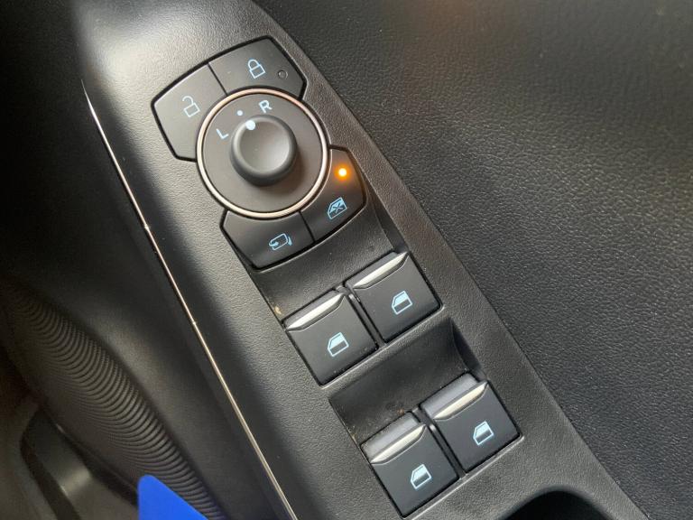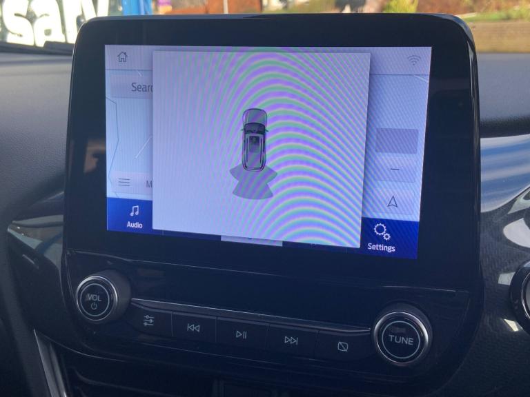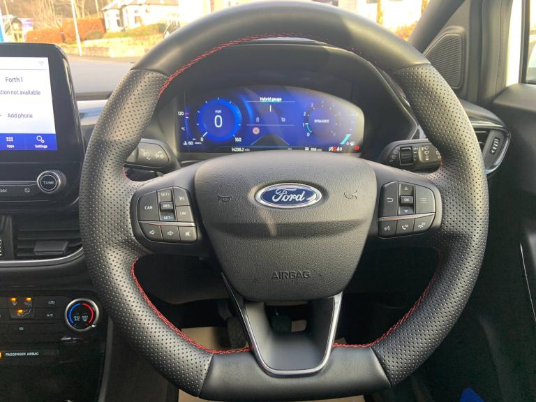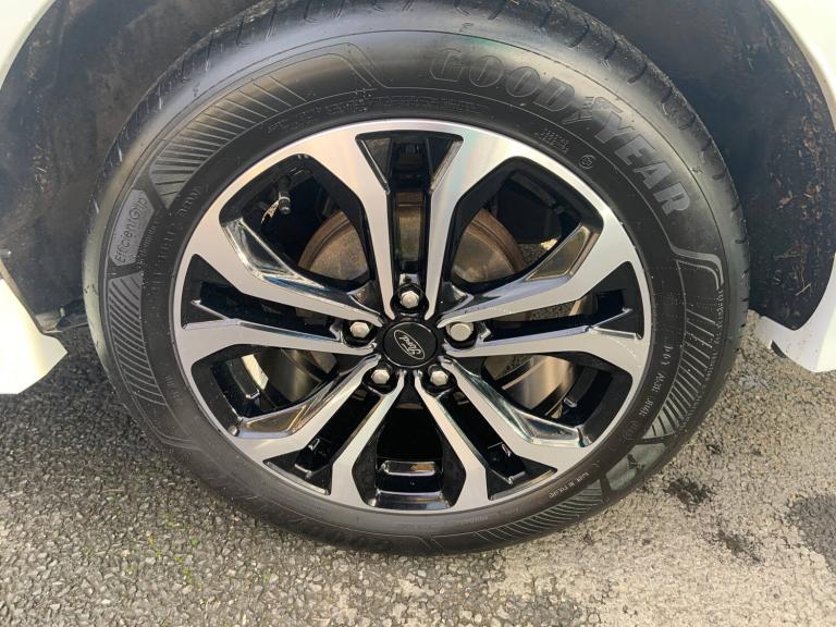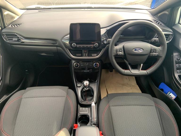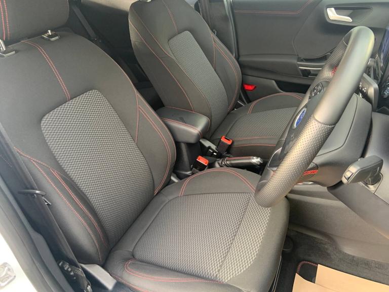 3 rear seatbelts, Autonomous emergency braking, Child safety lock, Electronic stability control (ESC) and hill start assist, Pedestrian/cyclist detection and post-collision braking, Pre collision assist system, Tyre pressure monitoring system (TPMS), Cruise control with Intelligent speed assist, Driver impairment monitor, Emergency call service, Ford easy fuel, Full digital 12.3 inch instrument cluster, Lane keeping aid with lane departure warning, Manual tailgate, Power assist steering, Power start button, Rear parking sensor, Selectable drive modes(Normal, Eco, Sport, Slippery and Trail), Speed sign recognition, Automatic headlights with auto high beam, Automatic rain sensing wipers, Body coloured door mirrors, Body coloured roof, Large body colour rear roof spoiler, LED rear lamps, Power foldable heated door mirrors with puddle lamps, Projector headlamps with LED day time running lights and front fog lamps, Quickclear heated windscreen, Rear side wing doors, Rear wiper, Solid paint, ST-Line body styling kit with unique grille, Third brake light, 3 seat bench in 2nd row, Centre console with armrest and stowage, Ford megabox extended bootspace, Front and rear head restraints, Front floor mats, Manual 2 way passenger seat adjustment, Manual 4 way driver seat adjust with lumbar adjustment, Manual air conditioning, Single front passenger seat, ST- Line cloth trim with red stitching, ST-Line flat bottomed sensico leather steering wheel with leather handbrake and aluminium gear knob, Ford SYNC 3 navigation pack - Puma, Sport suspension, Thatcham alarm, 17 inch 5x2 spoke black machined finished alloy wheel, Tyre inflation kit