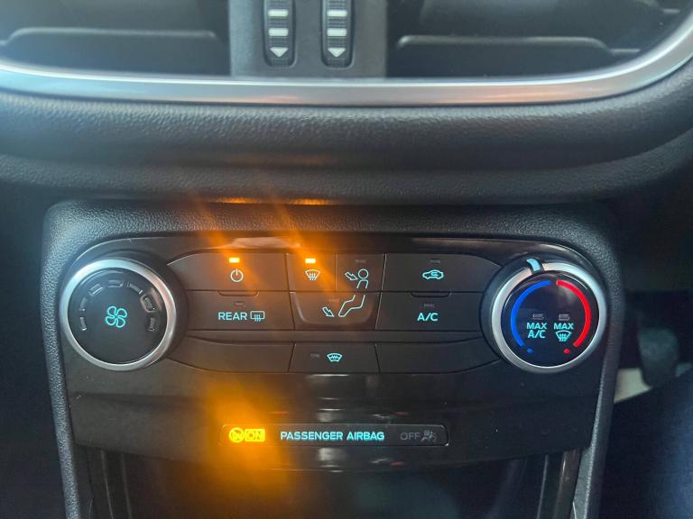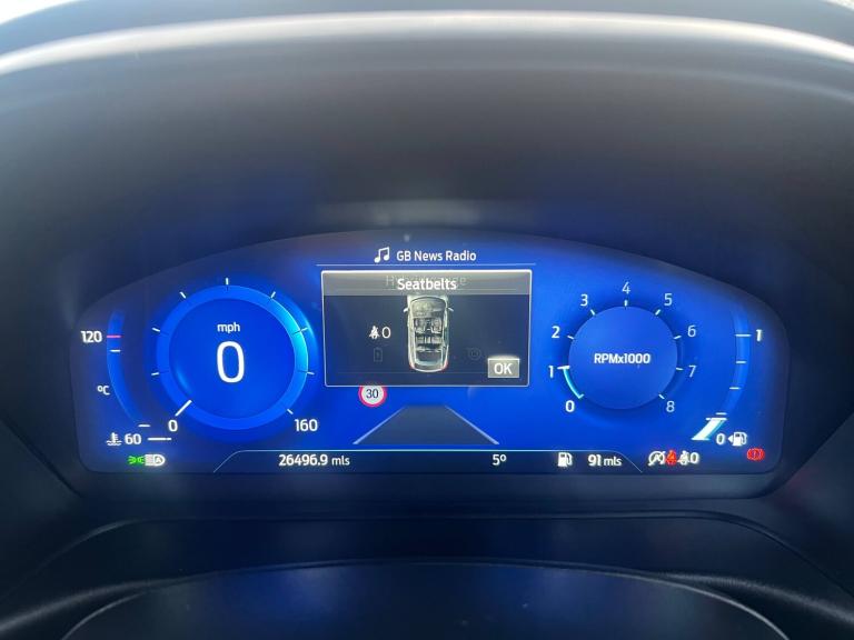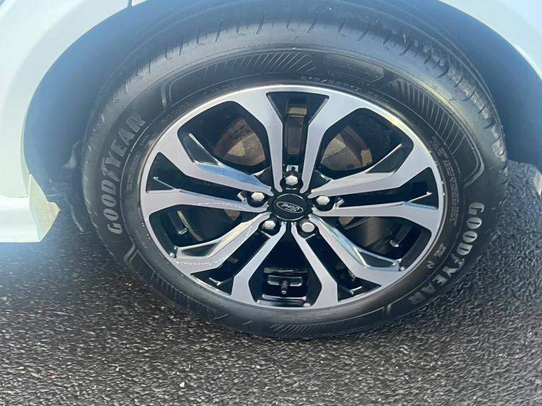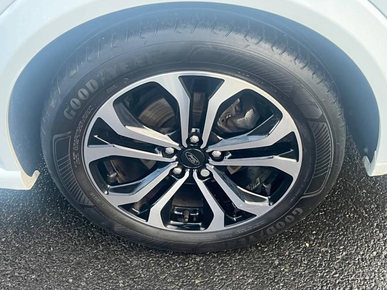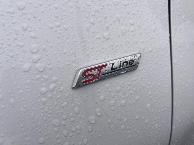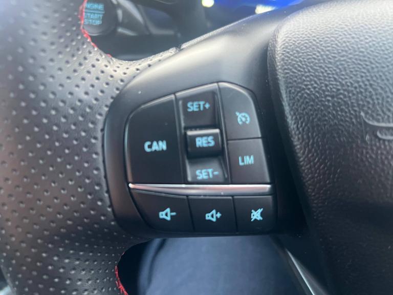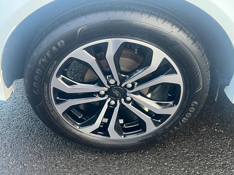 3 rear seatbelts, Autonomous emergency braking, Child safety lock, Electronic stability control (ESC) and hill start assist, Pedestrian/cyclist detection and post-collision braking, Pre collision assist system, Tyre pressure monitoring system (TPMS), Cruise control with Intelligent speed assist, Driver impairment monitor, Emergency call service, Ford easy fuel, Full digital 12.3 inch instrument cluster, Lane keeping aid with lane departure warning, Manual tailgate, Power assist steering, Power start button, Rear parking sensor, Selectable drive modes(Normal, Eco, Sport, Slippery and Trail), Speed sign recognition, Automatic headlights with auto high beam, Automatic rain sensing wipers, Body coloured door mirrors, Body coloured roof, Large body colour rear roof spoiler, LED rear lamps, Power foldable heated door mirrors with puddle lamps, Projector headlamps with LED day time running lights and front fog lamps, Quickclear heated windscreen, Rear side wing doors, Rear wiper, Solid paint, ST-Line body styling kit with unique grille, Third brake light, 3 seat bench in 2nd row, Centre console with armrest and stowage, Ford megabox extended bootspace, Front and rear head restraints, Front floor mats, Manual 2 way passenger seat adjustment, Manual 4 way driver seat adjust with lumbar adjustment, Manual air conditioning, Single front passenger seat, ST- Line cloth trim with red stitching, ST-Line flat bottomed sensico leather steering wheel with leather handbrake and aluminium gear knob, Ford SYNC 3 navigation pack - Puma, Sport suspension, Thatcham alarm, 17 inch 5x2 spoke black machined finished alloy wheel, Tyre inflation kit