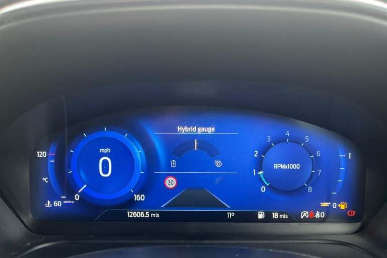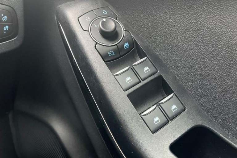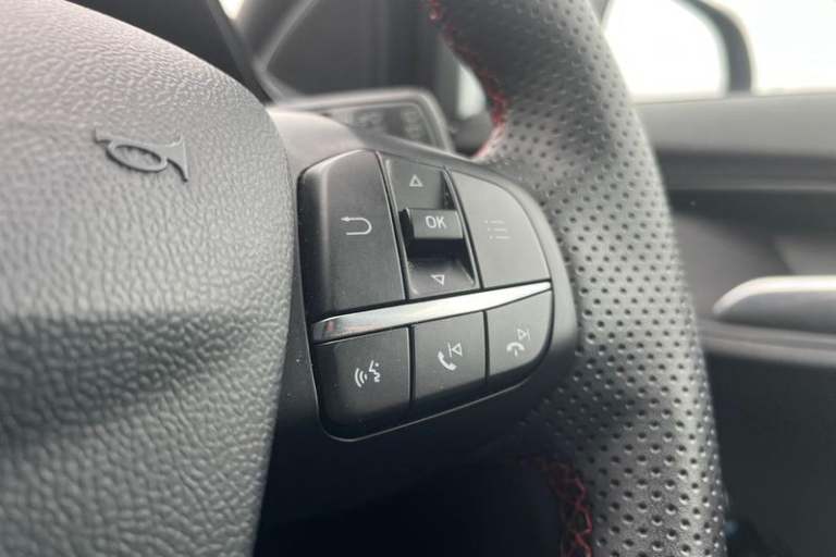 Driver impairment monitor, Emergency call service, Ford easy fuel, Full digital 12.3 instrument cluster, Lane keeping aid with lane departure warning, Power assist steering, Power start button, Rear parking sensor, Selectable drive modes(Normal, sport, Eco, trail, slippery), Speed sign recognition, Automatic headlights with auto high beam, Automatic rain sensing wipers, LED rear lamps, Power foldable heated door mirrors with puddle lamps, Projector headlamps with LED day time running lights and front fog lamps, Quickclear heated windscreen, Rear side wing doors, Rear wiper, ST-Line body styling kit with unique grille, Third brake light, 3 seat bench in 2nd row, Centre console with armrest and stowage, Ford megabox extended bootspace, Front and rear head restraints, Front floor mats, Manual 2 way passenger seat adjustment, Manual 4 way driver seat adjust with lumbar adjustment, Single front passenger seat, ST- Line cloth trim with red stitching, ST-Line flat bottomed sensico leather steering wheel with leather handbrake and aluminium gear knob, 3 rear seatbelts, Child safety lock, Electronic stability control (ESC) and hill start assist, Pedestrian/cyclist detection & post-collision braking, Pre collision assist system, Tyre pressure monitoring system (TPMS)