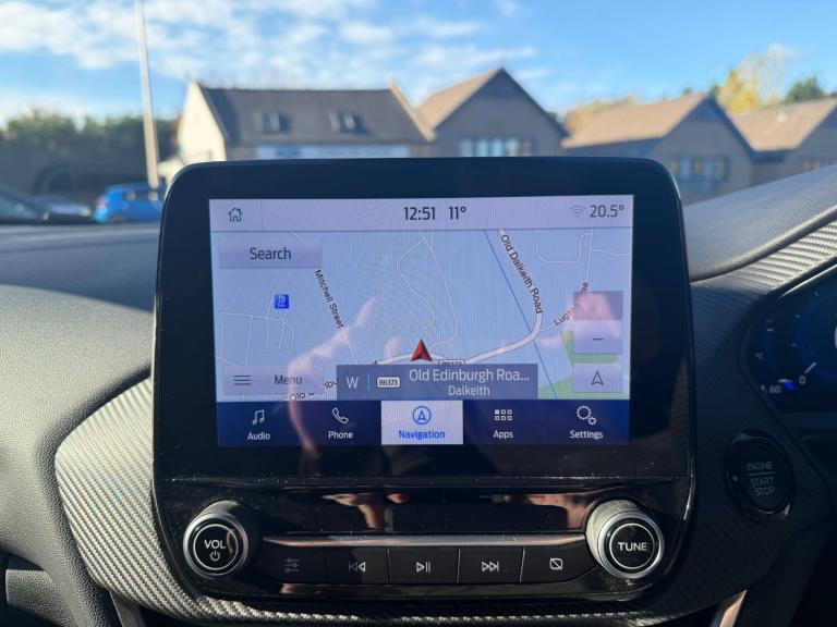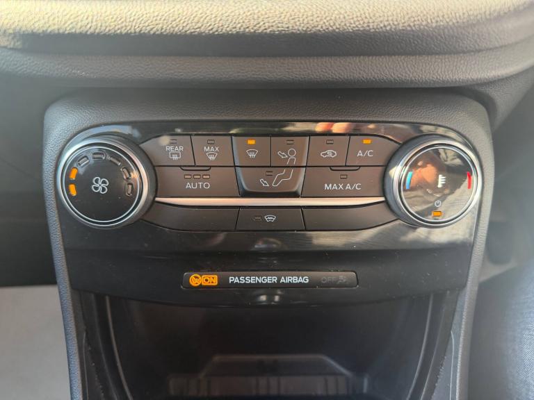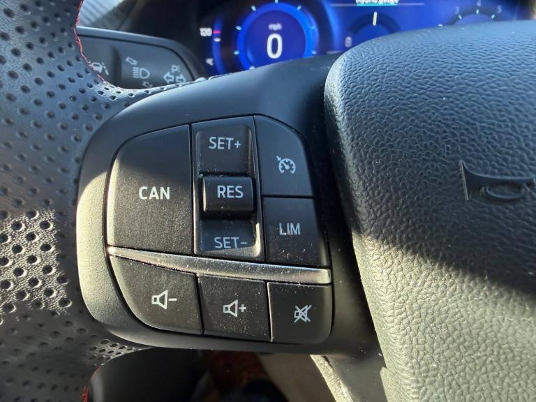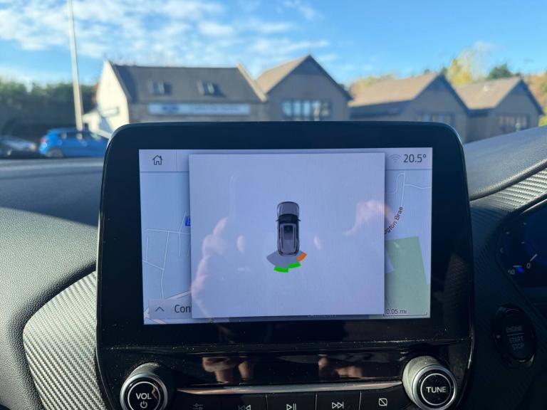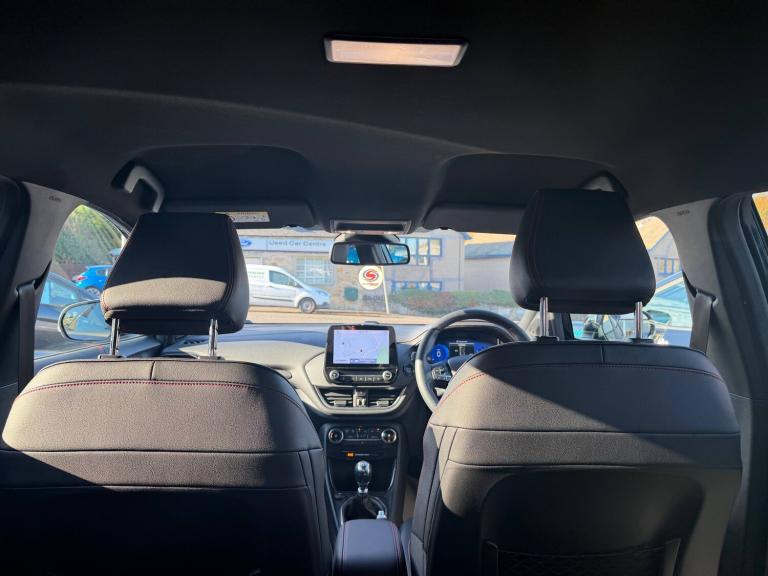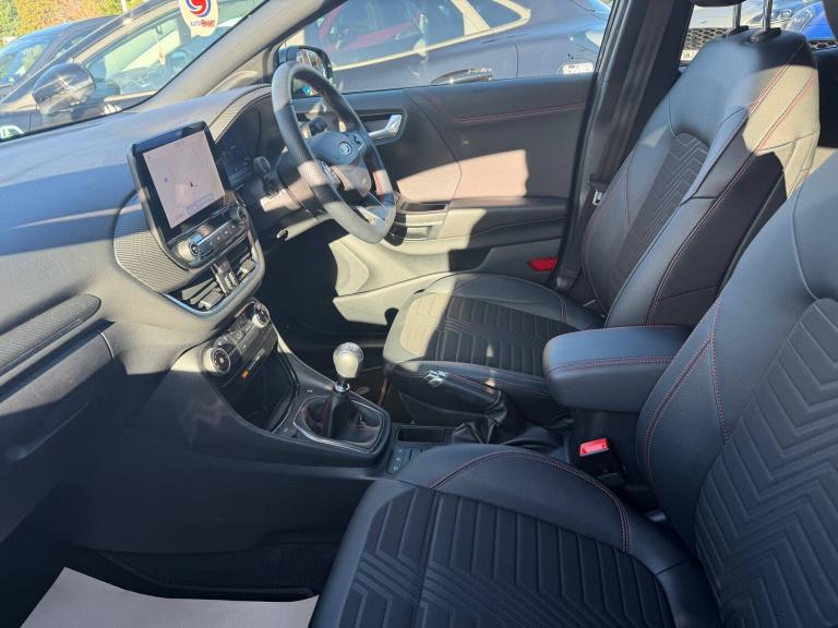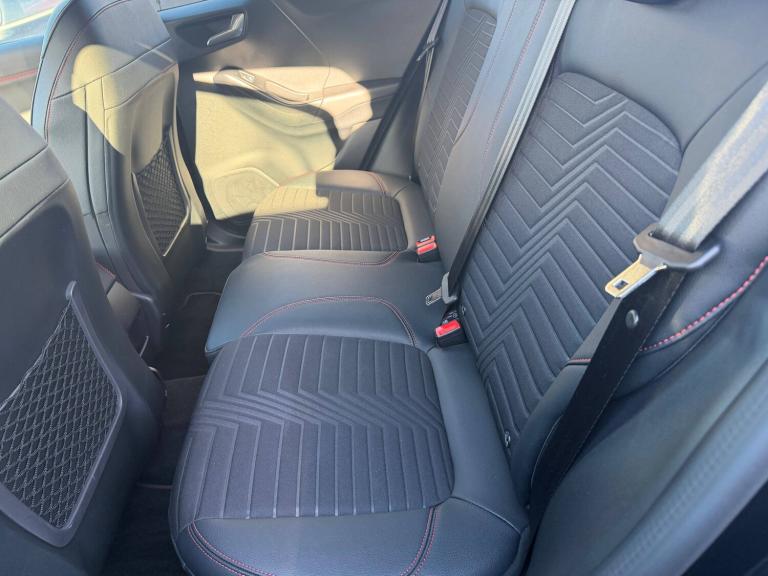 3 rear seatbelts, Autonomous emergency braking, Child safety lock, Electronic stability control (ESC) and hill start assist, Pedestrian/cyclist detection and post-collision braking, Pre collision assist system, Tyre pressure monitoring system (TPMS), Cruise control with Intelligent speed assist, Driver impairment monitor, Emergency call service, Ford easy fuel, Full digital 12.3 inch instrument cluster, Lane keeping aid with lane departure warning, Manual tailgate, Power assist steering, Power start button, Rear parking sensor, Selectable drive modes(Normal, sport, Eco, trail, slippery), Speed sign recognition, Automatic headlights with auto high beam, Automatic rain sensing wipers, Body coloured door mirrors, Body coloured roof, Front fog lamps, Large body colour rear roof spoiler, LED daytime running lights, LED rear lamps, Power foldable heated door mirrors with puddle lamps, Privacy glass to side rear windows and tailgate glass, Projector headlamps, Quickclear heated windscreen, Rear side wing doors, Rear wiper, Solid paint, ST-Line body styling kit with unique grille, Third brake light, 3 seat bench in 2nd row, Centre console with armrest and stowage, Ford megabox extended bootspace, Front and rear head restraints, Front floor mats, Manual 4 way driver seat adjust with lumbar adjustment, Manual 4 way passenger seat with lumbar seat adjustment, Sensico partial premium upholstery, Single front passenger seat, ST-Line flat bottomed sensico leather steering wheel with leather handbrake and aluminium gear knob, Wireless charging pad with electronic air temperature control (EATC), BandO Premium Audio system + Ford SYNC 3 navigation pack - Puma, Sport suspension, Carbon look interior deco spears, Thatcham alarm, 18 inch 5 spoke matt black finish alloy wheels, Tyre inflation kit