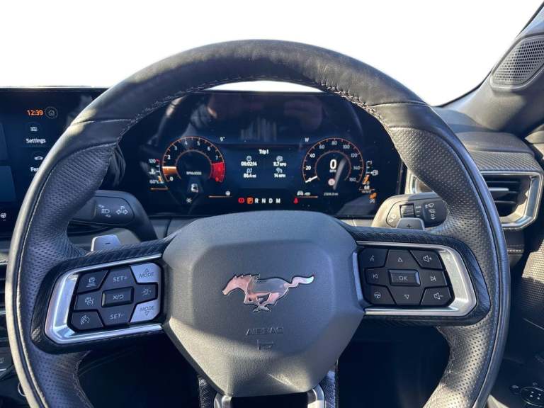 ..12'' digital LCD instrument cluster, Adaptive cruise control with adjustable speed limiter, Apple car play/Android Auto, Bluetooth connectivity with voice control, Electric power steering, Emergency services call system, Ford pass connect embedded modem, Fully customisable 13.2'' Touchscreen with wireless smartphone integration, FordPass connect & connected navigation, Lane keeping aid with lane keeping assist, Oil pressure gauge, Rear view camera with rear parking sensors, Selectable driving modes - normal, mymode, snow/wet, sport+, track and drag mode, Service interval indicator, SYNC Emergency Assistance, Track apps with accelerometer technology, Trip computer, Wireless charging and USB charging port, Fully independent front and rear suspension, Limited slip differential, Bang & Olufsen 12-speaker surround sound audio system, DAB Digital radio, USB connection, 3rd brake light, Active exhaust system with quad tailpipes, Auto dimming rear view mirror, Auto high beam, Automatic headlights, Automatic rain sensing wipers, Body colour bumpers, Bonnet air intake, Electric front windows, GT bodykit with black door frame mouldings, GT exterior badging, and quad tailpipes, GT front grille with vertical power bars, LED daytime running lights, LED rear lights with sequential indicators and welcome / farewell animations, Power-folding door mirrors including blind spot informaion system and mustang logo projection puddle lamps, Rear boot, Silver Triple-LED headlamps with welcome / farewell animation, 6 way power adjustable front seats, Ambient lighting, Cup holders, Electronic automatic temperature control (EATC), Front headrests, Heated leather flat bottom steering wheel, Heated/ventilated and cooled front seats, Illuminated entry system, Individually folding 2 rear seats in 2nd row, Isofix system on outer rear seats, Leather gearknob, Leather/vinyl upholstery, Reach and rake adjustable leather steering wheel with integrated controls, Rear head restraints, Single front passenger seat, Sports seats, 4 seatbelts, ABS, Drivers knee airbag, Dual front airbags, Electronic Line Lock, Electronic Stability Control (ESC) with three settings, ESP, Front side airbags, Performance brake system with brembo 6 piston front callipers and electronic brake prefill, Pre-collision assist with AEB and pedestrian and cyclist detection, Side curtain airbags, Tyre pressure monitor, Ford key free system with power starter button and keyless entry, Immobiliser, Thatcham Cat.1 alarm, Tyre