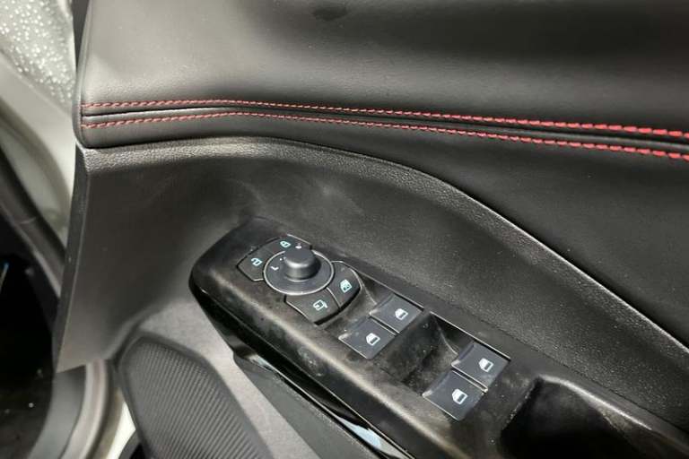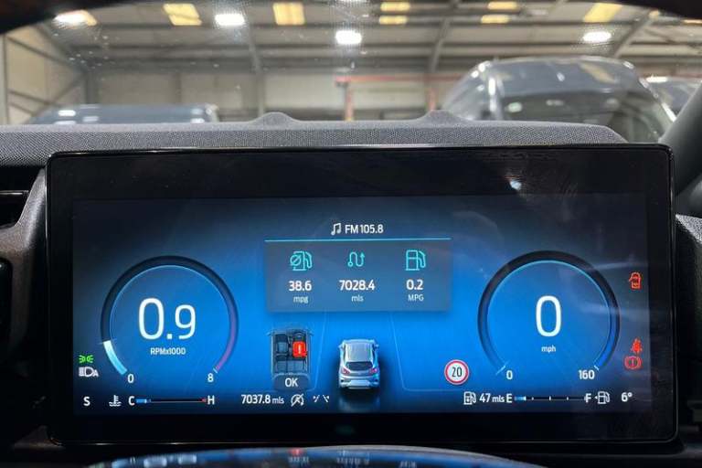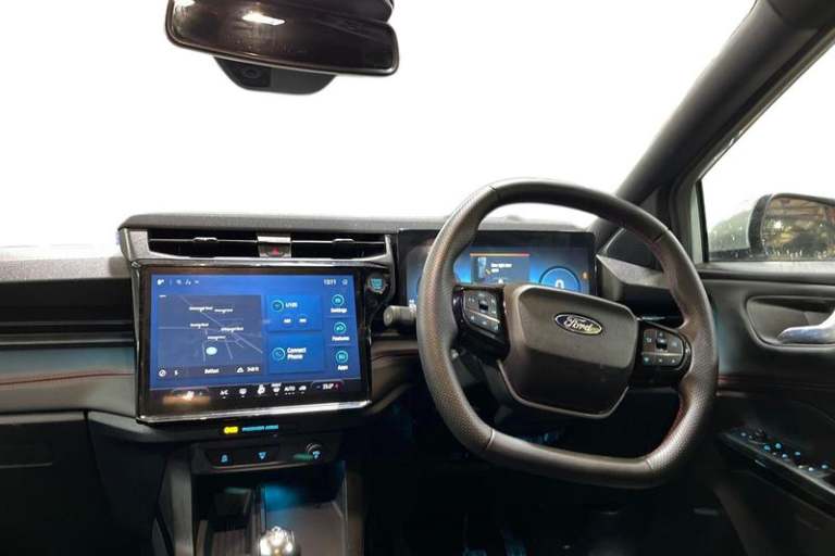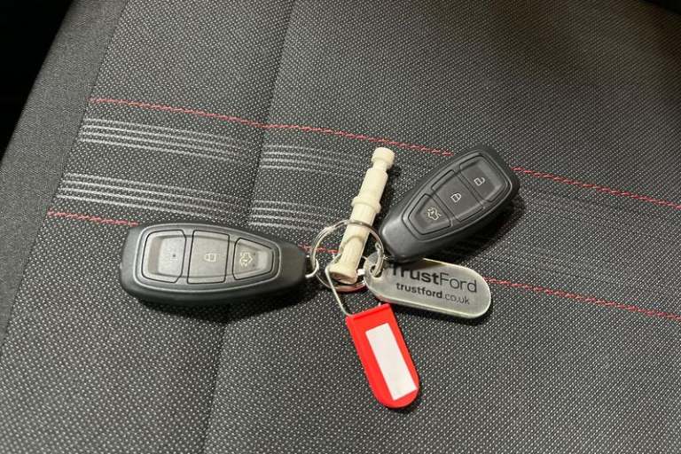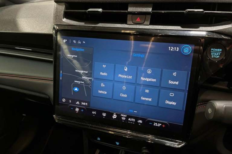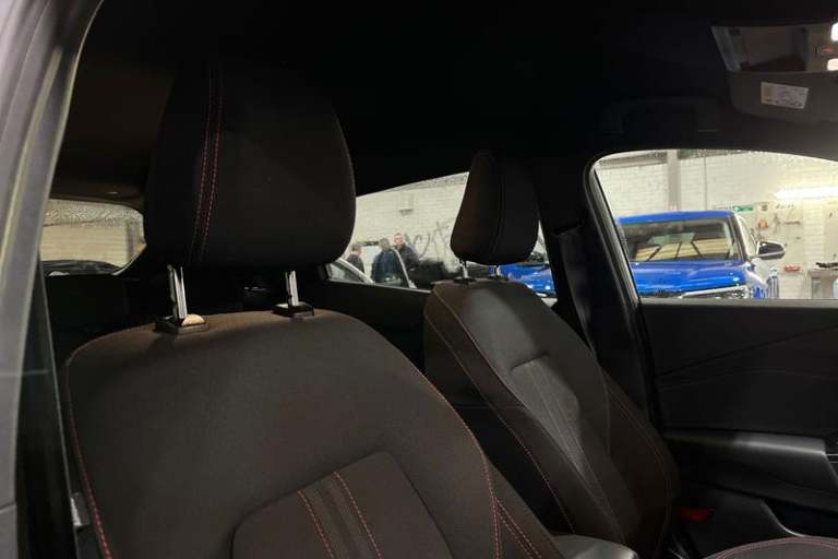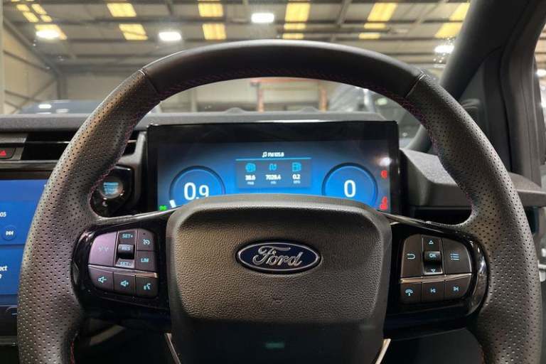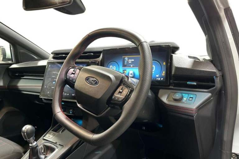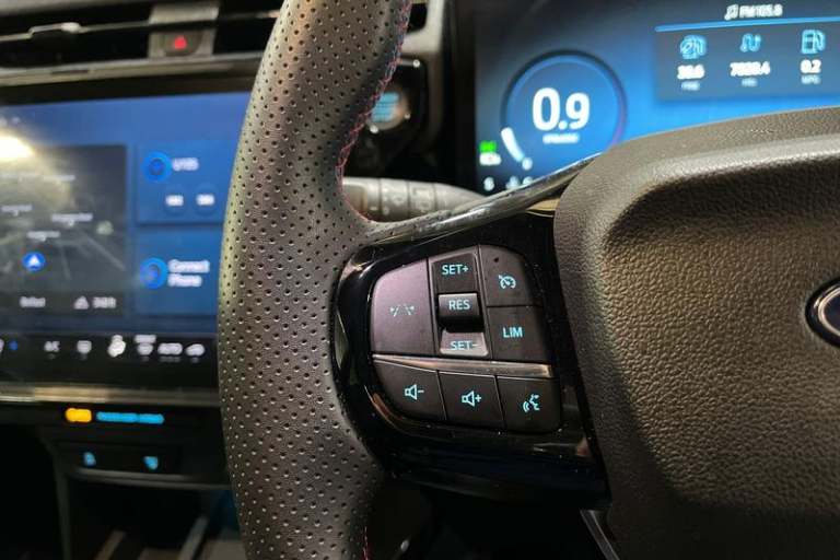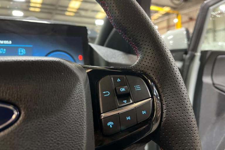 Driver impairment monitor, Emergency call service, Ford easy fuel, Full digital 12.8 instrument cluster, Lane keeping aid with lane departure warning, Power assist steering, Selectable drive modes(Normal, Eco, Sport, Slippery and Trail), Speed sign recognition, Automatic headlights with rain sensing wipers and auto high beam, Front fog lamps, LED daytime running lights, LED rear lamps, LED third brake light, Power foldable heated door mirrors with puddle lamps and puma logo protection, Quickclear heated windscreen, Rear privacy glass, Rear side wing doors, Rear wiper, ST-Line body styling kit with unique grille, 3 seat bench in 2nd row, Centre console with armrest and stowage, Electronic automatic temperature control (EATC), Ford megabox extended bootspace, Front and rear head restraints, Front floor mats, Manual 4 way driver seat adjust with lumbar adjustment, Single front passenger seat, ST- Line cloth trim with red stitching, 3 rear seatbelts, Child safety lock, Electronic stability control (ESC) and hill start assist, Pre-collision assist with autonomous emergency braking, pedestrian/cyclist detection & post-collision braking, Tyre pressure monitoring system (TPMS)