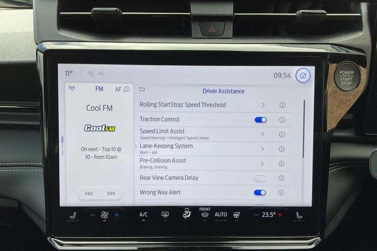 Driver alert system, Emergency call service, Ford easy fuel, Full digital 12.8 instrument cluster, Lane keeping aid, Power assist steering, Selectable drive modes(Normal, Eco, Sport, Slippery and Trail), Speed sign recognition, Automatic headlights with rain sensing wipers and auto high beam, Front fog lamps, LED daytime running lights, LED rear lamps, LED third brake light, Quickclear heated windscreen, Rear privacy glass, Rear side wing doors, Rear wiper, Titanium body styling kit, 3 seat bench in 2nd row, Centre console with armrest and stowage, Electronic automatic temperature control (EATC), Ford megabox extended bootspace, Front and rear head restraints, Front floor mats, Manual 4 way driver seat adjust with lumbar adjustment, Single front passenger seat, Titanium cloth upholstery, 3 rear seatbelts, Child safety lock, Electronic stability control (ESC) and hill start assist, Pre-collision assist with autonomous emergency braking, pedestrian/cyclist detection & post-collision braking, Tyre pressure monitoring system (TPMS)