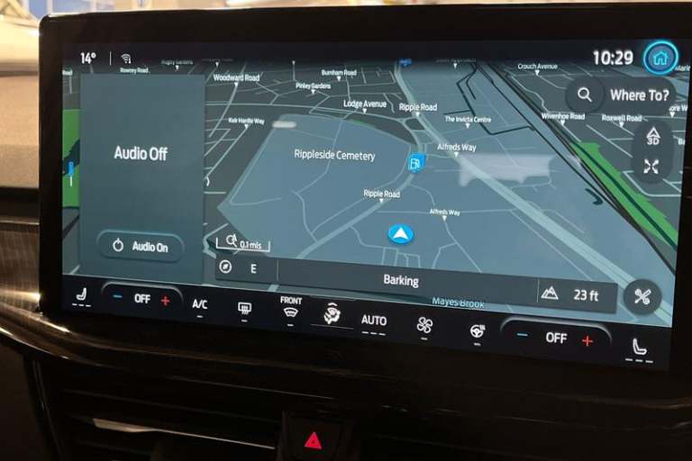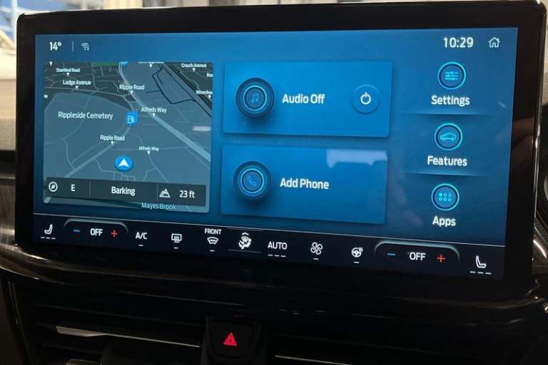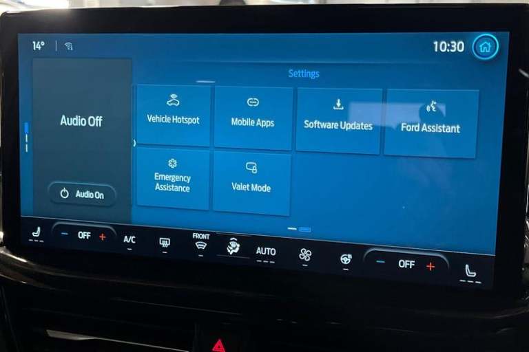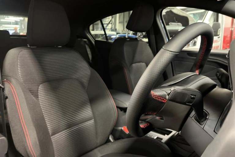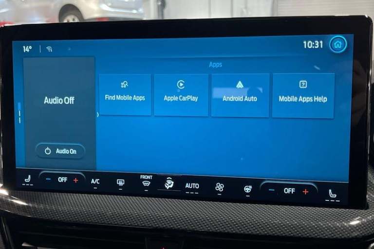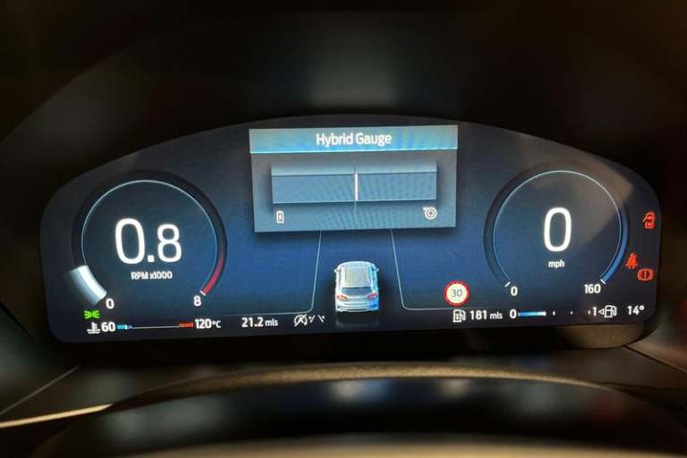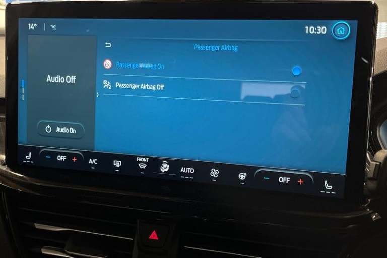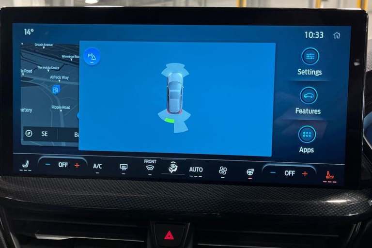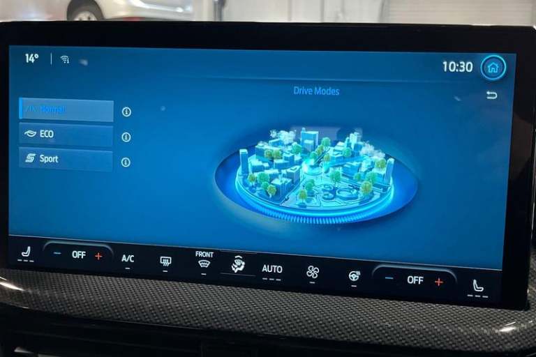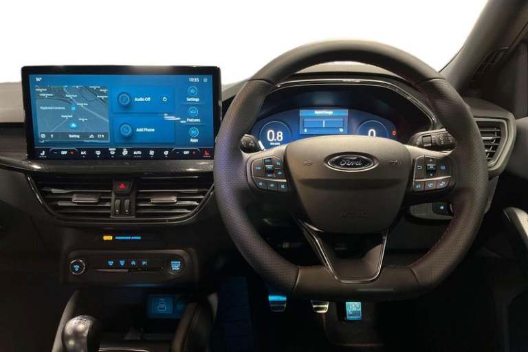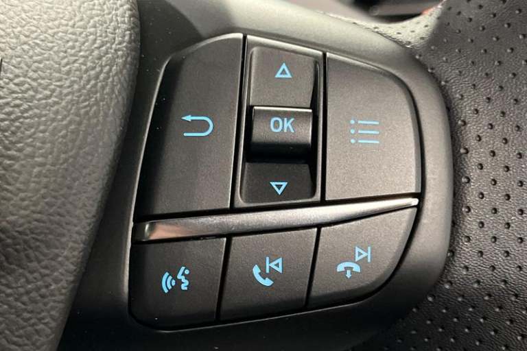 12.3 Digital instrument cluster, Bluetooth system, Digital clock, Easy fuel capless refuelling system, Eco mode, Ford SYNC4 Nav with 13.2'' touchscreen, DAB, Emergency Assistance, Apple Carplay & Android Auto, B&O Premium Audio with 10 speakers, FordPass Connect, Lane keeping system - lane keeping alert and lane keeping aid, PAS, Rev counter, Selectable drive mode, Service interval indicator, Trip computer, Wireless charging pad, Auto headlamps (on/off), Body coloured door handles, Electrically operated front and rear windows with one touch opening and closing, Electrically operated heated power fold door mirrors with puddle lamp with side indicators, Front variable intermittent wipers with electric wash, Heated rear window, LED daytime running lamp, LED rear lamps, LED third brake light, Polished twin tailpipe, Privacy glass, Quickclear heated windscreen, Rain sensor, Rear side wing doors, Tailgate wash/wipe, Unique ST-Line grille, full bodystyling kit, and large body coloured rear roof spoiler, 3 rear headrests, 3 seat bench in 2nd row, Dual zone electronic air temperature control, Full sensico premium upholstery, Height adjustable front headrests, Isofix child seat preparation, Load through ski hatch, Manual 2-way passenger seat adjust, Power 4-way driver seat adjust, with power lumbar adjust, Reach + rake adjustable steering column, Single front passenger seat, 3x3 point rear seatbelts, ABS+Electronic Brake force Distribution, Auto hold function, Driver airbag, EDL