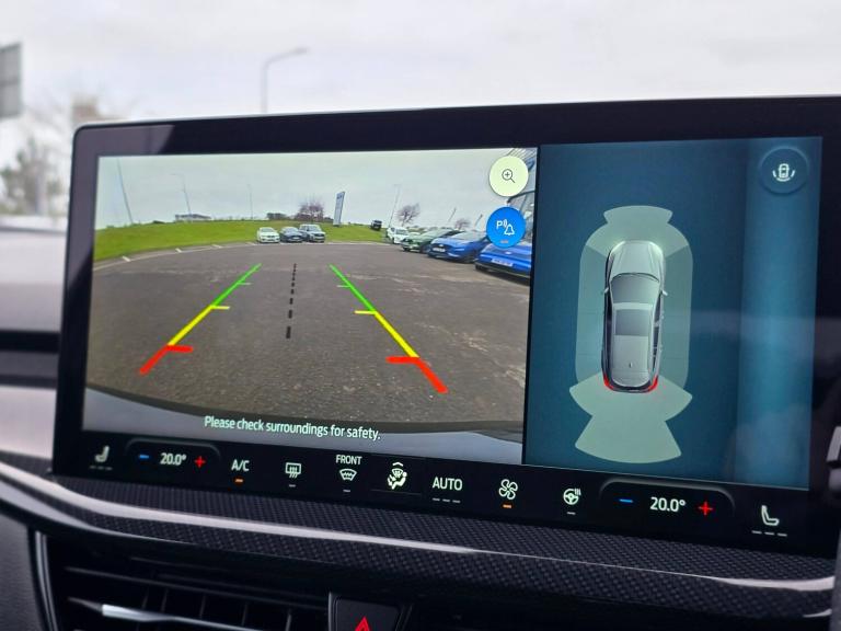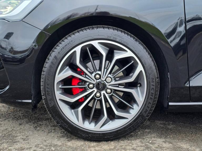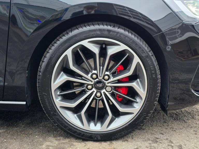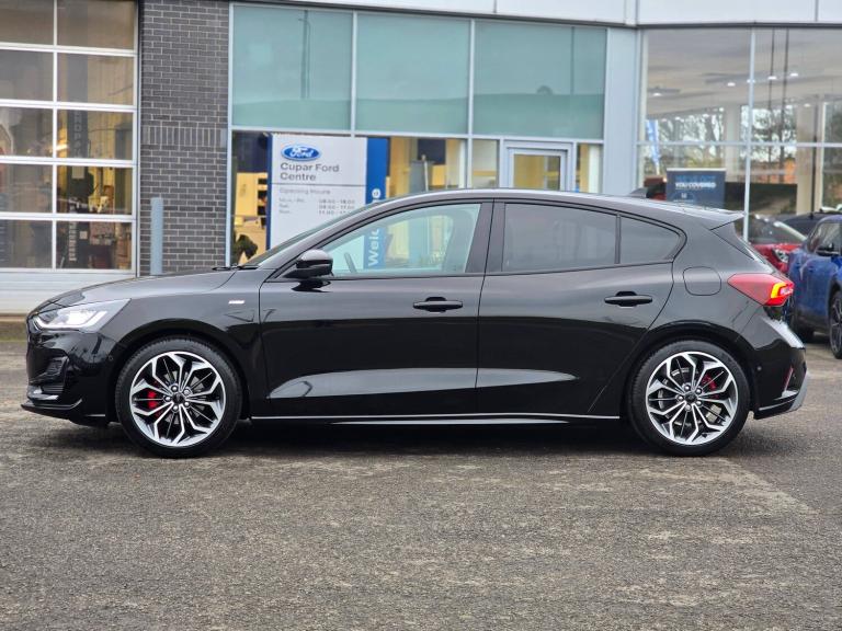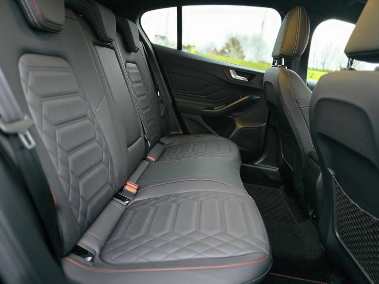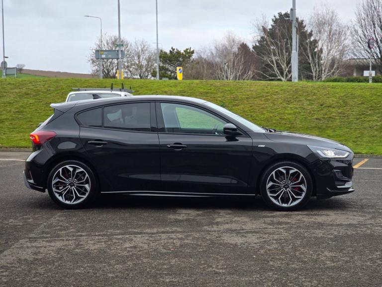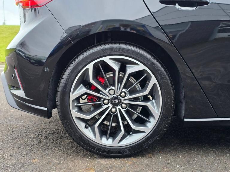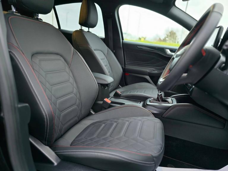 3x3 point rear seatbelts, ABS+Electronic Brake force Distribution, Auto hold function, Driver airbag, EDL traction control, Electronic parking brake, Electronic stability control, Front and rear seatbelt reminder, Front inertia reel height adjustable seatbelts with pre-tensioners, Front passenger airbag, Front side airbags, Passenger airbag deactivate switch, Post collision braking, Pre collision assist with autonomous emergency braking and pedestrian/cyclist detection, Remote/power child rear door locks, Side curtain airbags, Three rear inertia reel lap/diagonal seatbelts, Tyre pressure monitoring system, 12.3 inch Digital instrument cluster, Bluetooth system, Cruise control including adjustable speed limiter, Digital clock, Easy fuel capless refuelling system, Eco mode, Ford SYNC4 Nav with 13.2 inch touchscreen, DAB, Emergency Assistance, Apple Carplay and Android Auto, BandO Premium Audio with 10 speakers, FordPass Connect, Front and rear parking sensors, Lane keeping system - lane keeping alert and lane keeping aid, PAS, Rev counter, Selectable drive mode, Service interval indicator, Trip computer, Wireless charging pad, Auto headlamps (on/off), Body coloured door handles, Electrically operated front and rear windows with one touch opening and closing, Electrically operated heated power fold door mirrors with puddle lamp with side indicators, Front variable intermittent wipers with electric wash, Full fixed LED headlamps, Heated rear window, LED daytime running lamp, LED rear lamps, LED third brake light, Polished twin tailpipe, Privacy glass, Quickclear heated windscreen, Rain sensor, Rear side wing doors, Solid paint, Tailgate wash/wipe, Unique ST-Line grille, full bodystyling kit, and large body coloured rear roof spoiler, 3 rear headrests, 3 seat bench in 2nd row, Dual zone electronic air temperature control, Full sensico premium upholstery, Height adjustable front headrests, Isofix child seat preparation, Load through ski hatch, Manual 2-way passenger seat adjust, Power 4-way driver seat adjust, with power lumbar adjust, Reach + rake adjustable steering column, Single front passenger seat, ST-Line Design pack - Focus, Winter pack - Focus, Sports tuned suspension, Keyless entry and keyless start, MyKey system, Remote central locking and engine immobiliser, Thatcham alarm with power door dead locks, 2 USB ports, 18 inch 5x3 spoke pearl grey high gloss machined finish alloy wheels with mini spare wheel