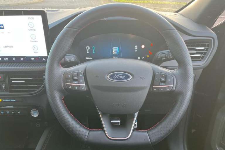 12.3 digital colour instrument cluster, 360 degree view camera, Clear exit assist, Cross traffic alert with active braking, e-Call (emergency call), Ford easy fuel, Ford SYNC 4 Navigation with 13 touchscreen, DAB radio, emergency assistance, Andriod Auto/Apple CarPlay, 5G modem & Ford Pass connect, Front and rear parking sensors, Hands free power tailgate, Lane centering assist, Lane keeping aid with lane departure warning, Power assist steering, Selectable drive modes, Service interval indicator, Auto headlamps with high and low beam, Black roof rails, Body colour bumpers, Front LED fog lamps, Large rear spoiler, LED daytime running lights, LED rear lights, LED third brake light, Pop out door edge protectors, Power front/rear windows with global close, Power heated folding door mirrors with puddle lights, memory function and camera, Power opening panoramic roof, Quickclear heated windscreen, Rain sensing wipers, Rear privacy glass, Rear side wing doors, Rear wiper, ST-Line body styling kit, 2nd row sliding seats, Electronic automatic temperature control (EATC), Front and rear head restraints, Partial premium touch sensico upholstery, Rear centre head restraint, Single front passenger seat, Sports seats, 3x3 point rear seatbelts, Airbags - front driver/passenger, front and rear curtain, Drivers knee airbag, Dynamic brake support, Electronic stability control (ESC) and ABS, Evasive steering assist, Ford MyKey Gen 2 safety system, Manual child proof rear door locks, Pre