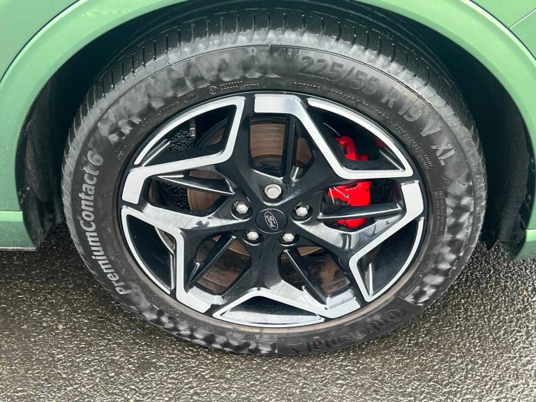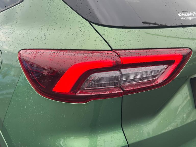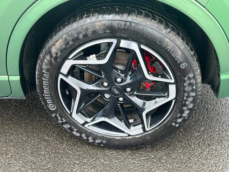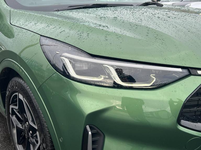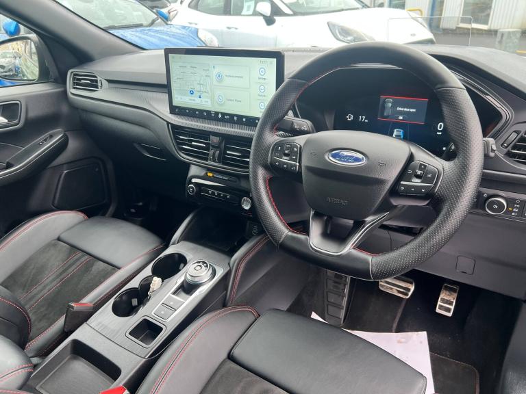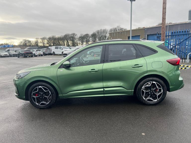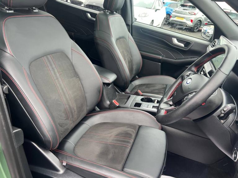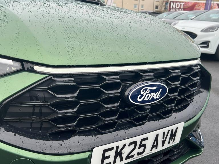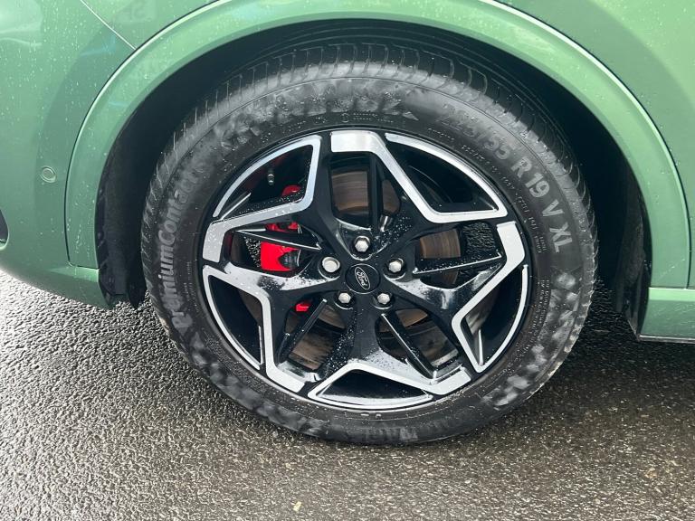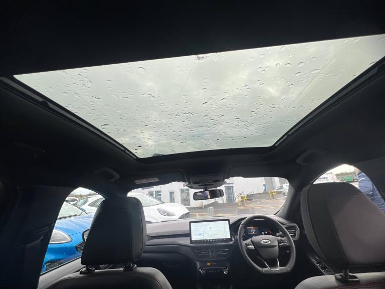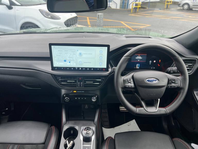 3x3 point rear seatbelts, Airbags - front driver/passenger, front and rear curtain, Drivers knee airbag, Dynamic brake support, Electronic stability control (ESC) and ABS, Evasive steering assist, Ford MyKey Gen 2 safety system, Manual child proof rear door locks, Pre collision assist with autonomous emergency braking, Rear seat Occupancy alert, Red brake calipers, Tyre pressure monitoring system, 12.3 inch digital colour instrument cluster, 360 degree view camera, Clear exit assist, Cross traffic alert with active braking, e-Call (emergency call), Ford easy fuel, Ford SYNC 4 Navigation with 13 inch touchscreen, DAB radio, emergency assistance, Andriod Auto/Apple CarPlay, 5G modem and Ford Pass connect, Front and rear parking sensors, Hands free power tailgate, Lane centering assist, Lane keeping aid with lane departure warning, Power assist steering, Selectable drive modes, Service interval indicator, Auto headlamps with high and low beam, Black roof rails, Body colour bumpers, Front LED fog lamps, Full LED headlamps, Large rear spoiler, LED daytime running lights, LED rear lights, LED third brake light, Pop out door edge protectors, Power front/rear windows with global close, Power heated folding door mirrors with puddle lights, memory function and camera, Power opening panoramic roof, Quickclear heated windscreen, Rain sensing wipers, Rear privacy glass, Rear side wing doors, Rear wiper, Solid paint, ST-Line body styling kit, 10 way power adjust driver seat, 2nd row sliding seats, 8 way manual passenger seat including lumbar support and height adjust, Driver seat memory function, Electronic automatic temperature control (EATC), Front and rear head restraints, Partial premium touch sensico upholstery, Rear centre head restraint, Single front passenger seat, Sports seats, Driver assistance pack - Kuga Auto, Winter pack - Kuga, Sports suspension, Engine immobiliser, Keyless entry and Ford power start button (Keyless start), Locking wheel nuts, Remote powered central double locking doors, Thatcham category 1 alarm, High performance (700W) BandO premium audio system with enhanced sound tuning, 10 speakers including upgraded door speakers, subwoofer and 2 USB ports, 19 inch ST-Line alloy wheel with an ebony black and machined finish, Tyre inflation kit