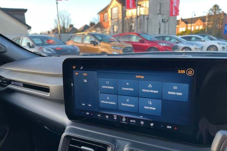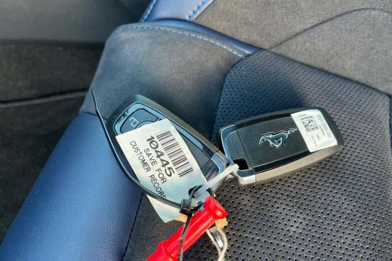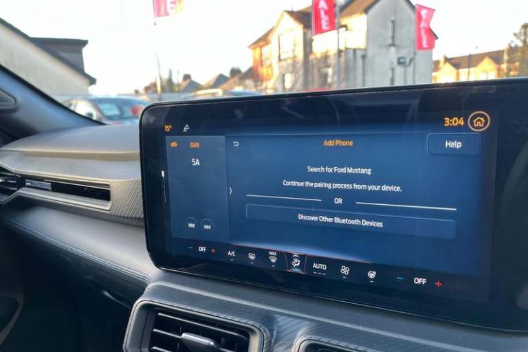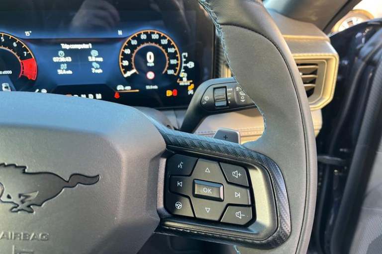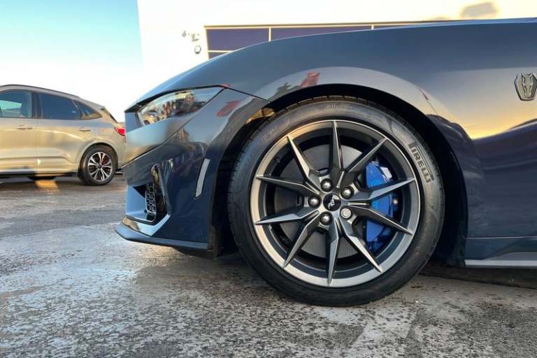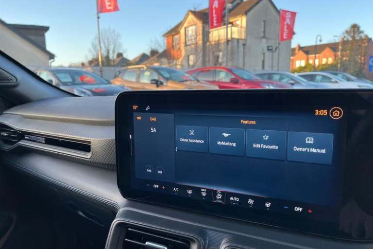 12 digital LCD instrument cluster, Adaptive cruise control with adjustable speed limiter, Apple car play/Android Auto, Bluetooth connectivity with voice control, Electric power steering, Emergency services call system, Ford pass connect embedded modem, Fully customisable 13.2 Touchscreen with wireless smartphone integration, FordPass connect & connected navigation, Lane keeping aid with lane keeping assist, Oil pressure gauge, Rear view camera with rear parking sensors, Selectable driving modes - normal, mymode, snow/wet, sport+, track and drag mode, Service interval indicator, SYNC Emergency Assistance, Track apps with accelerometer technology, Trip computer, Wireless charging and USB charging port, 3rd brake light, Active exhaust system with quad tailpipes, Auto dimming rear view mirror, Auto high beam, Automatic headlights, Automatic rain sensing wipers, Body colour bumpers, Body colour door mirrors, Bonnet air intake, Dark Horse front grille with dark pony badge, Dark Horse extrior badging and quad tailpipes in black, Dark Horse specific bodykit with exclusive aerodynamic enhancements, Dark Triple-LED headlamps with welcome / farewell animation, Electric front windows, LED daytime running lights, LED rear lights with sequential indicators and welcome / farewell animations, Power-folding door mirrors including blind spot informaion system and mustang logo projection puddle lamps, Rear boot, 6 way power adjustable front seats, Ambient lighting, Cup holders, Electronic