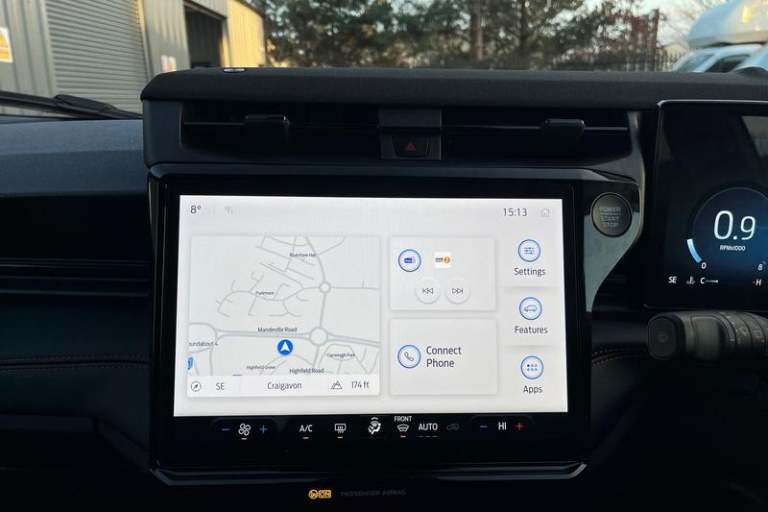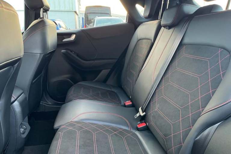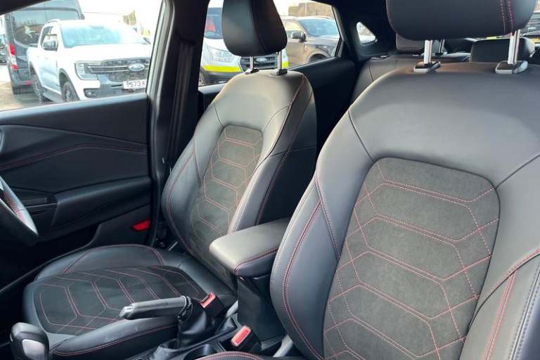 Driver impairment monitor, Emergency call service, Ford easy fuel, Full digital 12.8 instrument cluster, Lane keeping aid with lane departure warning, Power assist steering, Selectable drive modes(Normal, Eco, Sport, Slippery and Trail), Speed sign recognition, Automatic headlights with rain sensing wipers and auto high beam, Front fog lamps, LED daytime running lights, LED rear lamps, LED third brake light, Power foldable heated door mirrors with puddle lamps and puma logo protection, Quickclear heated windscreen, Rear privacy glass, Rear side wing doors, Rear wiper, ST-Line X body styling kit, 3 seat bench in 2nd row, 4 way lumbar support for passenger seat, Centre console with armrest and stowage, Electronic automatic temperature control (EATC), Ford megabox extended bootspace, Front and rear head restraints, Front floor mats, Manual 4 way driver seat adjust with lumbar adjustment, Single front passenger seat, ST-Line X Premium synthetic leather upholstery, 3 rear seatbelts, Child safety lock, Electronic stability control (ESC) and hill start assist, Pre-collision assist with autonomous emergency braking, pedestrian/cyclist detection & post-collision braking, Tyre pressure monitoring system (TPMS)