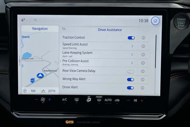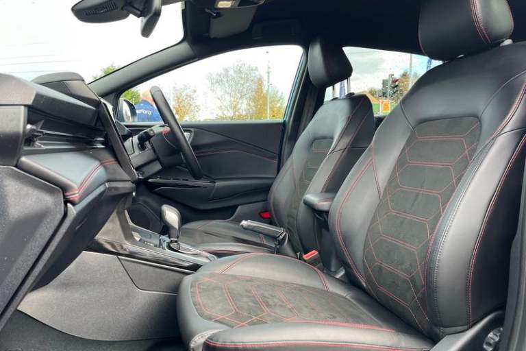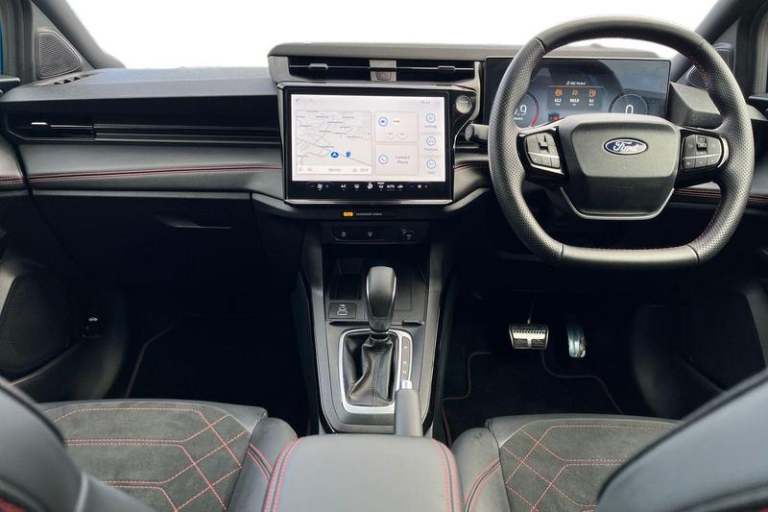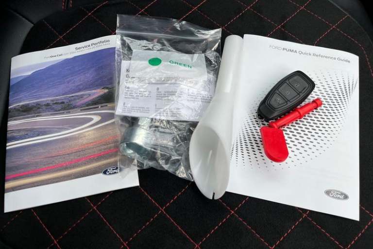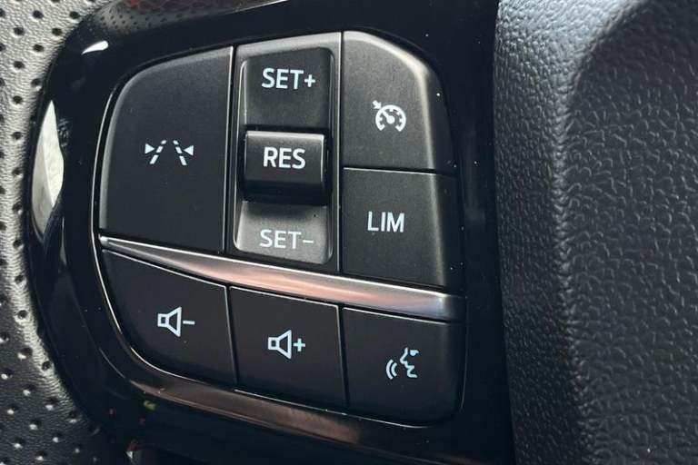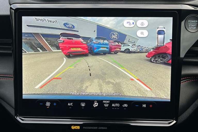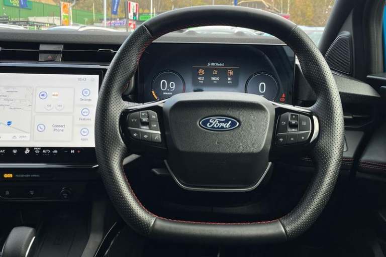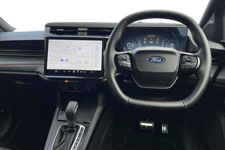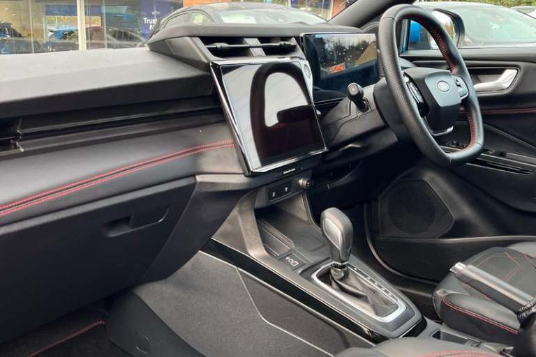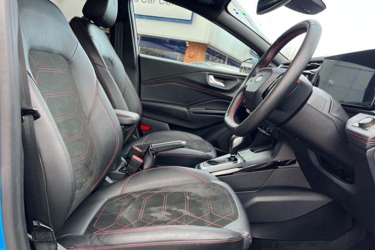 Driver impairment monitor, Emergency call service, Ford easy fuel, Full digital 12.8 instrument cluster, Lane keeping aid with lane departure warning, Power assist steering, Selectable drive modes(Normal, Eco, Sport, Slippery and Trail), Speed sign recognition, Automatic headlights with rain sensing wipers and auto high beam, Front fog lamps, LED daytime running lights, LED rear lamps, LED third brake light, Power foldable heated door mirrors with puddle lamps and puma logo protection, Quickclear heated windscreen, Rear privacy glass, Rear side wing doors, Rear wiper, ST-Line X body styling kit, 3 seat bench in 2nd row, 4 way lumbar support for passenger seat, Centre console with armrest and stowage, Electronic automatic temperature control (EATC), Ford megabox extended bootspace, Front and rear head restraints, Front floor mats, Manual 4 way driver seat adjust with lumbar adjustment, Single front passenger seat, ST-Line X Premium synthetic leather upholstery, 3 rear seatbelts, Child safety lock, Electronic stability control (ESC) and hill start assist, Pre-collision assist with autonomous emergency braking, pedestrian/cyclist detection & post-collision braking, Tyre pressure monitoring system (TPMS)