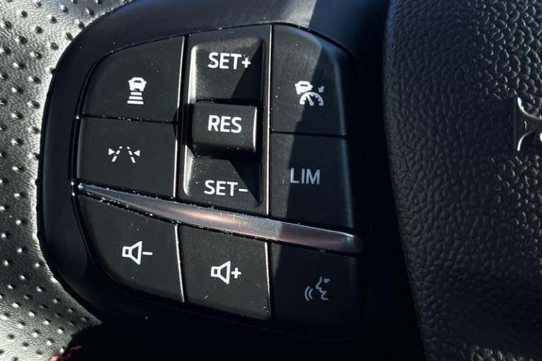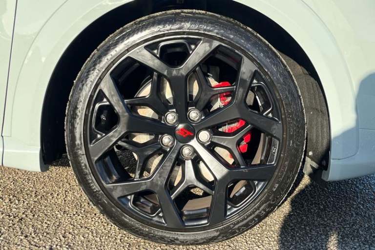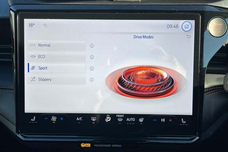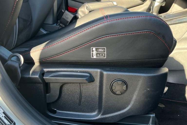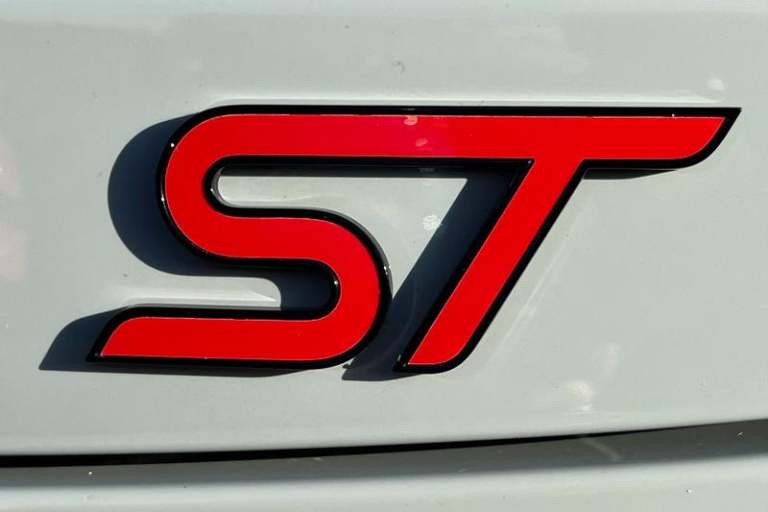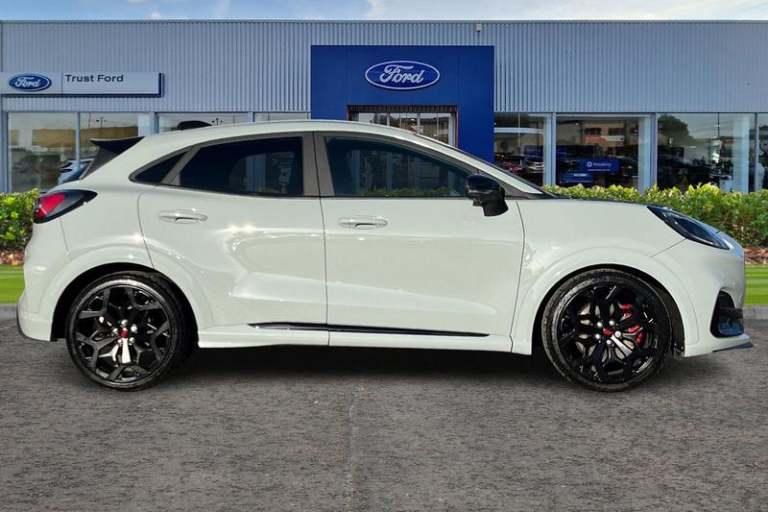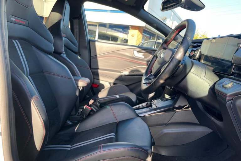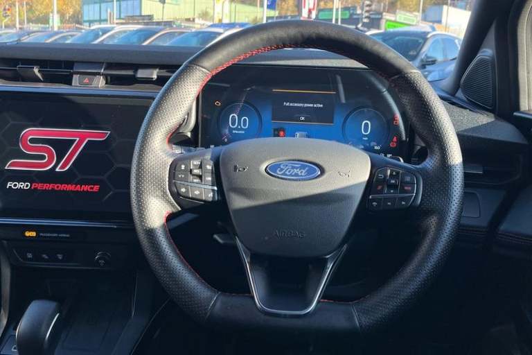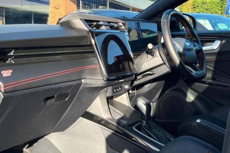 Driver impairment monitor, Emergency call service, Ford easy fuel, Full digital 12.8 instrument cluster, Lane keeping aid with lane departure warning, Power assist steering, Power lift tailgate, Selectable drive modes (normal, sport, eco, track), Speed sign recognition, Automatic headlights with rain sensing wipers and auto high beam, Front fog lamps, Glare-free matrix LED headlamps, Large rear roof spoiler, LED daytime running lights, LED rear lamps, LED third brake light, Power foldable heated door mirrors with puddle lamps and puma logo protection, Quickclear heated windscreen, Rear privacy glass, Rear side wing doors, Rear wiper, Unique ST body styling kit including wing mirrors and Ford Performance embossed splitter, 3 seat bench in 2nd row, Centre console with armrest and stowage, Electronic automatic temperature control (EATC), Ford megabox extended bootspace, Ford Performance seats premium synthetic leather upholstery, Front and rear head restraints, Front floor mats, Manual 6 way driver seat adjust with lumbar adjustment, Manual 6 way passenger seat with lumbar seat adjustment, Single front passenger seat, 3 rear seatbelts, Child safety lock, Electronic stability control (ESC) and hill start assist, Pre-collision assist with autonomous emergency braking, pedestrian/cyclist detection & post-collision braking, Red brake calipers, Tyre pressure monitoring system (TPMS)