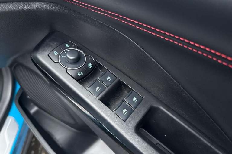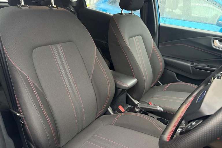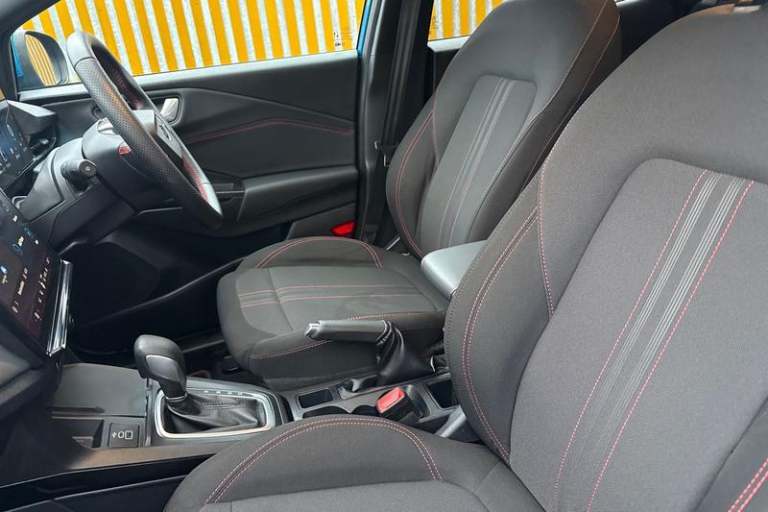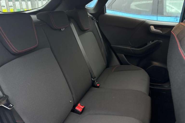 Driver impairment monitor, Emergency call service, Ford easy fuel, Full digital 12.8 instrument cluster, Lane keeping aid with lane departure warning, Power assist steering, Selectable drive modes(Normal, Eco, Sport, Slippery and Trail), Speed sign recognition, Automatic headlights with rain sensing wipers and auto high beam, Front fog lamps, LED daytime running lights, LED rear lamps, LED third brake light, Power foldable heated door mirrors with puddle lamps and puma logo protection, Quickclear heated windscreen, Rear privacy glass, Rear side wing doors, Rear wiper, ST-Line body styling kit with unique grille, 3 seat bench in 2nd row, Centre console with armrest and stowage, Electronic automatic temperature control (EATC), Ford megabox extended bootspace, Front and rear head restraints, Front floor mats, Manual 4 way driver seat adjust with lumbar adjustment, Single front passenger seat, ST- Line cloth trim with red stitching, 3 rear seatbelts, Child safety lock, Electronic stability control (ESC) and hill start assist, Pre-collision assist with autonomous emergency braking, pedestrian/cyclist detection & post-collision braking, Tyre pressure monitoring system (TPMS)