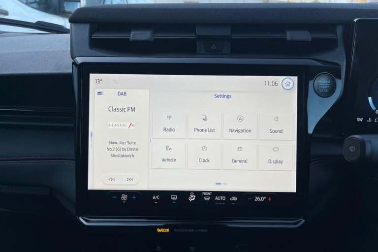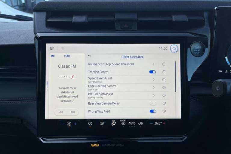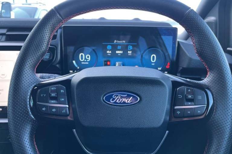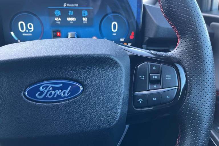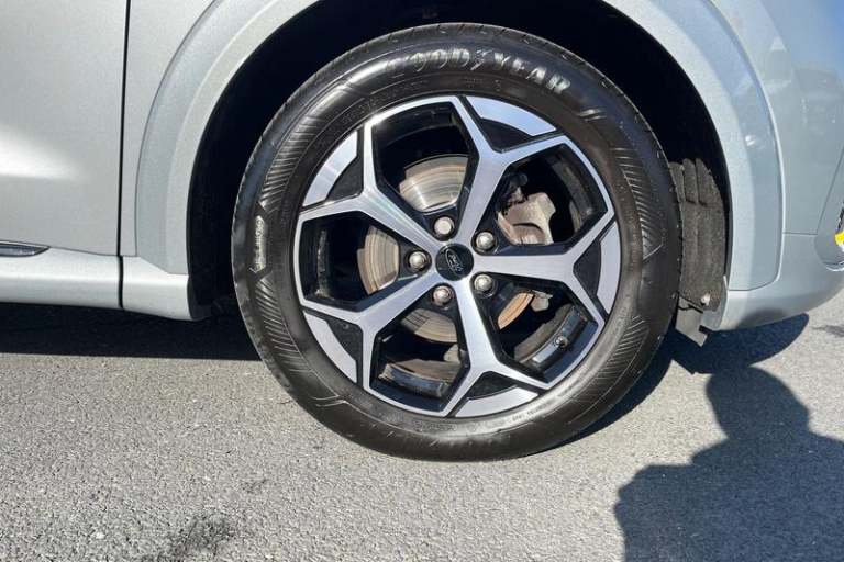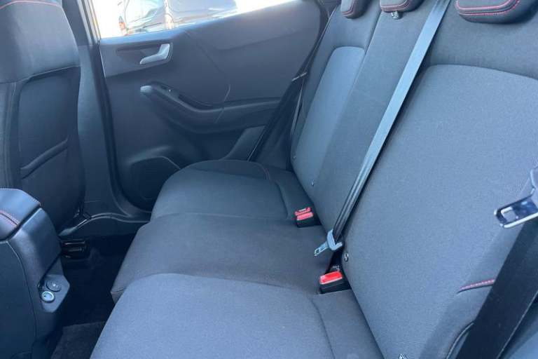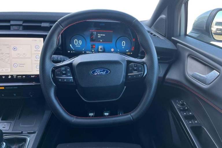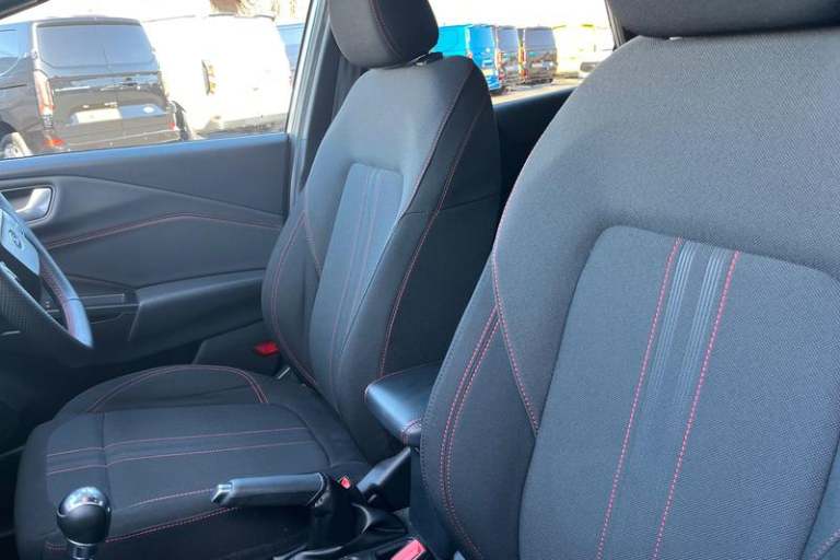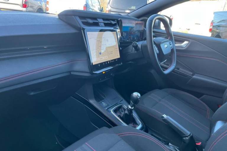 Driver alert system, Emergency call service, Ford easy fuel, Full digital 12.8 instrument cluster, Lane keeping aid, Power assist steering, Selectable drive modes(Normal, Eco, Sport, Slippery and Trail), Speed sign recognition, Automatic headlights with rain sensing wipers and auto high beam, Front fog lamps, LED daytime running lights, LED rear lamps, LED third brake light, Power foldable heated door mirrors with puddle lamps and puma logo protection, Quickclear heated windscreen, Rear privacy glass, Rear side wing doors, Rear wiper, ST-Line body styling kit with unique grille, 3 seat bench in 2nd row, Centre console with armrest and stowage, Electronic automatic temperature control (EATC), Ford megabox extended bootspace, Front and rear head restraints, Front floor mats, Manual 4 way driver seat adjust with lumbar adjustment, Single front passenger seat, ST- Line cloth trim with red stitching, 3 rear seatbelts, Child safety lock, Electronic stability control (ESC) and hill start assist, Pre-collision assist with autonomous emergency braking, pedestrian/cyclist detection & post-collision braking, Tyre pressure monitoring system (TPMS)