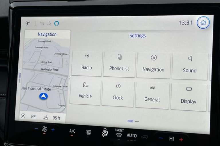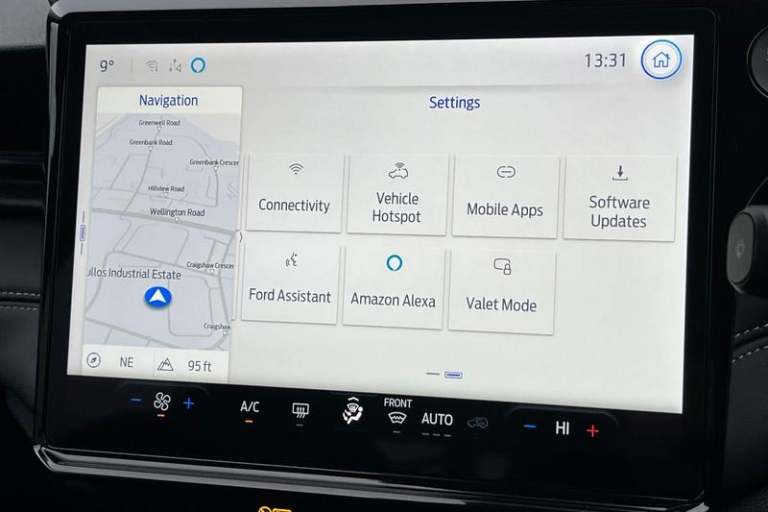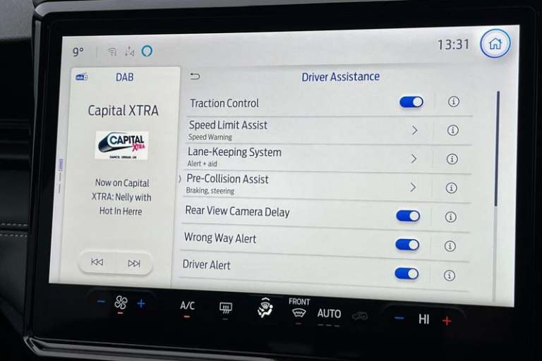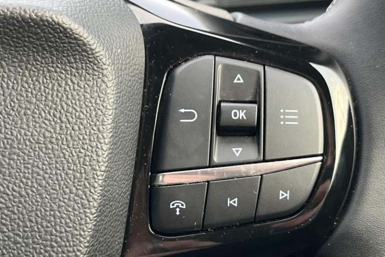 Driver impairment monitor, Emergency call service, Ford easy fuel, Full digital 12.8 instrument cluster, Lane keeping aid with lane departure warning, Power assist steering, Selectable drive modes(Normal, Eco, Sport, Slippery and Trail), Speed sign recognition, Automatic headlights with rain sensing wipers and auto high beam, Front fog lamps, LED daytime running lights, LED rear lamps, LED third brake light, Quickclear heated windscreen, Rear privacy glass, Rear side wing doors, Rear wiper, Titanium body styling kit, 3 seat bench in 2nd row, Centre console with armrest and stowage, Electronic automatic temperature control (EATC), Ford megabox extended bootspace, Front and rear head restraints, Front floor mats, Manual 4 way driver seat adjust with lumbar adjustment, Single front passenger seat, Titanium cloth upholstery, 3 rear seatbelts, Child safety lock, Electronic stability control (ESC) and hill start assist, Pre-collision assist with autonomous emergency braking, pedestrian/cyclist detection & post-collision braking, Tyre pressure monitoring system (TPMS)
