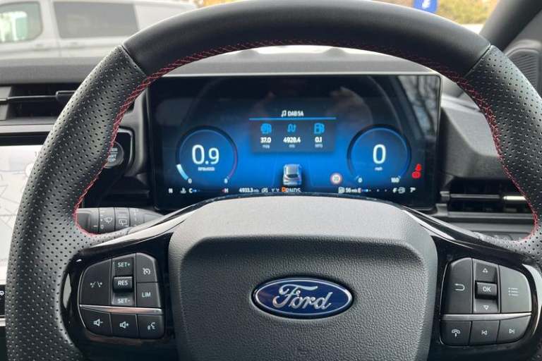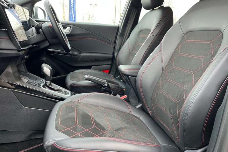 Driver impairment monitor, Emergency call service, Ford easy fuel, Full digital 12.8 instrument cluster, Lane keeping aid with lane departure warning, Power assist steering, Selectable drive modes(Normal, Eco, Sport, Slippery and Trail), Speed sign recognition, Automatic headlights with rain sensing wipers and auto high beam, Front fog lamps, LED daytime running lights, LED rear lamps, LED third brake light, Power foldable heated door mirrors with puddle lamps and puma logo protection, Quickclear heated windscreen, Rear privacy glass, Rear side wing doors, Rear wiper, ST-Line X body styling kit, 3 seat bench in 2nd row, 4 way lumbar support for passenger seat, Centre console with armrest and stowage, Electronic automatic temperature control (EATC), Ford megabox extended bootspace, Front and rear head restraints, Front floor mats, Manual 4 way driver seat adjust with lumbar adjustment, Single front passenger seat, ST-Line X Premium synthetic leather upholstery, 3 rear seatbelts, Child safety lock, Electronic stability control (ESC) and hill start assist, Pre-collision assist with autonomous emergency braking, pedestrian/cyclist detection & post-collision braking, Tyre pressure monitoring system (TPMS)