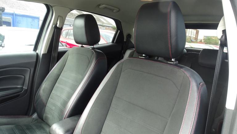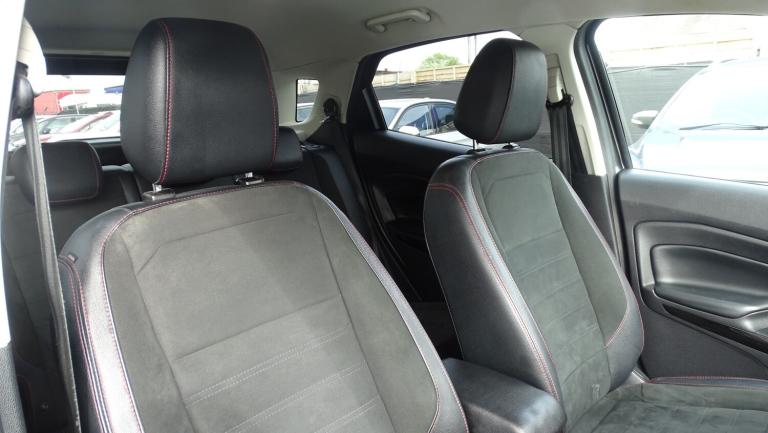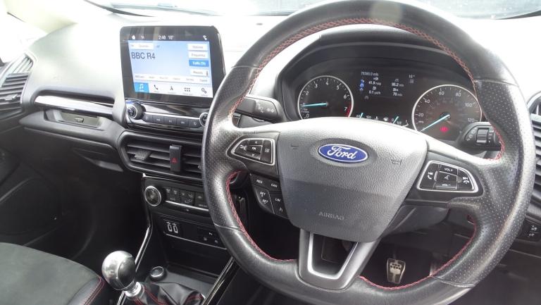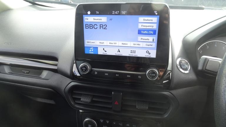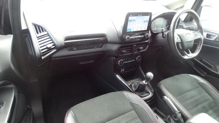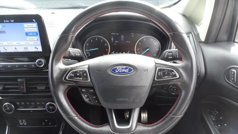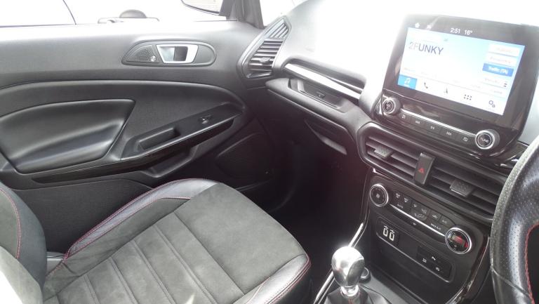 This 2018 Ford EcoSport T ST-Line offers excellent peace of mind with its MOT valid until August 2026. This stylish compact SUV is equipped with a 1.0L petrol engine and meets Euro 6 emissions standards. Inside, you'll find the convenient Ford Navigation System featuring Ford SYNC 3, which seamlessly integrates with Apple CarPlay and Android Auto, allowing for easy access to your smartphone apps. For added confidence when parking, it includes a rear view camera and rear parking sensors. The ST-Line trim is further enhanced by sporty ST-Line bumpers and side skirts, and practical halogen headlamps with LED day running lights. The rear seats offer versatility with a 60-40 split fold and tumble function. Experience impressive fuel economy with this Ford EcoSport, achieving up to 53 miles per gallon, which indicates it is more economical than many similar vehicles. Its low CO2 emissions also contribute to a more environmentally conscious drive. This combination of efficiency, technology, and sporty styling makes the 2018 Ford EcoSport T ST-Line a compelling choice for those seeking a capable and well equipped compact SUV.