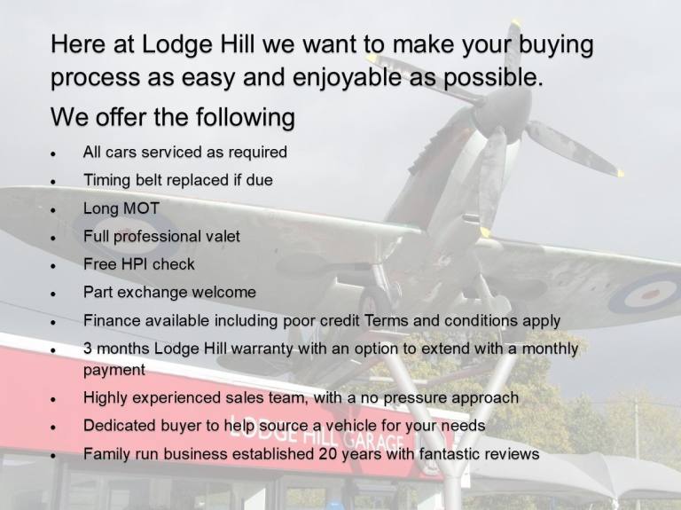 Every car is sold is fully prepared in our own workshop and backed by a 3 Months Lodge Hill Garage warranty.