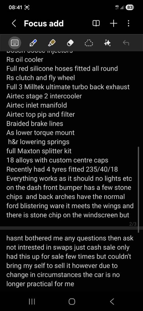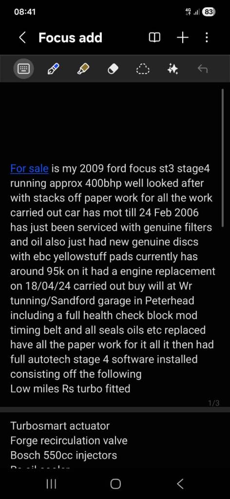 For sale is my ford focus st3 running stage 4 software with supporting hardware estimated to be around 400bhp well looked after loads off paper work for all work that has been carried out inc block mod etc regularly serviced full spec can be found in the last few pics only bad point is the windscreen has crack on the drives side any questions just ask cash sale only texts and emails are best due to work or calls after 6pm preferably no more time waster or low ball offers