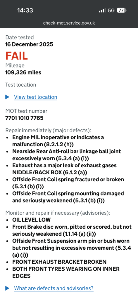 2010 Ford Focus Zetec S. 1.6 litre petrol, 5 door, manual, push start/stop, 109,400 miles, 3 keys, rear privacy glass. Part service history, 5 previous owners. FAILED MOT on the 16/12/25.