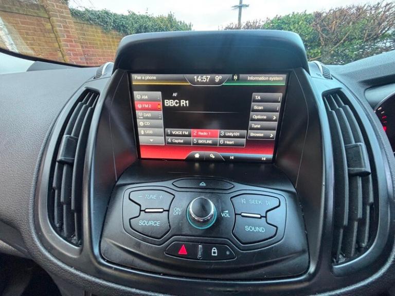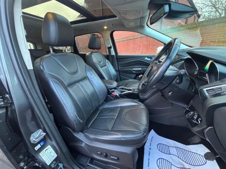 Not only is this a really nice car with excellent specification, she really does drive and handle tremendously well. Just through the door now I will explain the super spec shortly but first, the important bit to me WE HAVE JUST FULLY SERVICED AND REPLACED THE ALL IMPORTANT TIMING BELT KIT AND WATER PUMP.. That is not all. Two new tyres, replaced the front brakes then discovered the flywheel was a bit chattery, so we put a new three piece clutch and dual mass flywheel in her. Good for another 89k I would say. I want these cars to be right when we sell them to you. We dont scrimp on prep, I want you to buy all your cars from me not just one, I want you and the family to keep coming back, not with a problem you understand, but with your repeat business. So I try my best to make them super right before you get them. This Kuga is a two owner car with a pretty much full stamped history including the big service we have just done. She has two keys and will come to you with a 12 month MOT (UPDATE NOW DONE WITH NO ADVISORIES) and 6 months warranty as standard. Yes we take part exchange and arrange finance. Spec. Brilliant. 18 inch alloys, privacy glass, parking sensors, inside we have half black leather trim, big screen info system with sync 3 for music and phone connectivity. Bluetooth, she has a oanoramic roof which is an excellent addition I always love. And heated seats. Cruise control, climate control, steering wheel audio controls usb and aux etc etc More stuff I have probably not mentioned or even found yet. Cracking car m, this is the two wheel drive variant, she is only £165 annual tax. ULEZ 6 emissions too. Yes we take part exchange and yes we arrange finance.