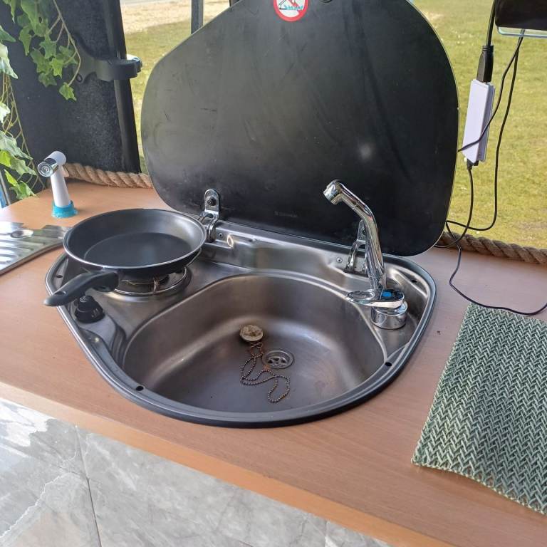 • gas burner,with full bottle of gas. sink, portable toilet with privacy tent, and shower setup.