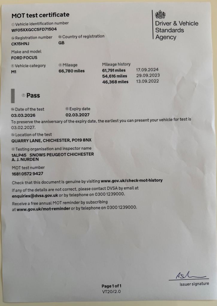 Full Clean 12 month MOT till 03/03/2027 with No Advisories.