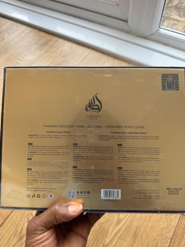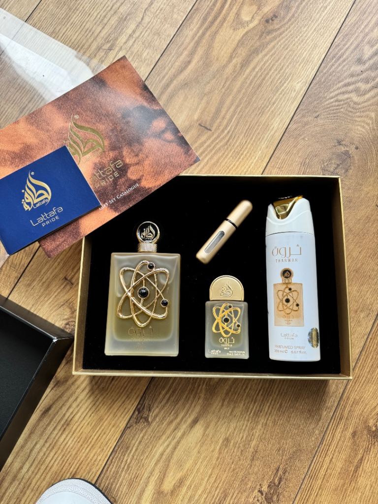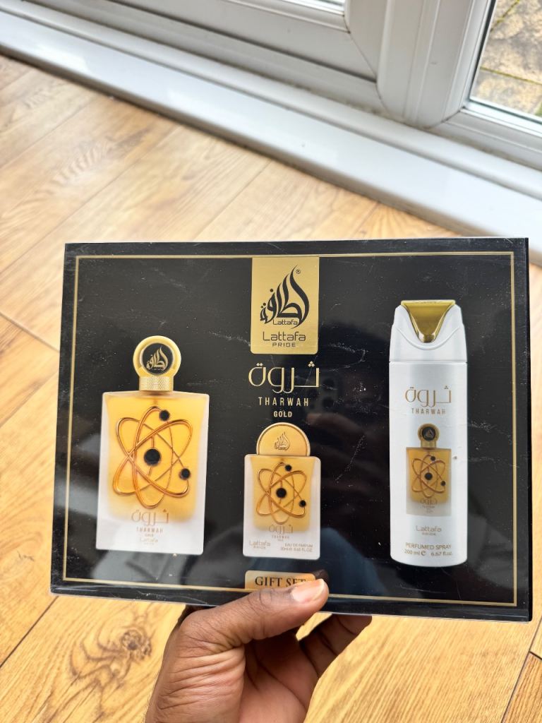Posting for under a monthLattafa Tharwah Gold 3Pc Perfume Gift Set for Women & Men EDP 100ml, 20ml Mini, 200ml Deodorant