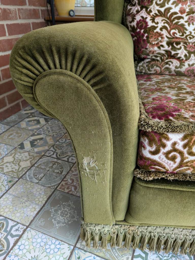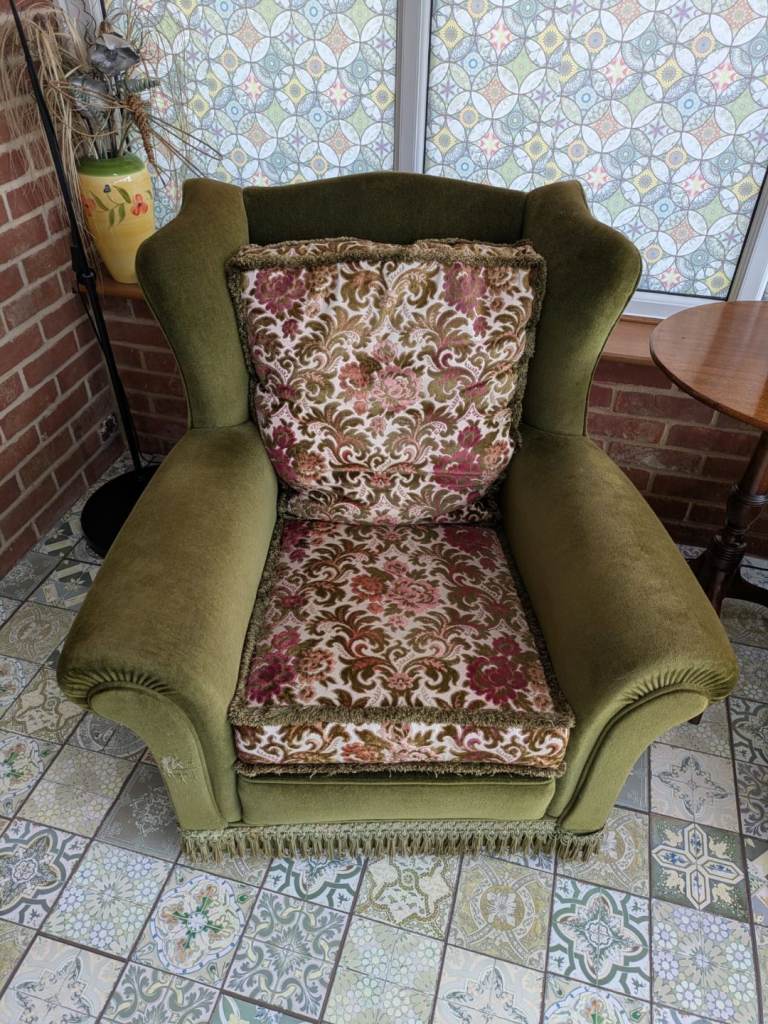 2 green/patterned armchairs with feather filled seat and back cushions. Male and female set. Slight sun damage and cat scratched patch, as shown in picture.
