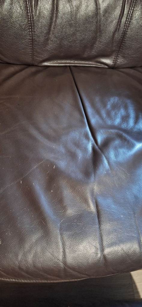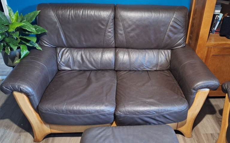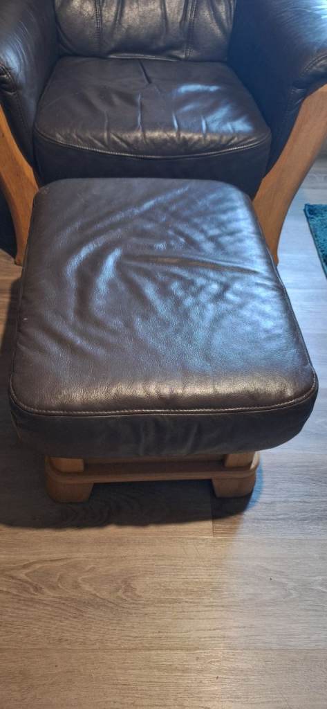 Real leather and oak 2 seater sofa, Armchair and footstool. Has some small surface level scratches as shown but is otherwise in good condition.