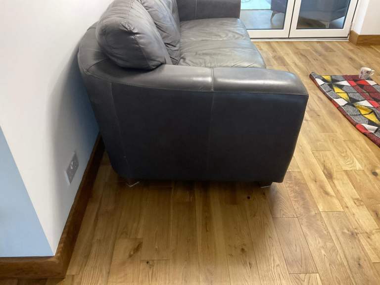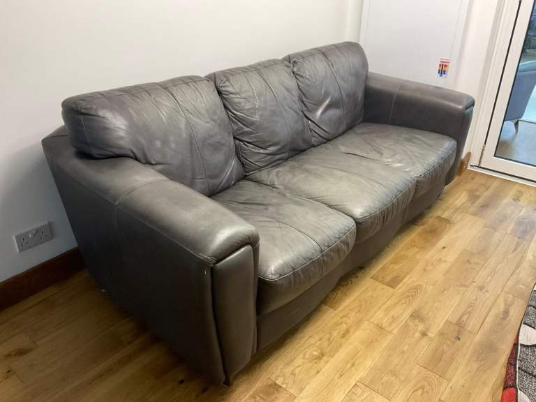 A grey leather sofa, approx. 215cm (w) by 102cm (d) by 88cm (h), used and very comfy. surplus to requirements following lounge make-over. Collection only.