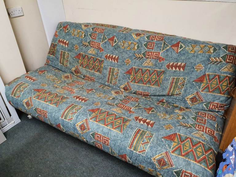 Bed Settee studio couch, folds into double sorung bed, two postion upright pisitions, under seat storage. Good condition. Size 78 cm high x 190 cm long x 104 deep. Does come apart into two parts.