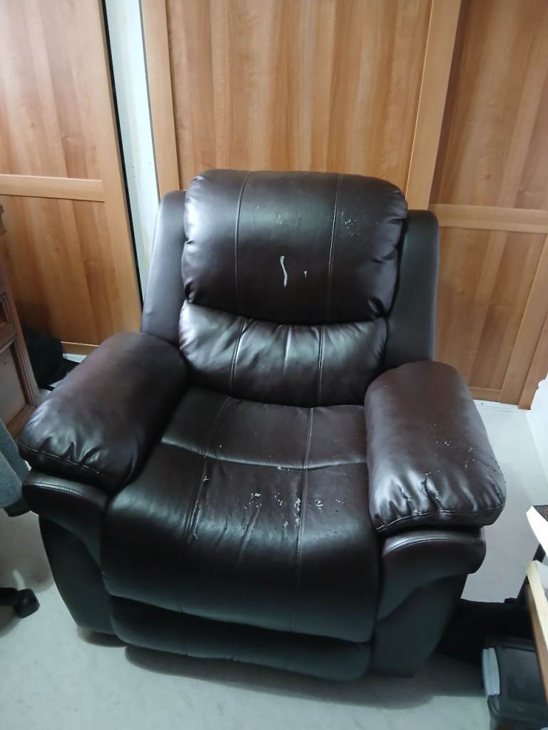 Dark Brown recliner chair . Other than the scratches shown in the photos the chair is in decent condition. There are no other marks or scratches . It reclines perfectly using a lever on left side of chair.